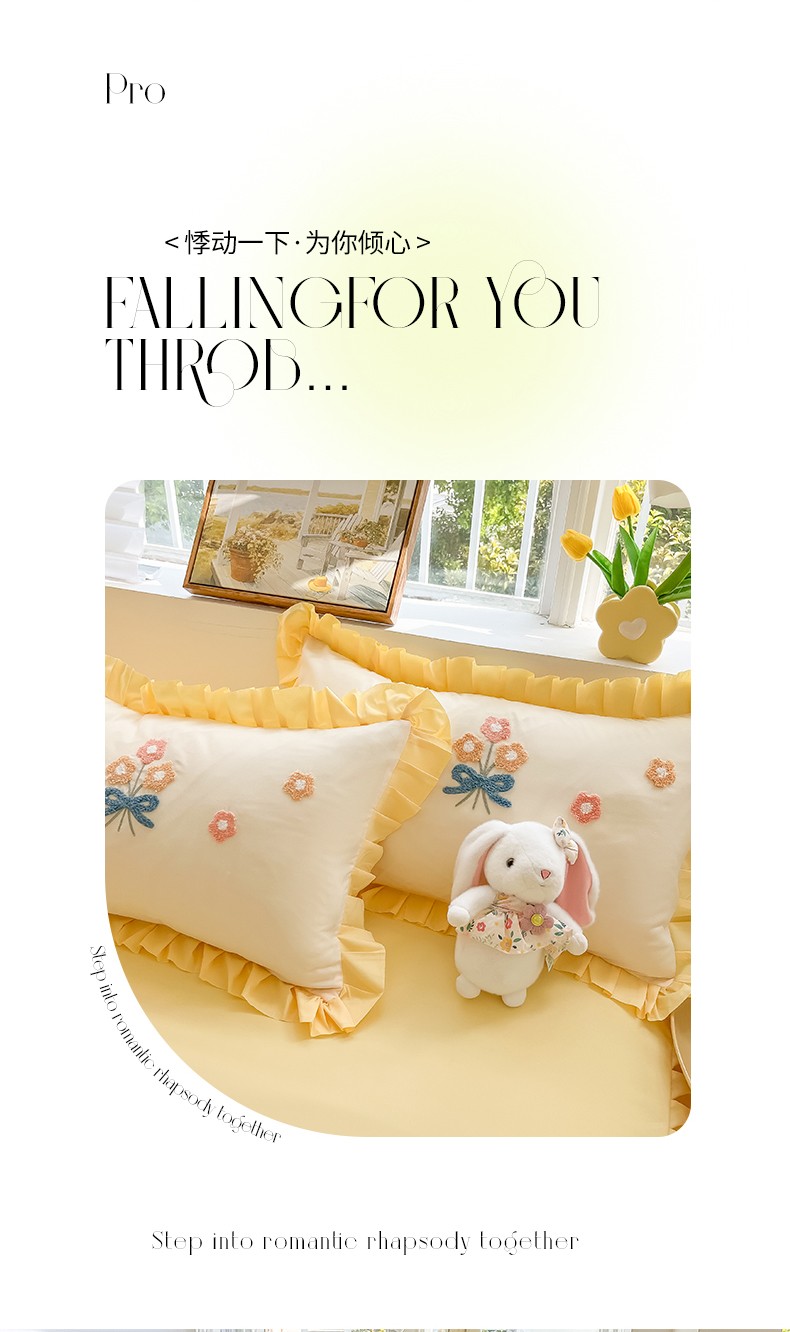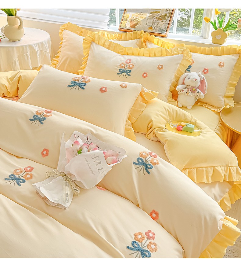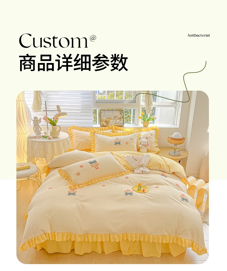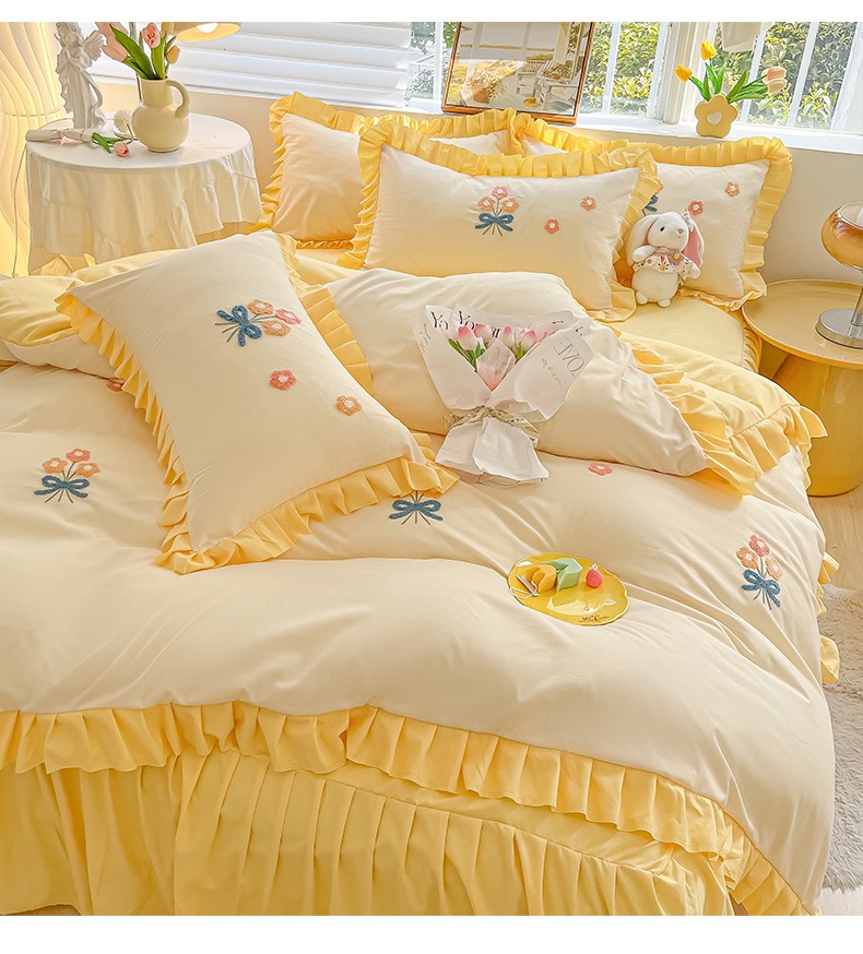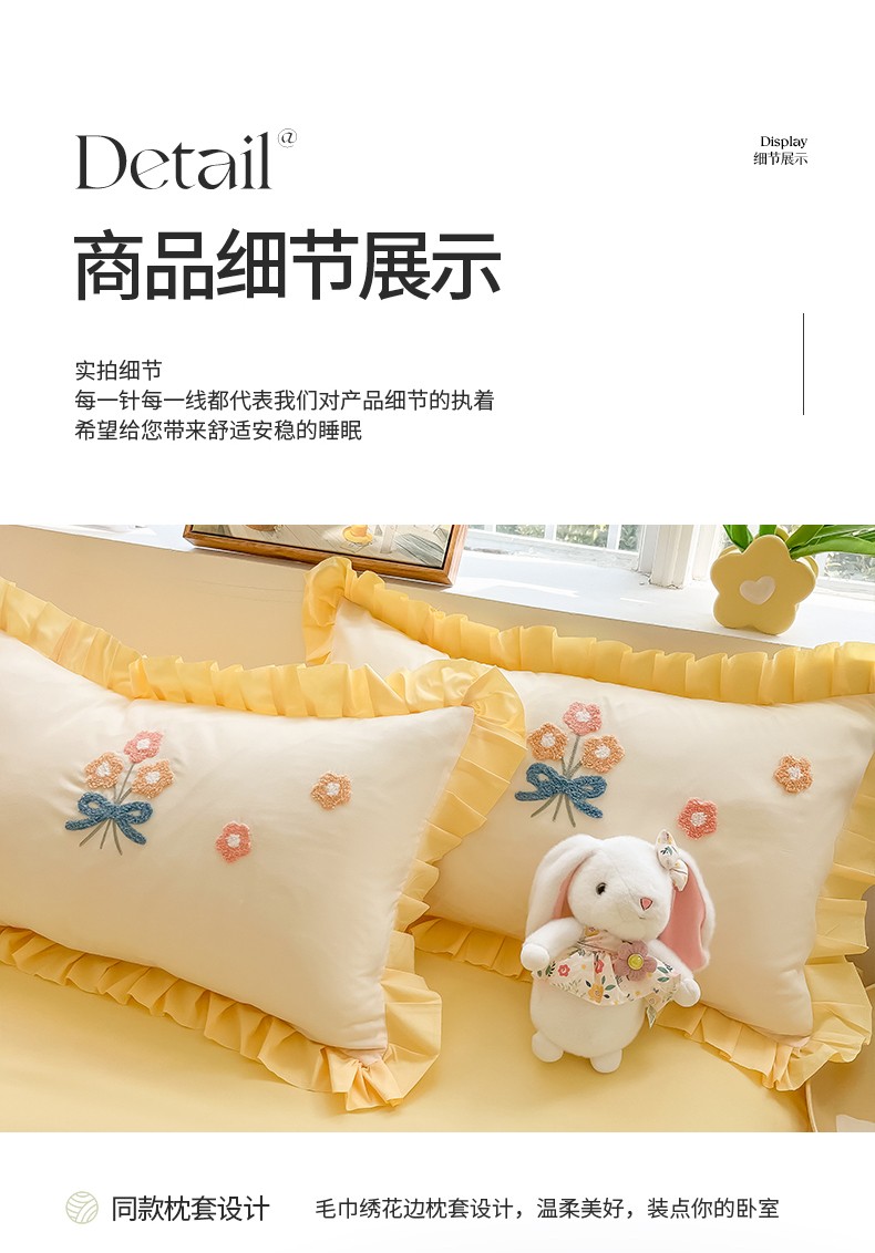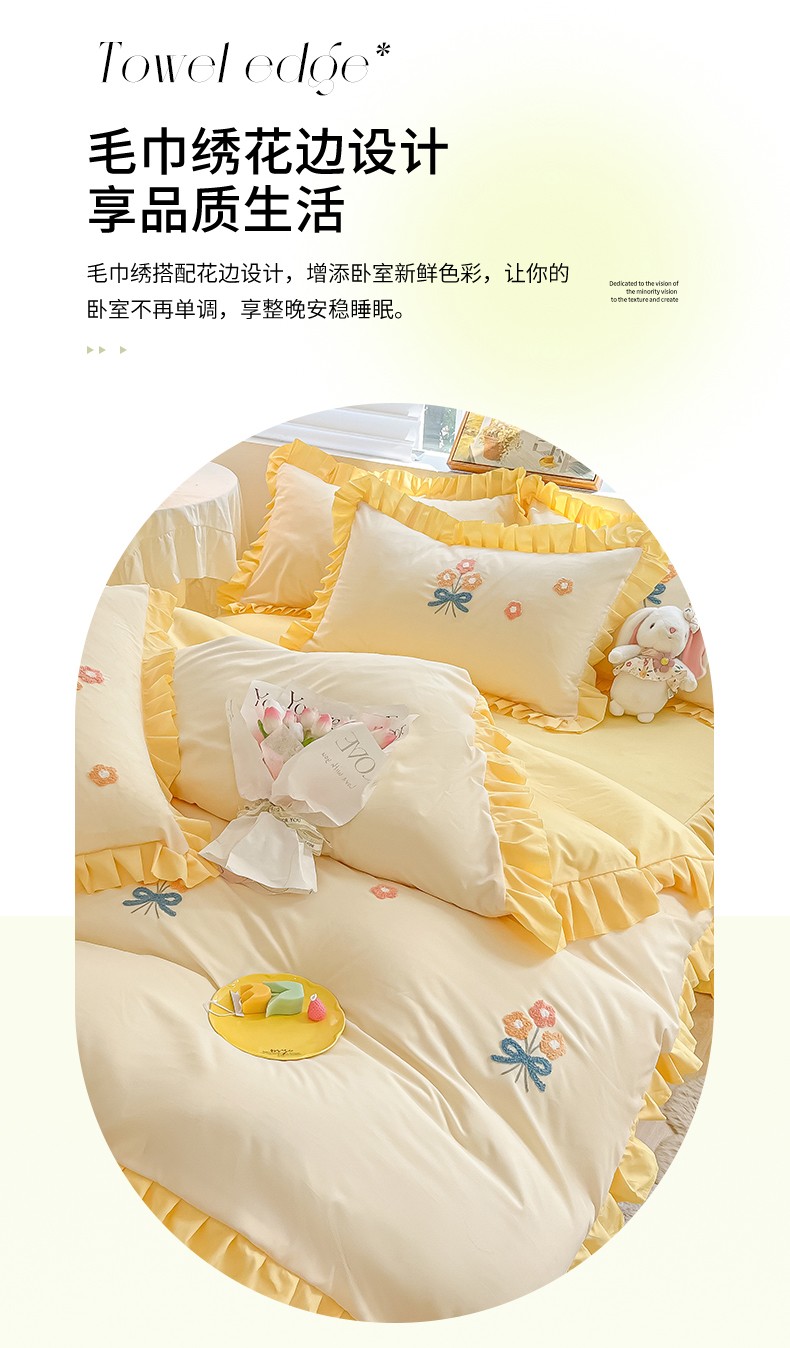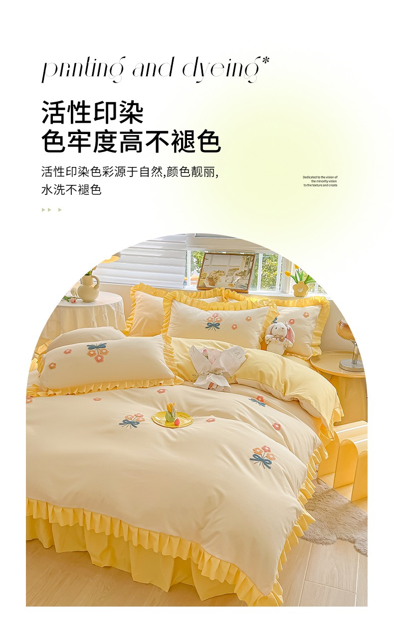 当前位置: 91家纺网 > 商品网购 > 床品套件 > 四件套 > 毛巾绣四件套 > 韩都 2023直播韩版绣花床单床裙四件套-思语 思语-嫩黄