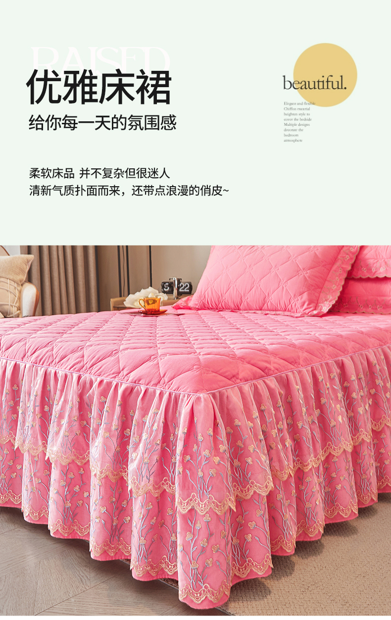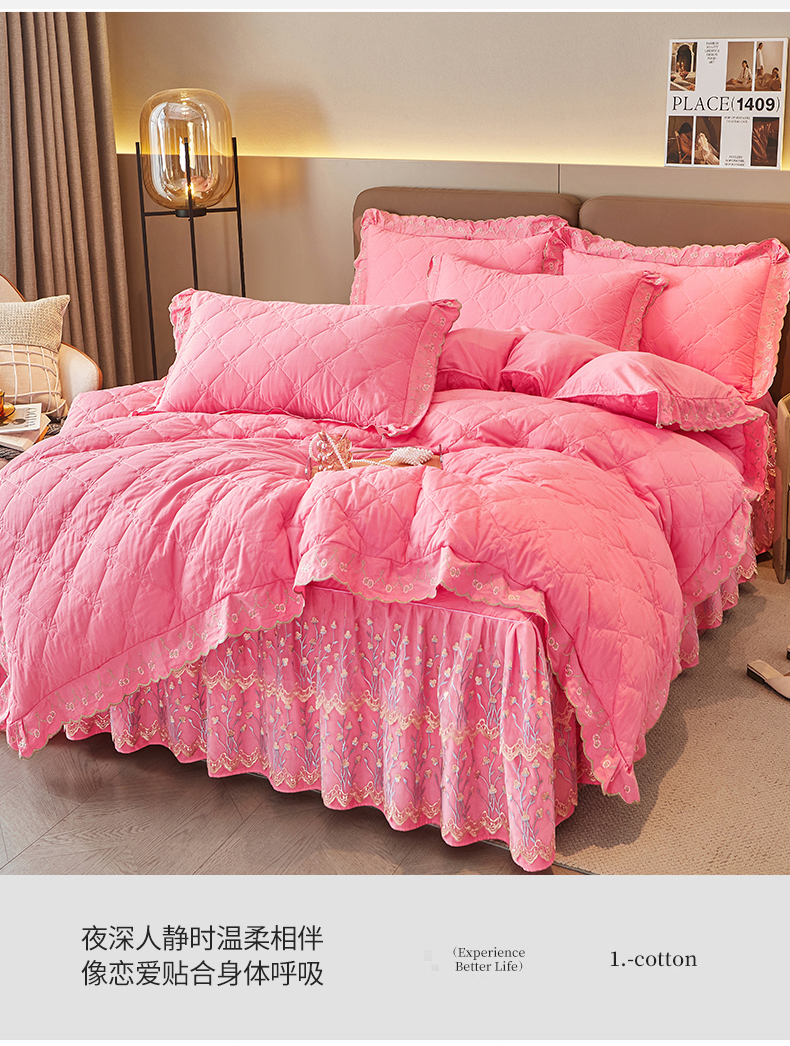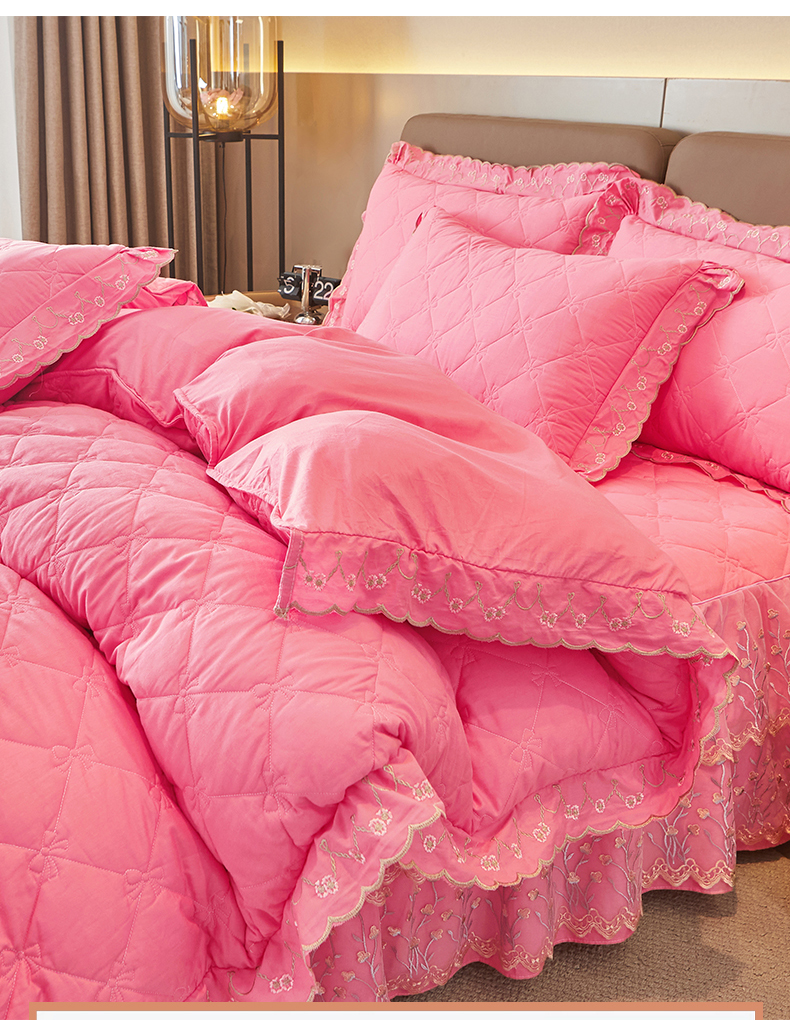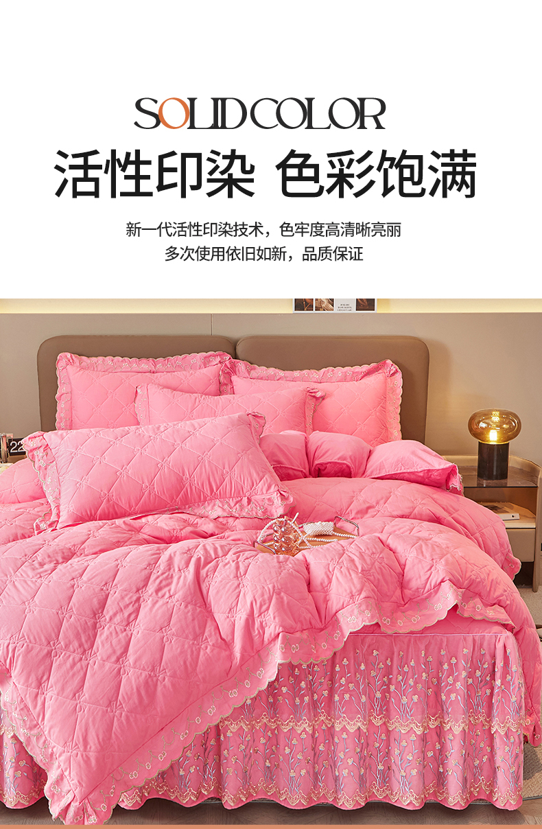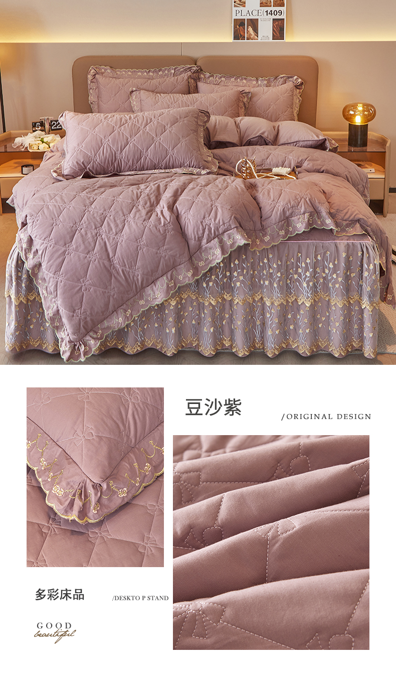 (总)恒爱家纺 2025新款牛奶绒贴布绣夹棉床裙四件套,豆沙红,浪漫紫,天空蓝,温馨粉,象牙白