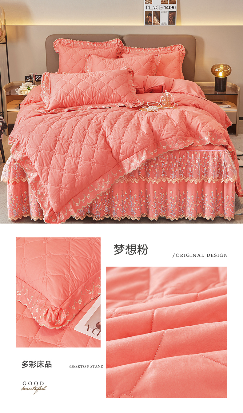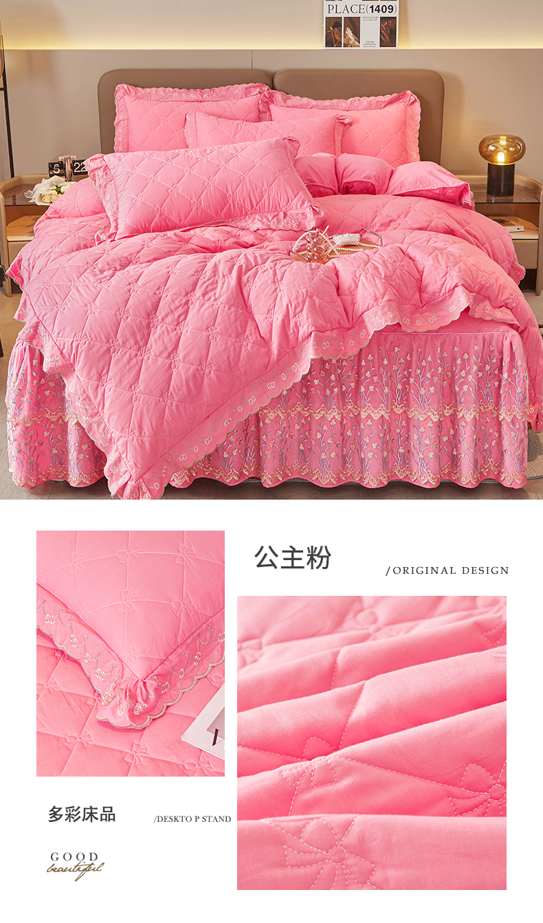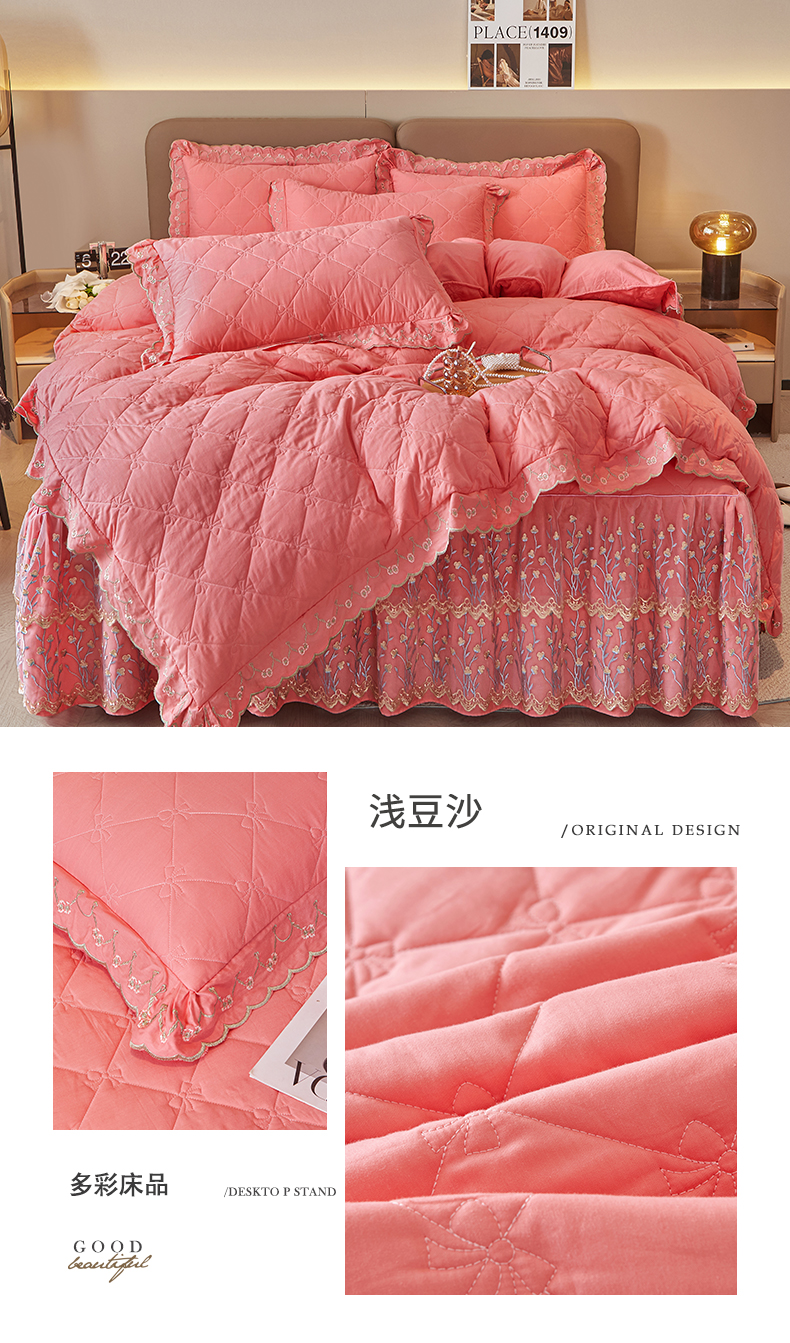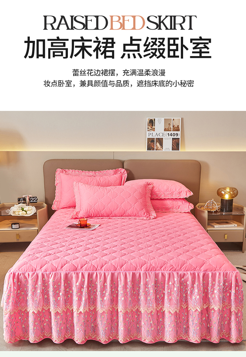 (总)恒爱家纺 2025新款牛奶绒贴布绣夹棉床裙四件套,豆沙红,浪漫紫,天空蓝,温馨粉,象牙白