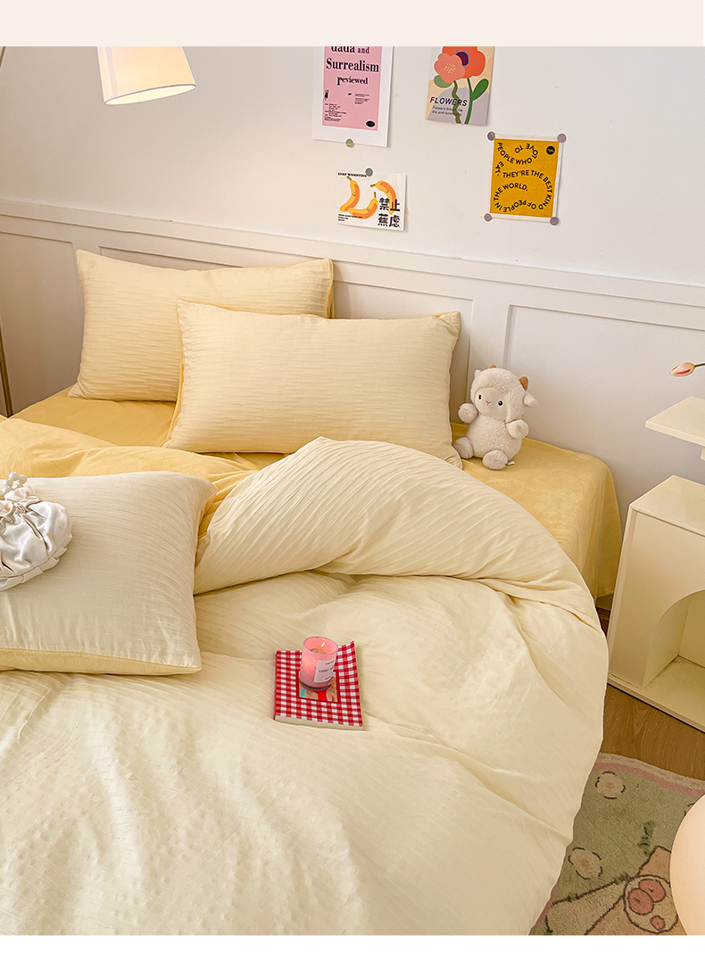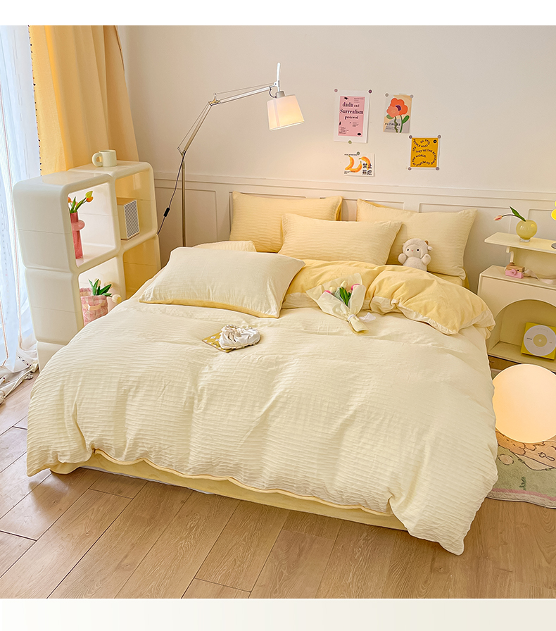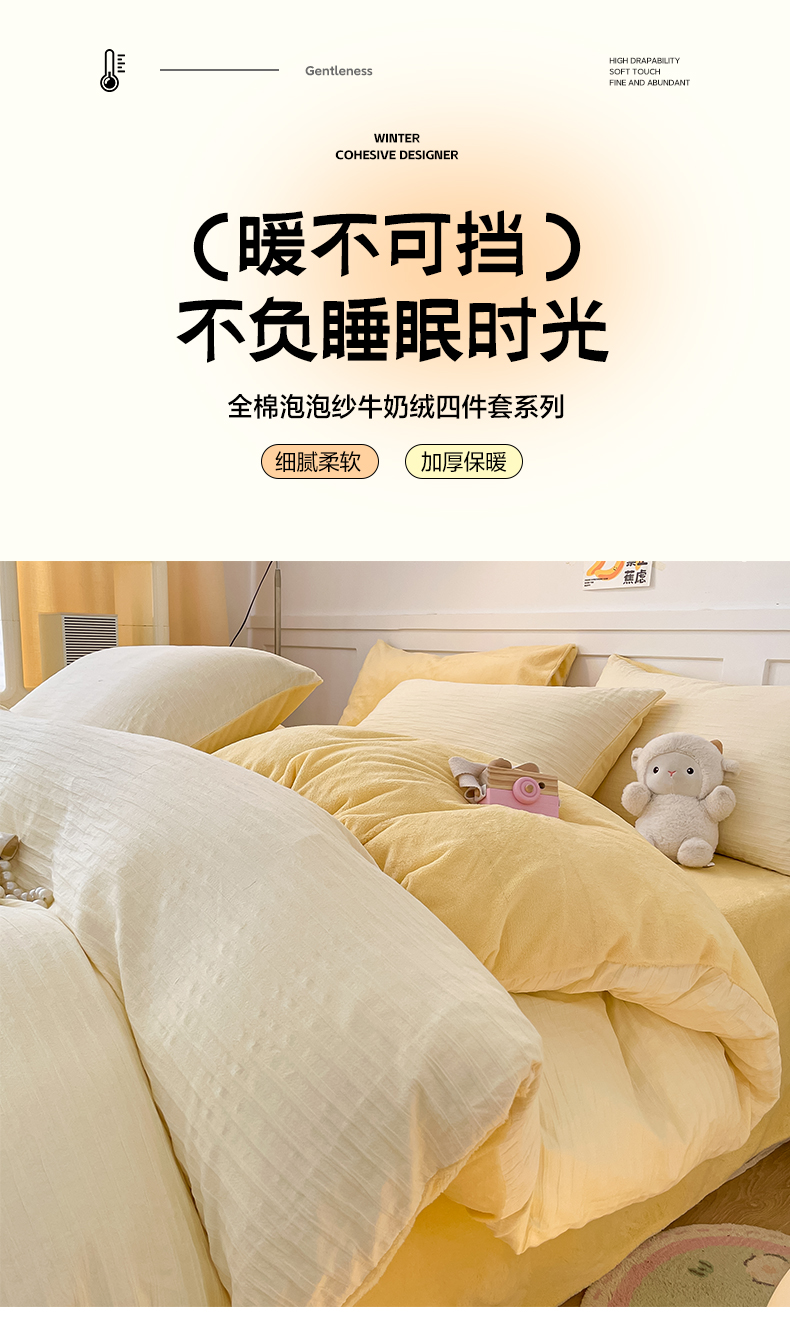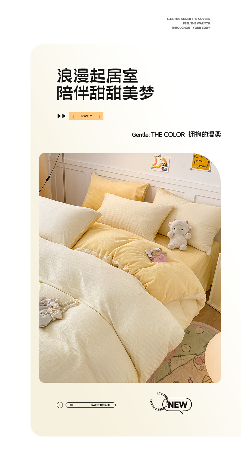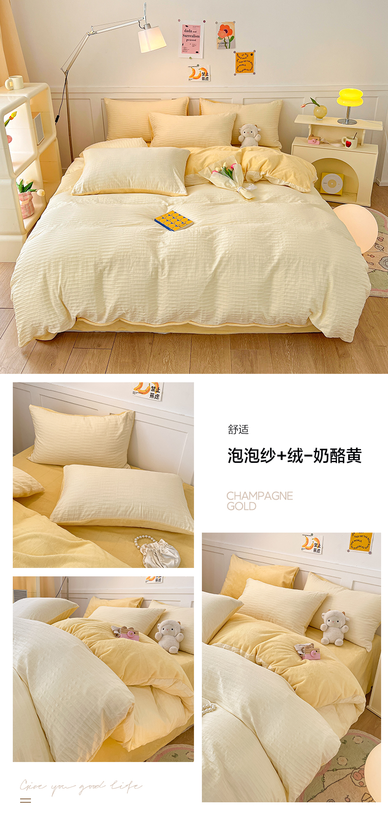 商品名称:雅居纺家纺 2023新款全棉泡泡纱牛奶绒四件套 泡泡纱+绒-奶酪黄