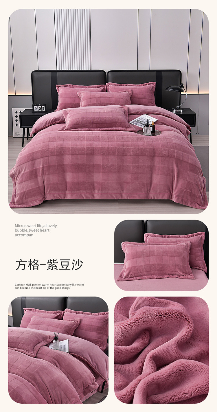 席之家 2023加厚保暖立体剪花方格雪兔毛四件套-简爱款 方格-紫豆沙
