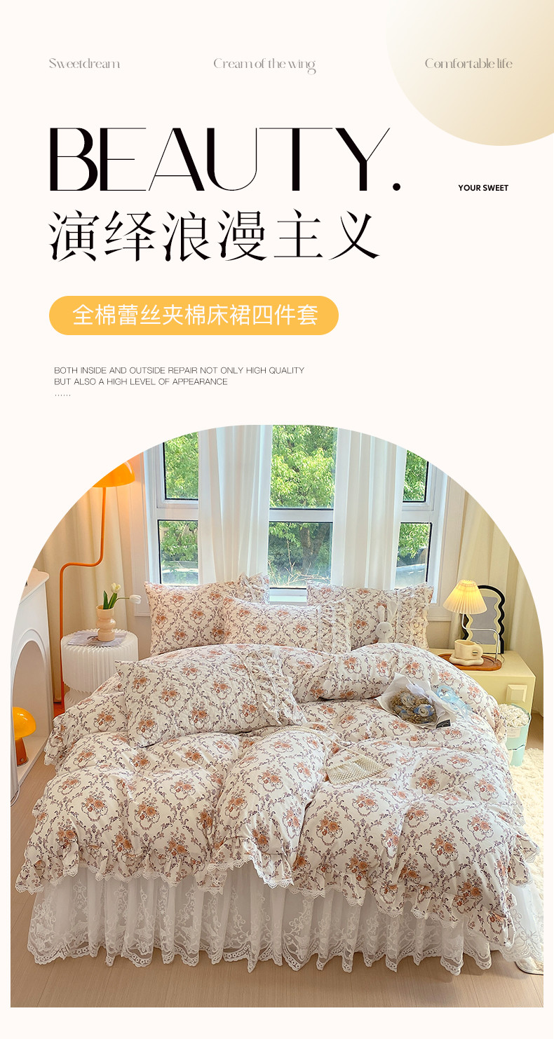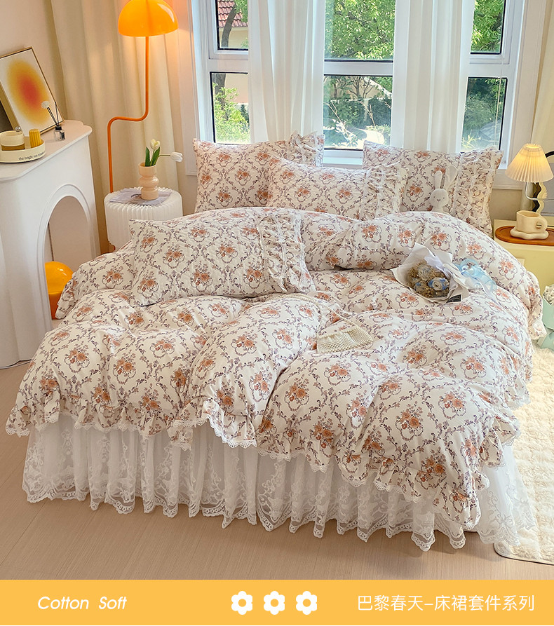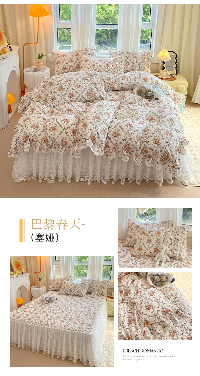 当前位置: 91家纺网 > 商品网购 > 床品套件 > 四件套 > 全棉普通四件套 > 罗艺轩 2024新款全棉蕾丝夹棉床裙巴黎春天系列四件套 赛娅