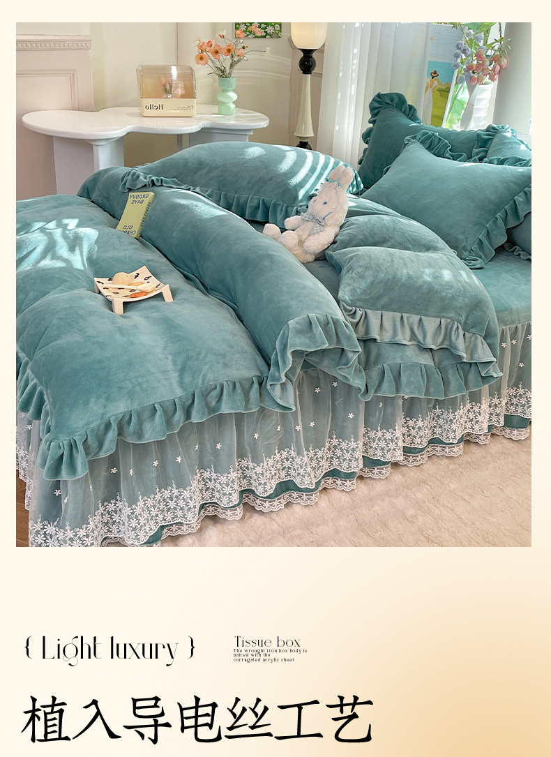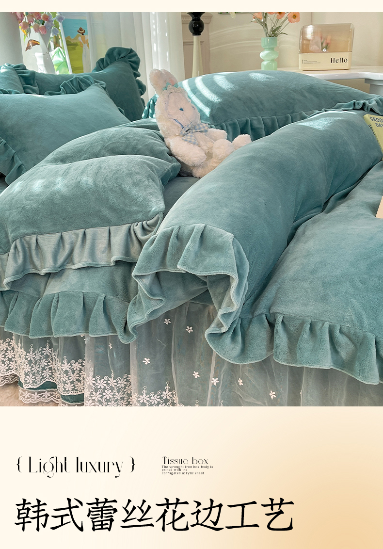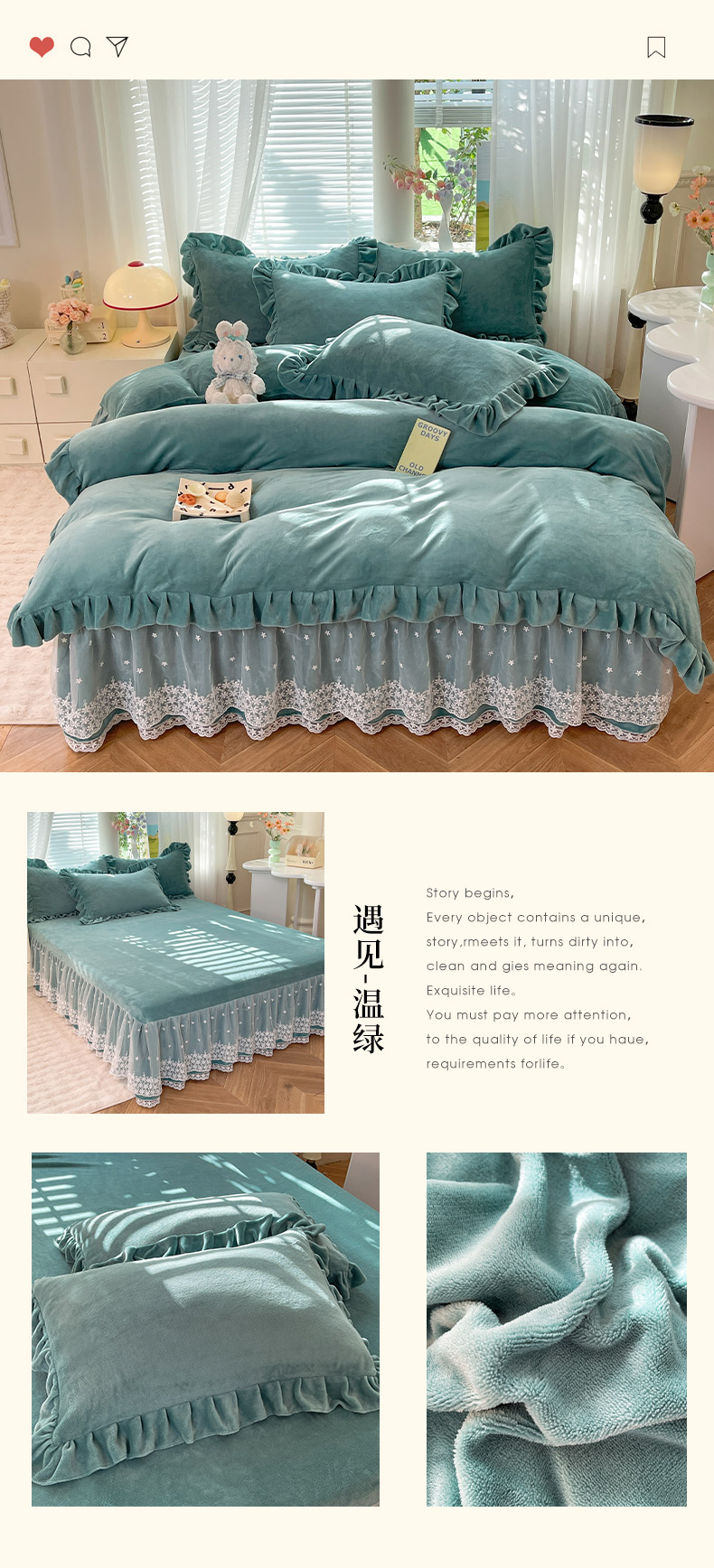 商品名称:【8斤重】2025新款秋冬加厚牛奶绒床裙款四件套法式浪漫蕾丝花边工艺-遇见系列 遇见-温绿