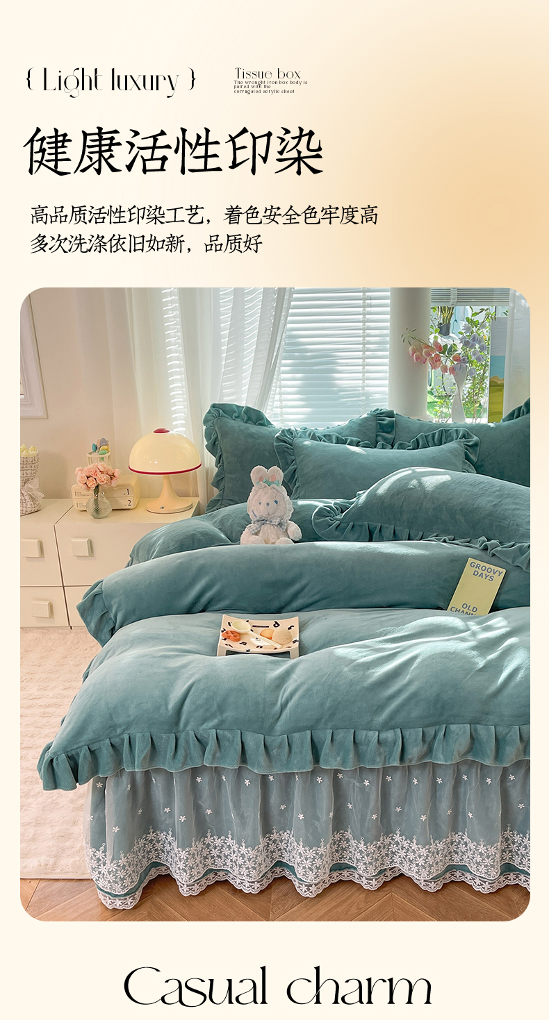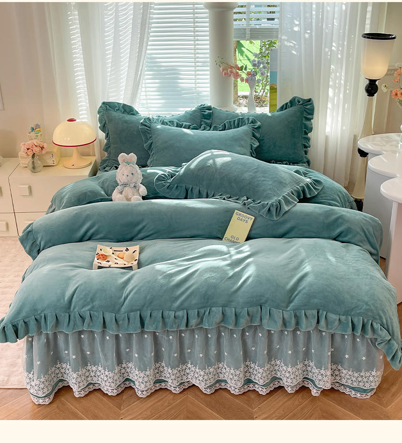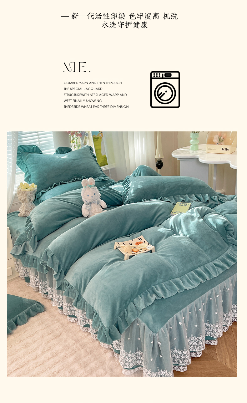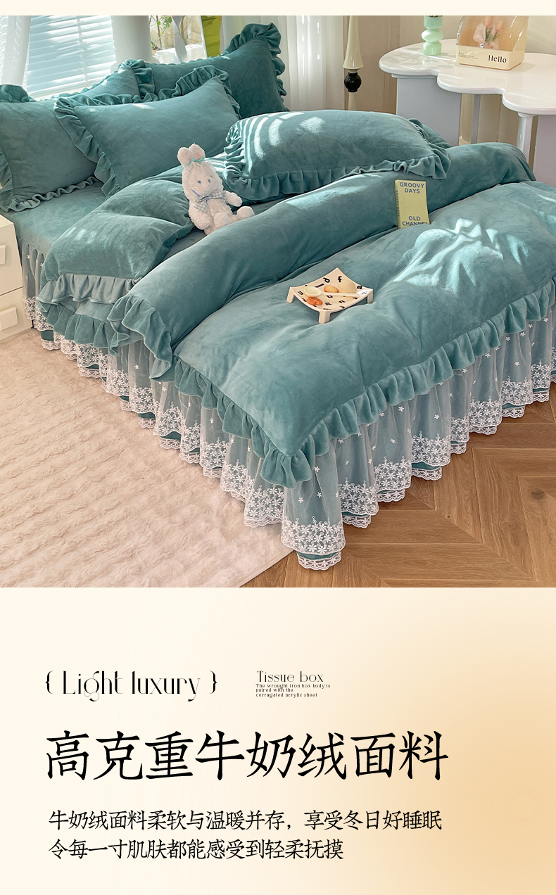 【8斤重】2025新款秋冬加厚牛奶绒床裙款四件套法式浪漫蕾丝花边工艺-遇见系列 遇见-温绿