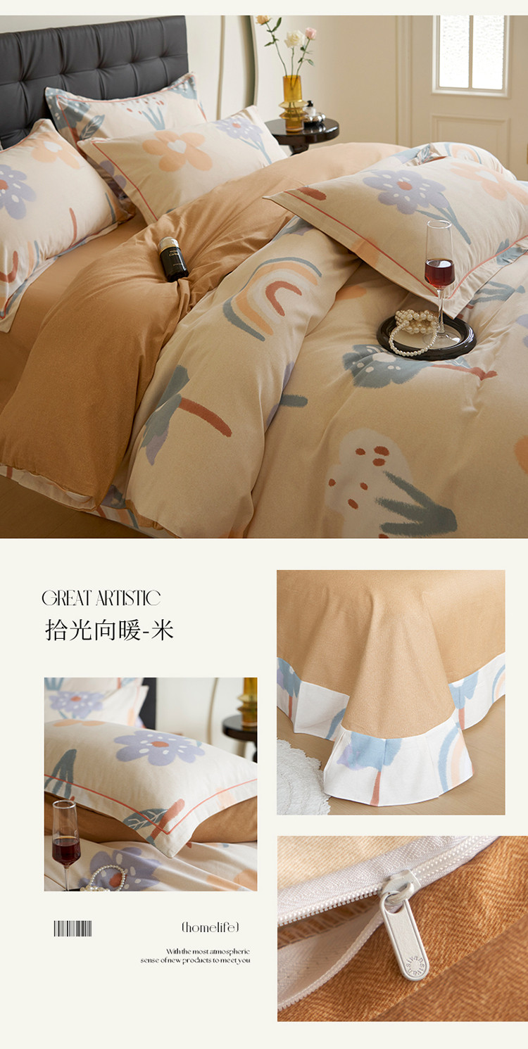 嘉汀兰家居 2023新款全棉磨毛印花系列四件套 拾光向暖-米
