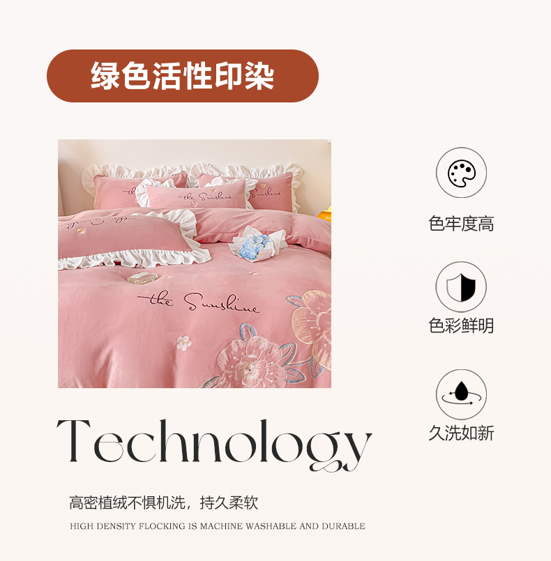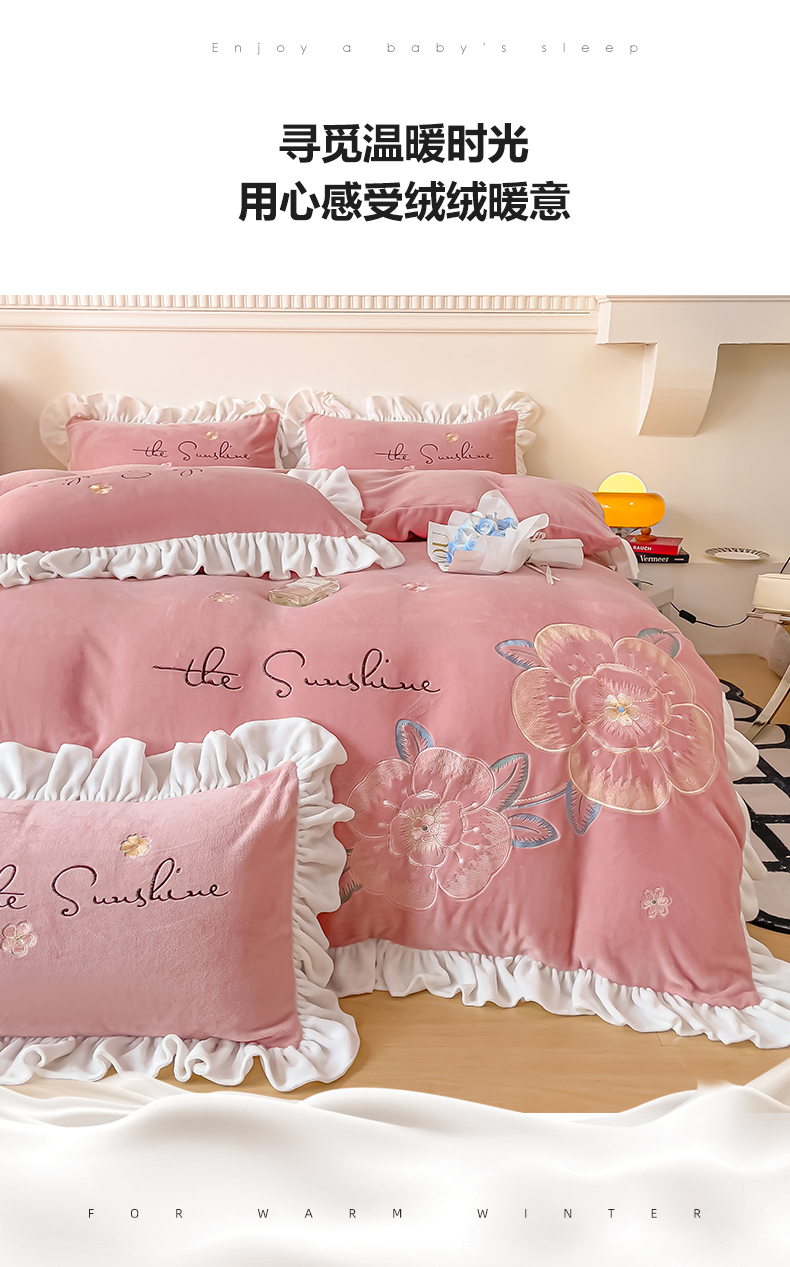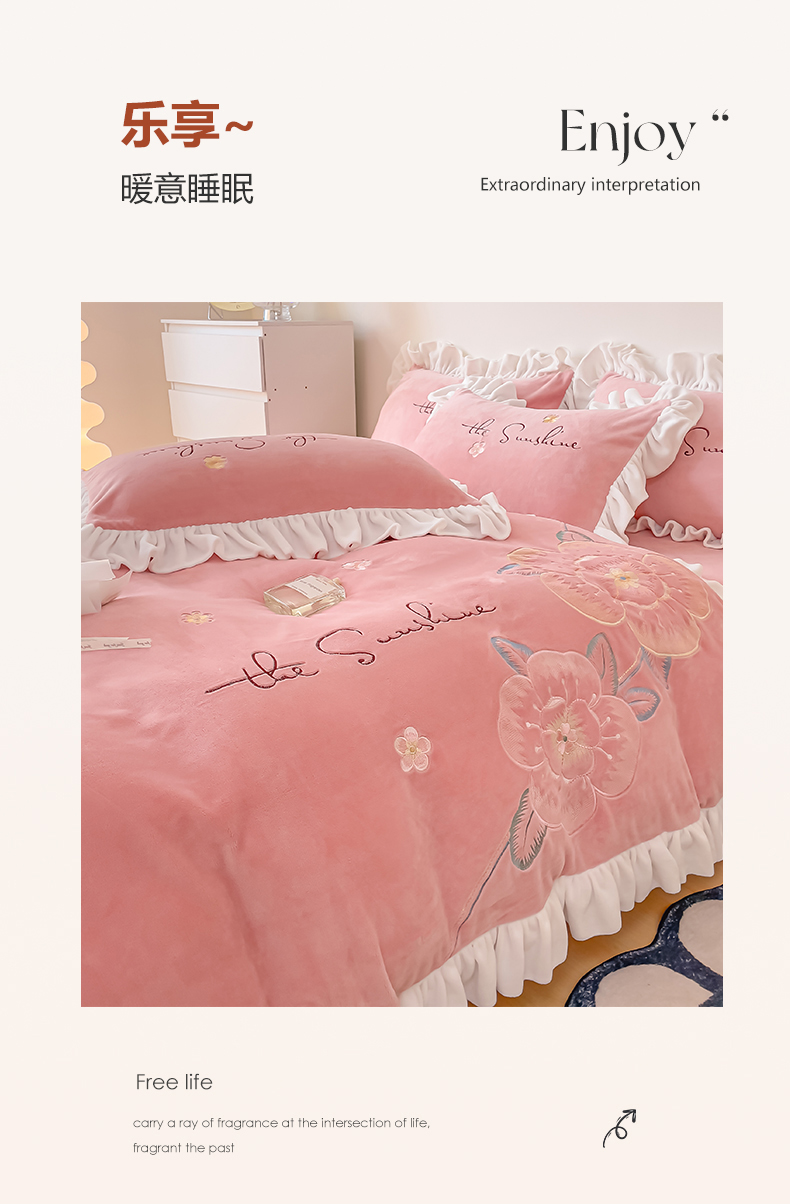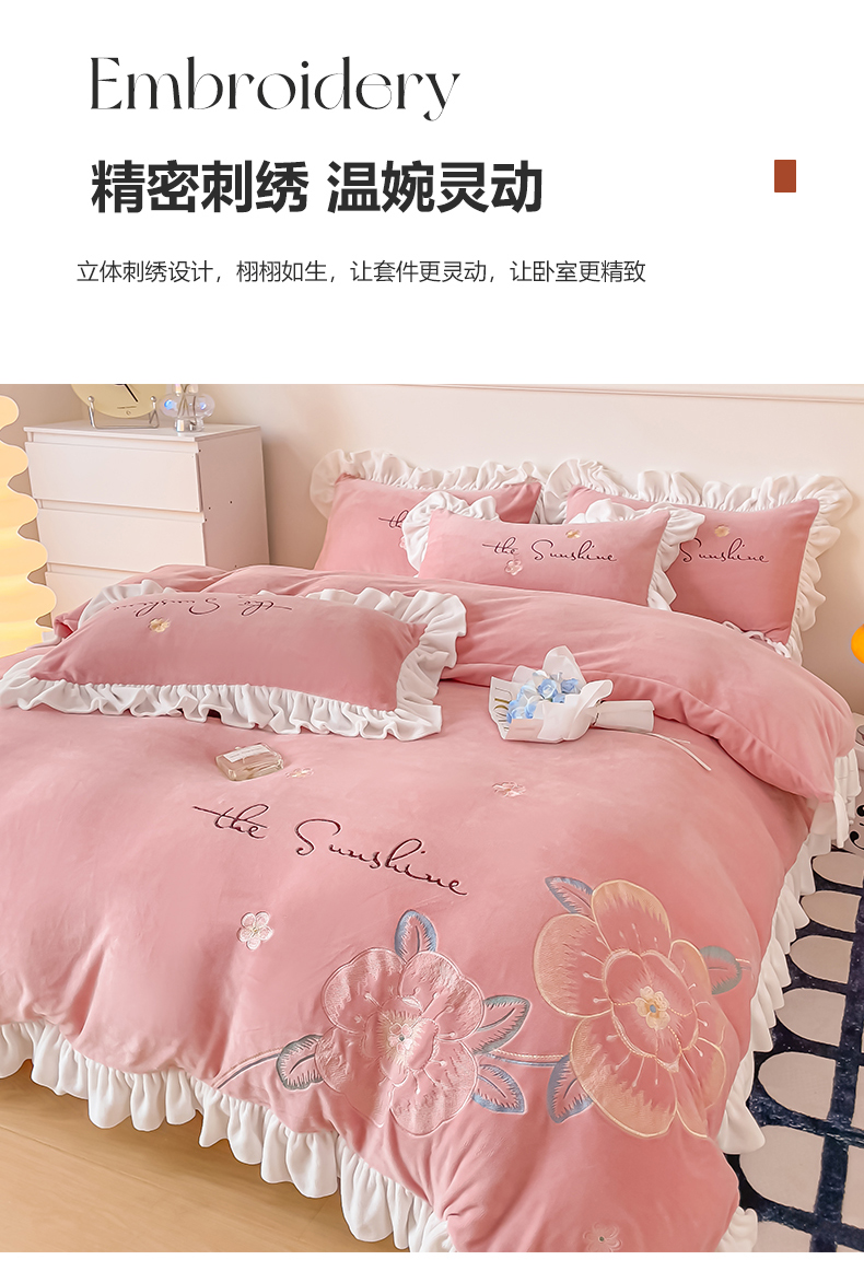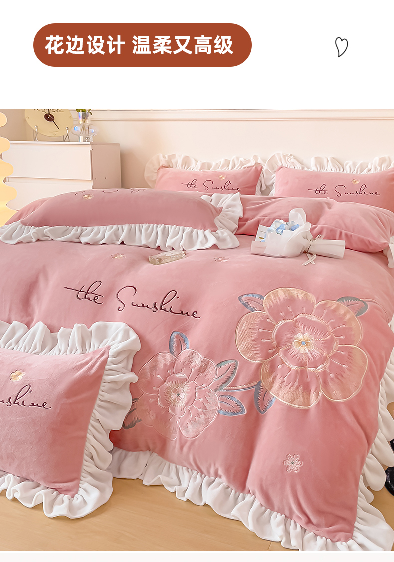 凯美家居 2023新款牛奶绒刺绣四件套 浪漫花语 豆沙