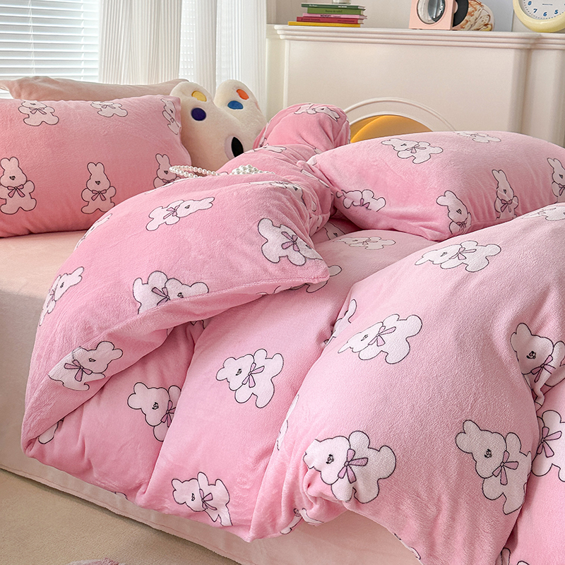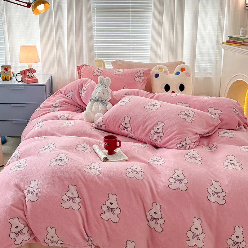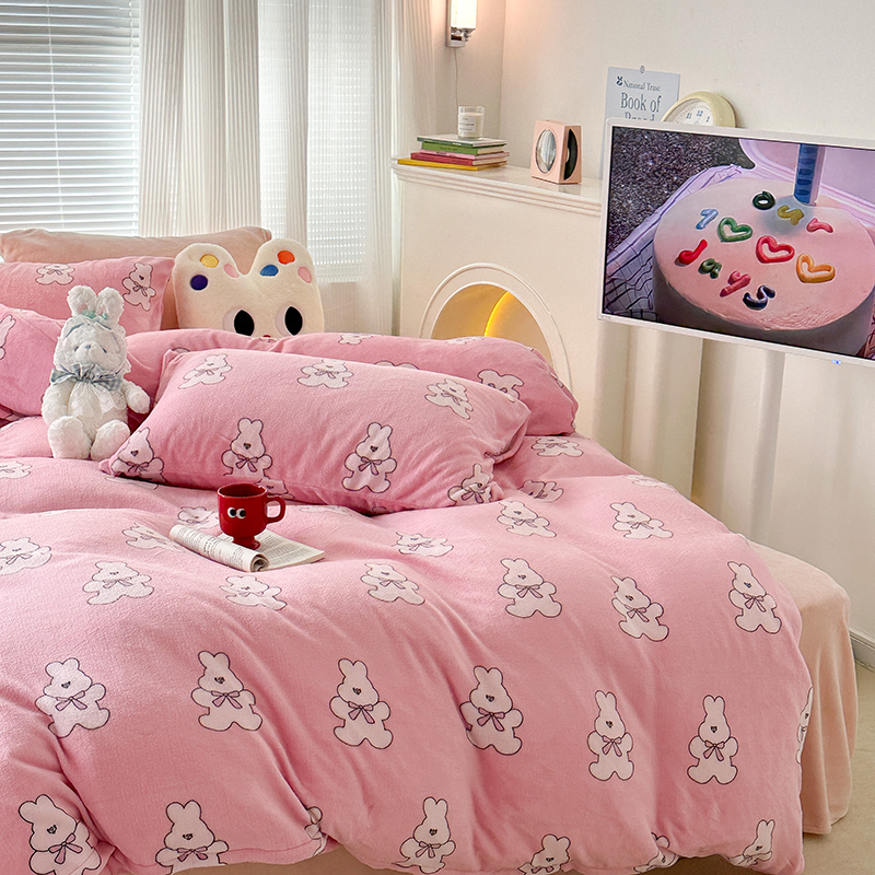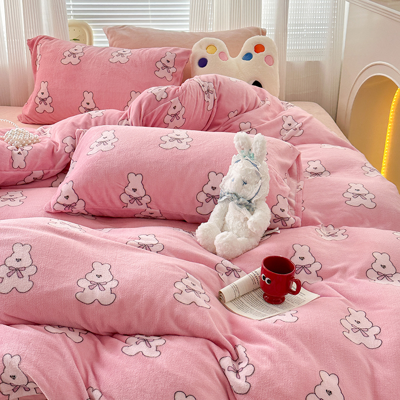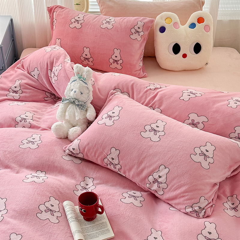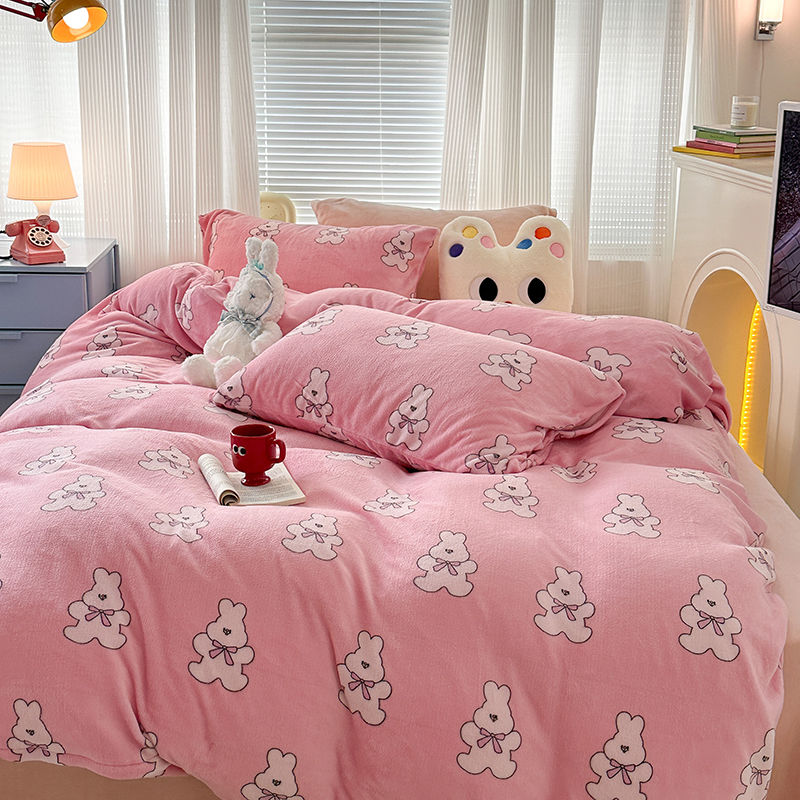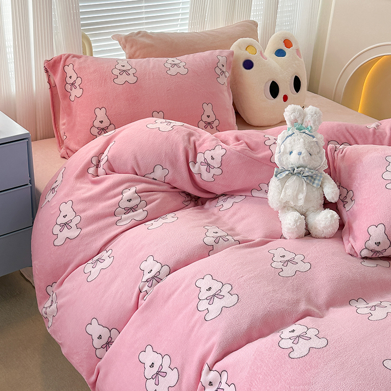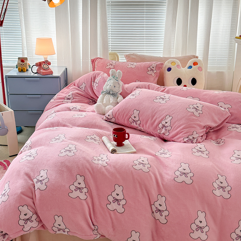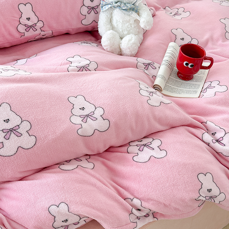 昔可家纺 2023新款高克重印花牛奶绒卡通系列四件套 多巴胺兔兔
