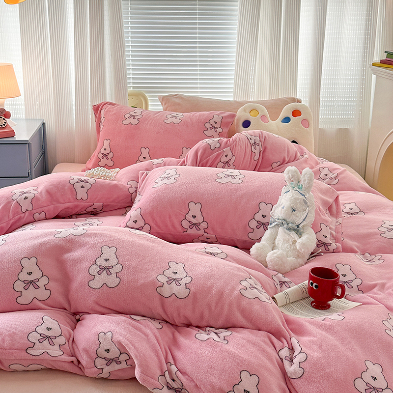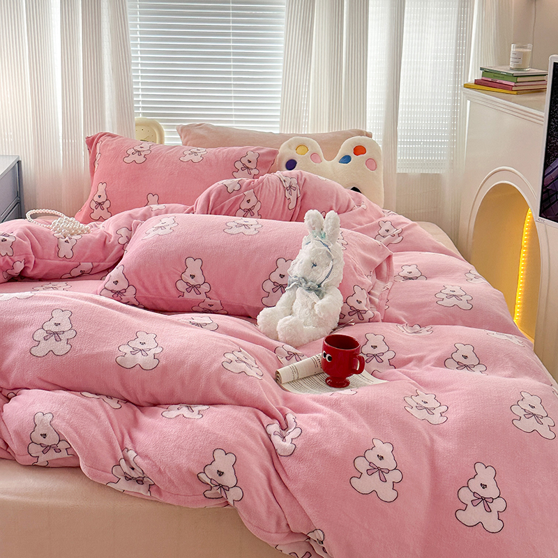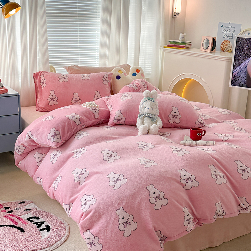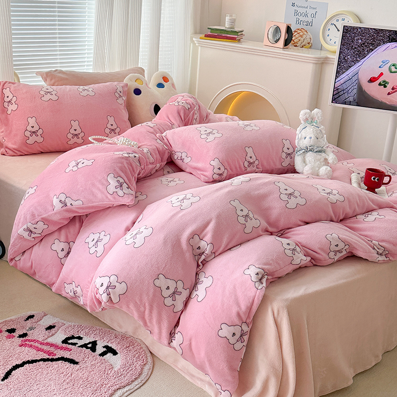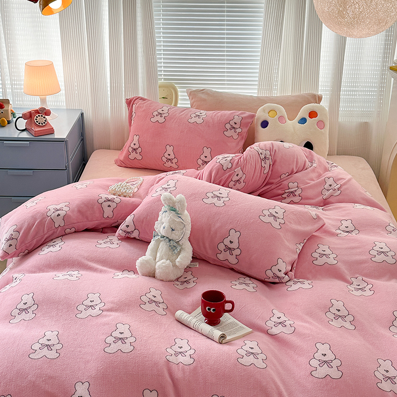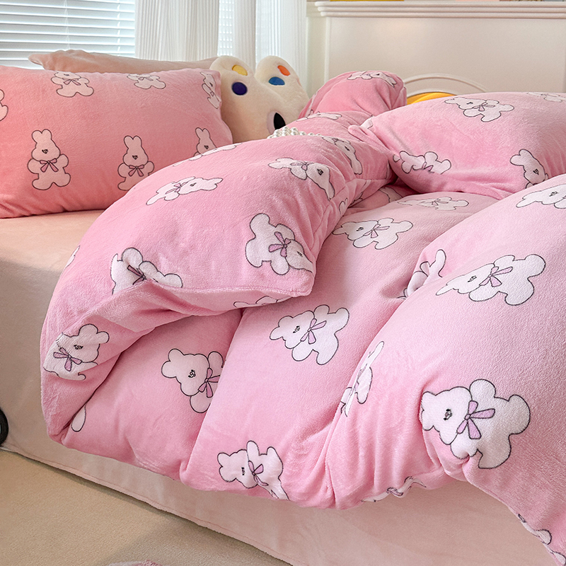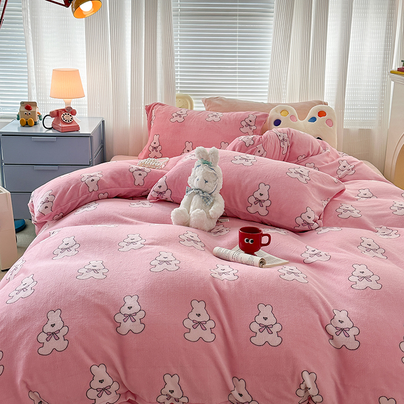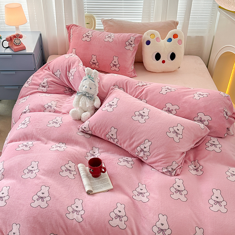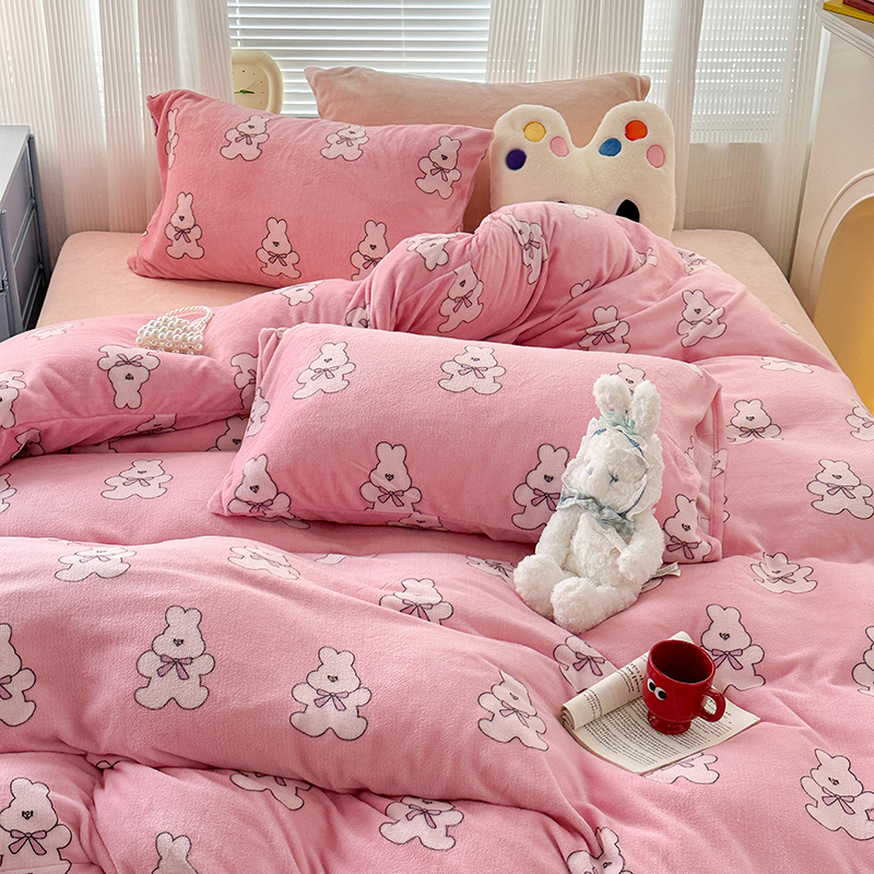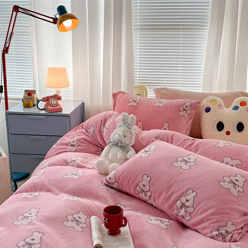 昔可家纺 2023新款高克重印花牛奶绒卡通系列四件套 多巴胺兔兔