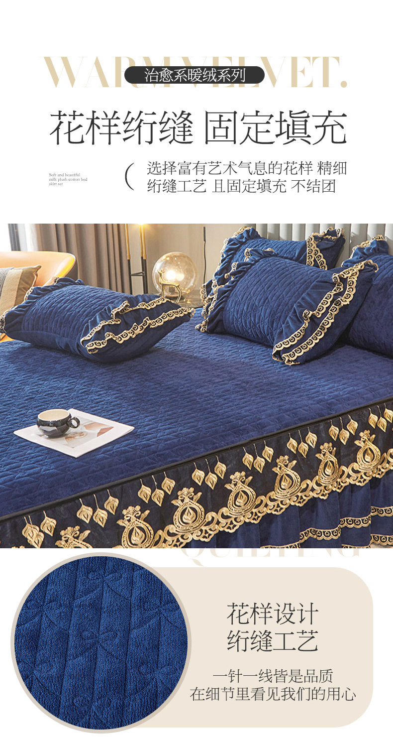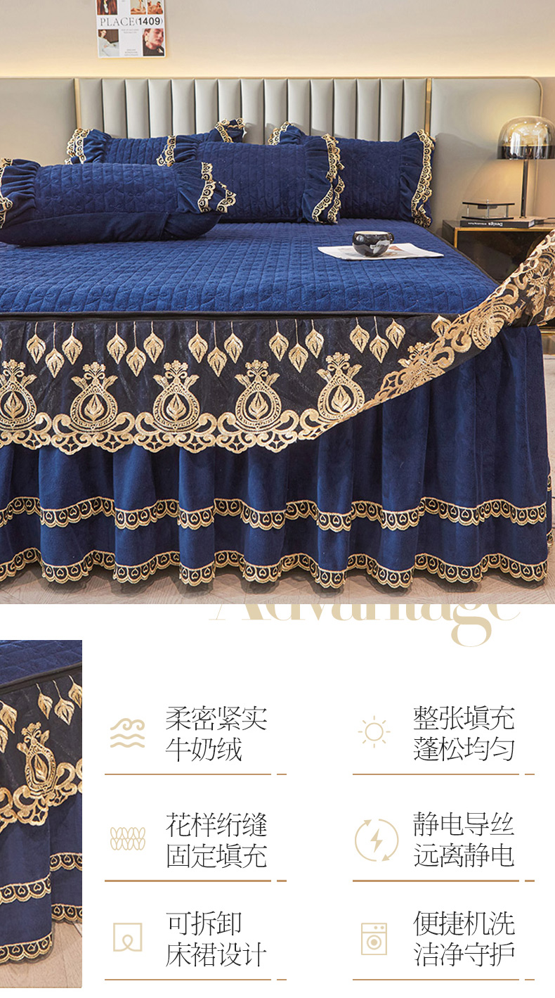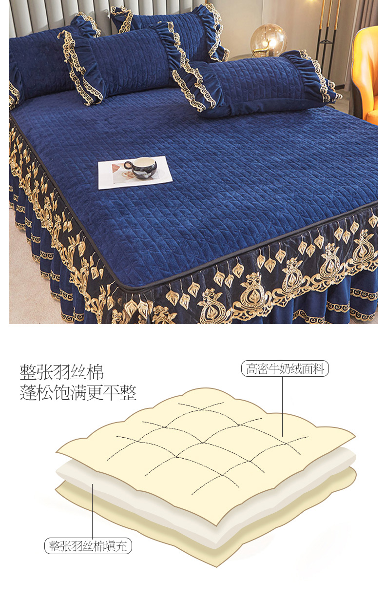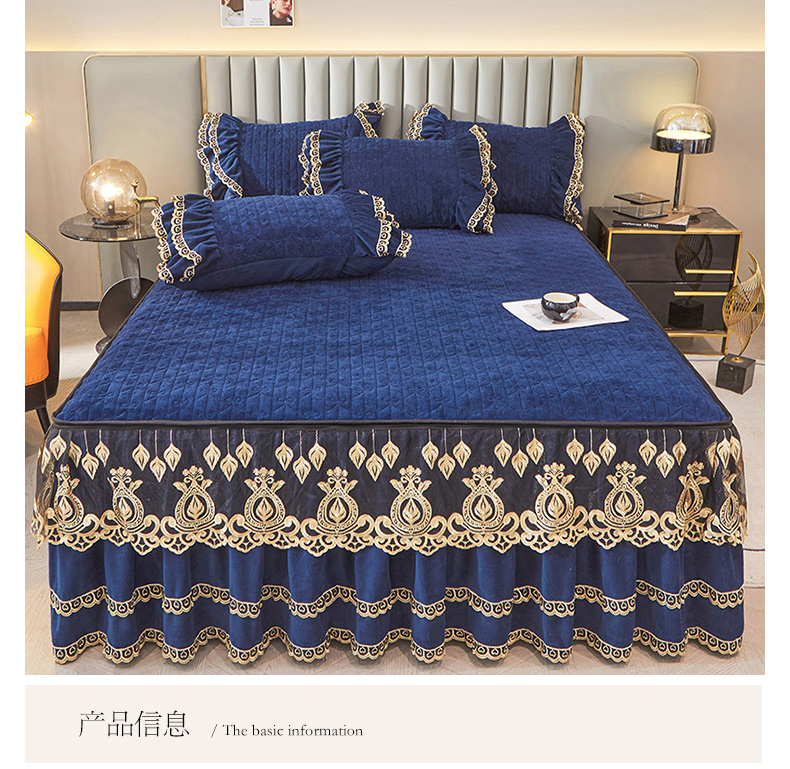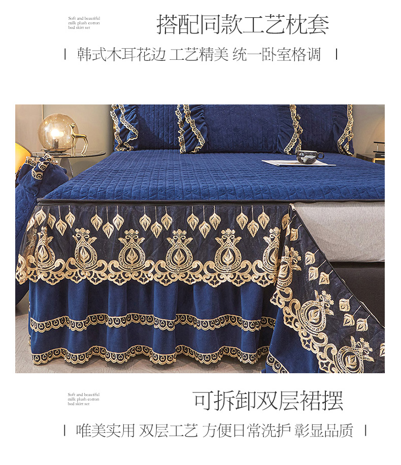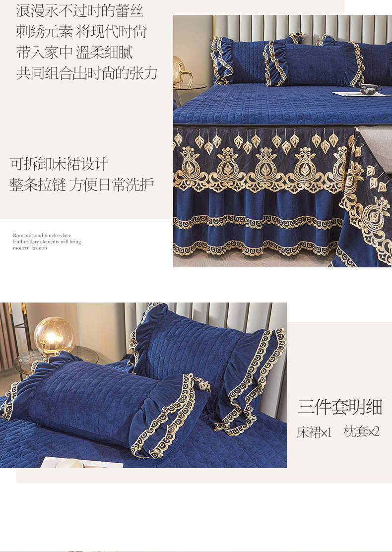 商品名称:虹星家纺 2023新款牛奶绒夹棉蕾丝可拆卸床裙系列单床裙 梦幻巴黎 宝蓝