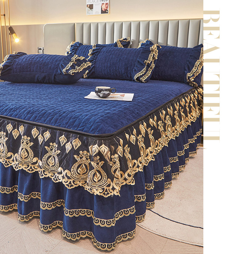 虹星家纺 2023新款牛奶绒夹棉蕾丝可拆卸床裙系列单床裙 梦幻巴黎 宝蓝