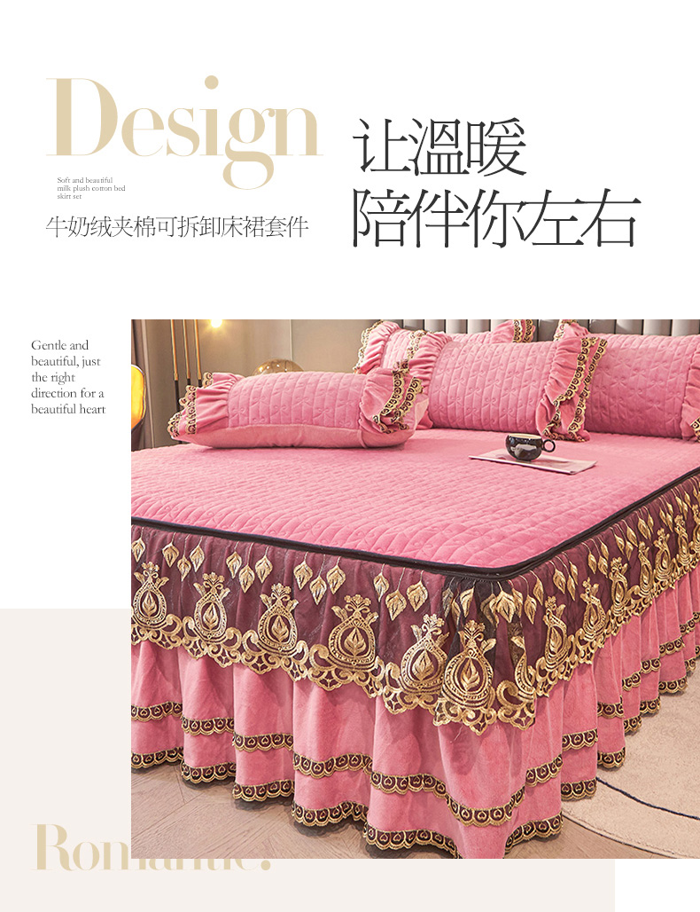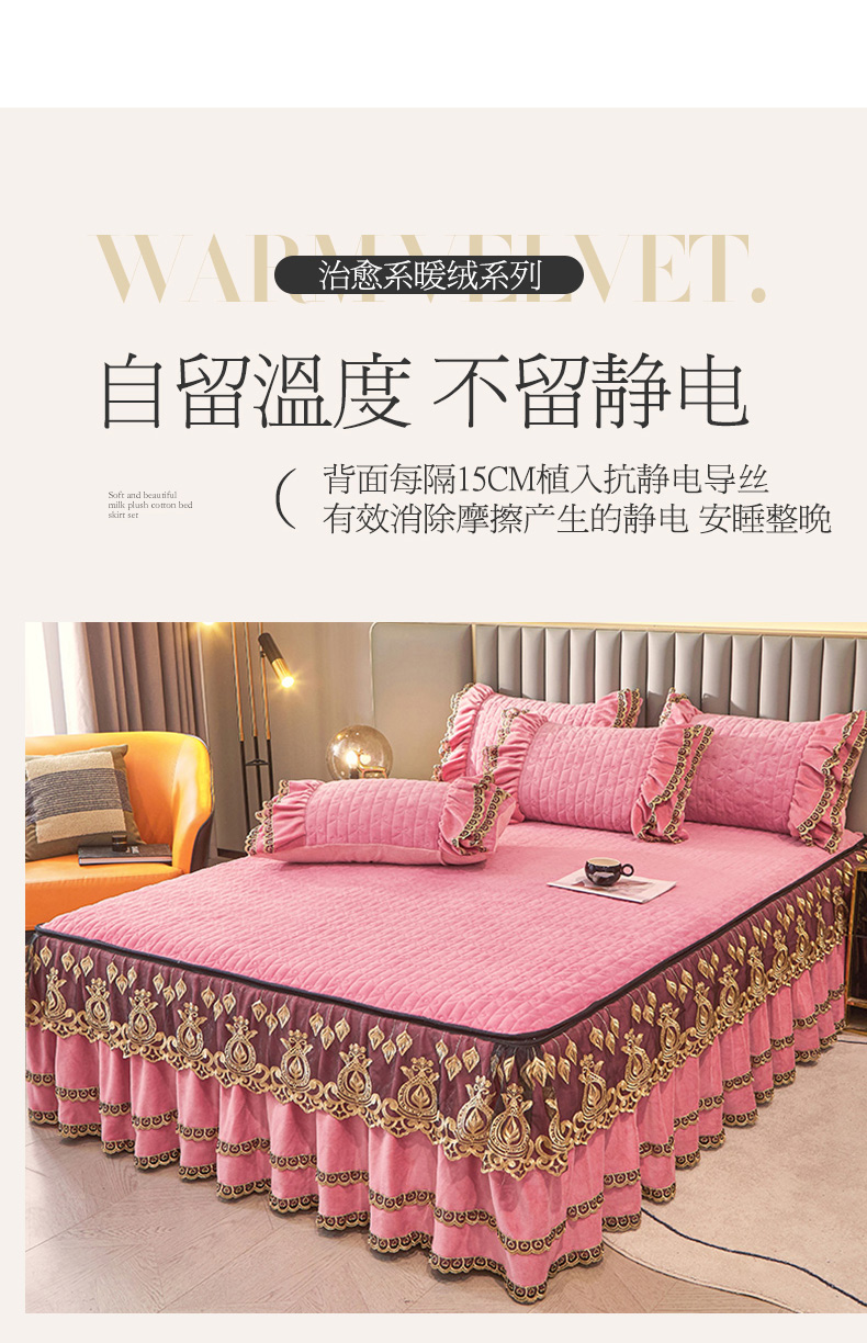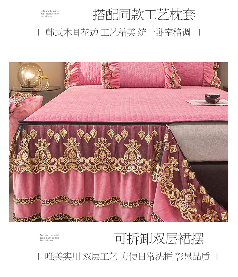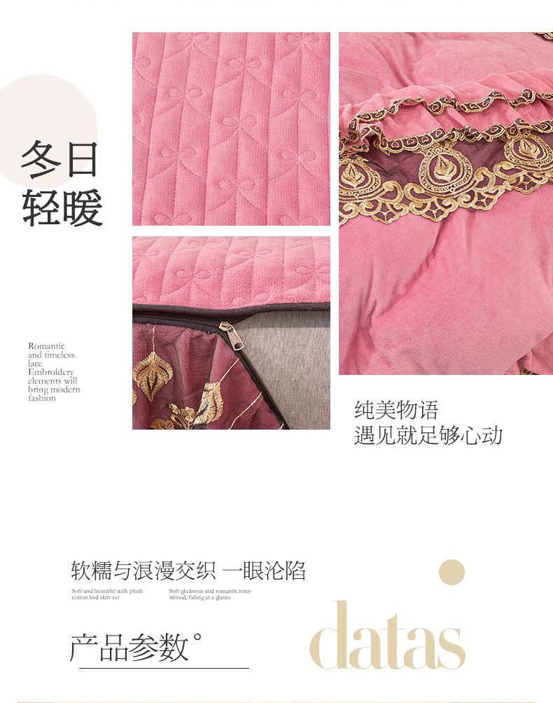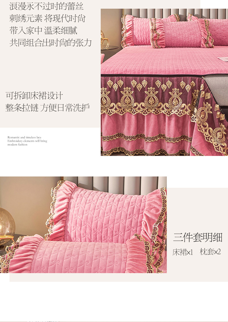 商品名称:虹星家纺 2023新款牛奶绒夹棉蕾丝可拆卸床裙系列单床裙 梦幻巴黎 胭脂