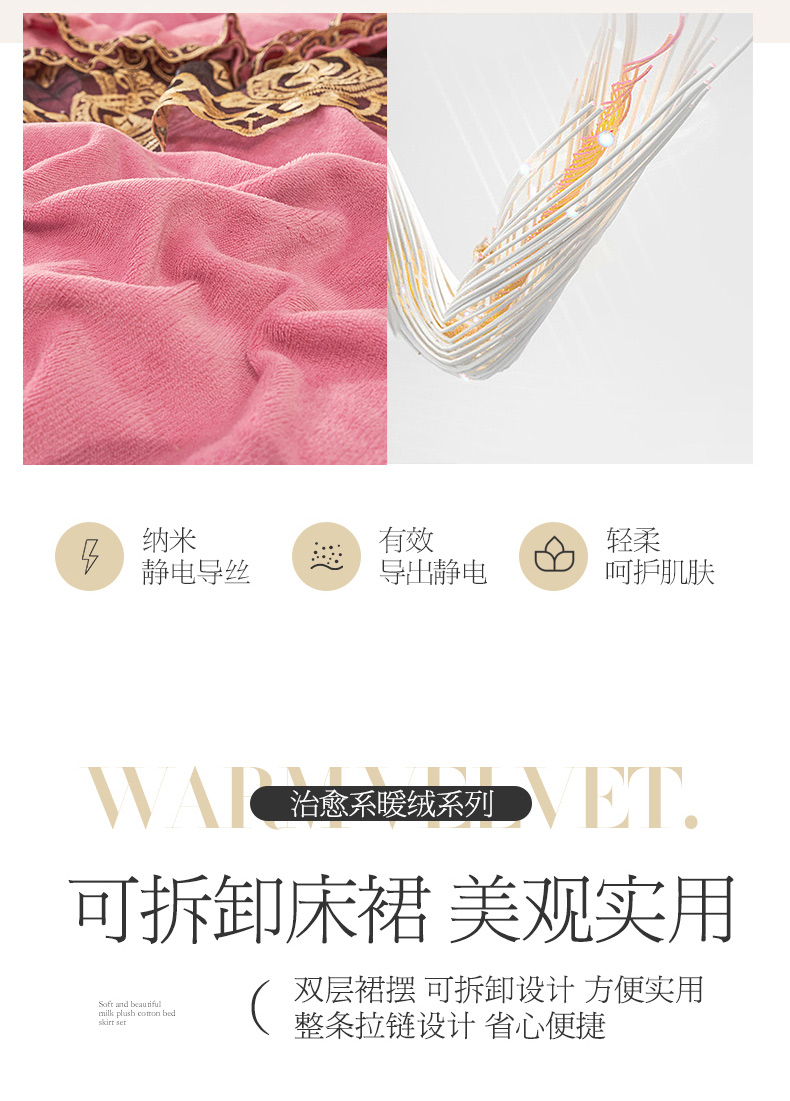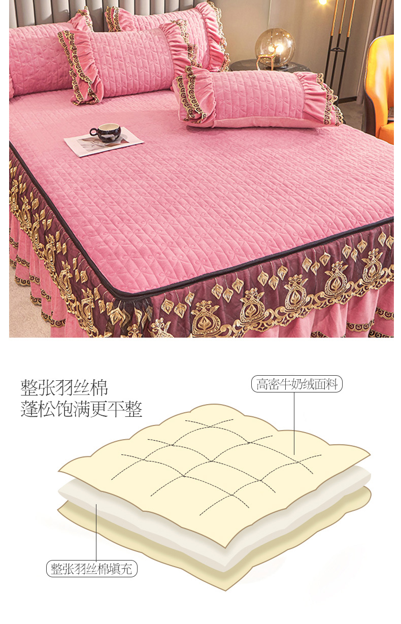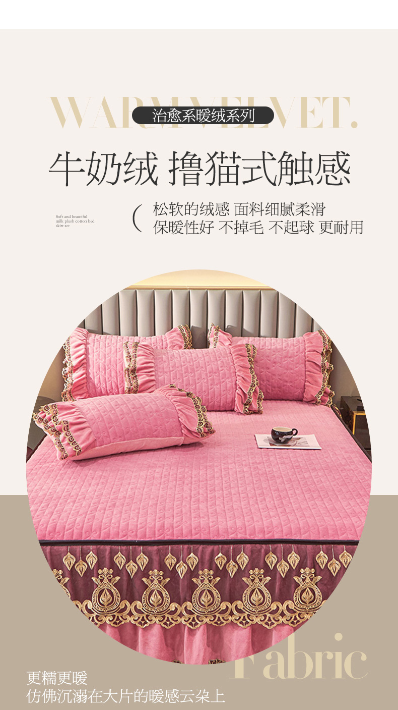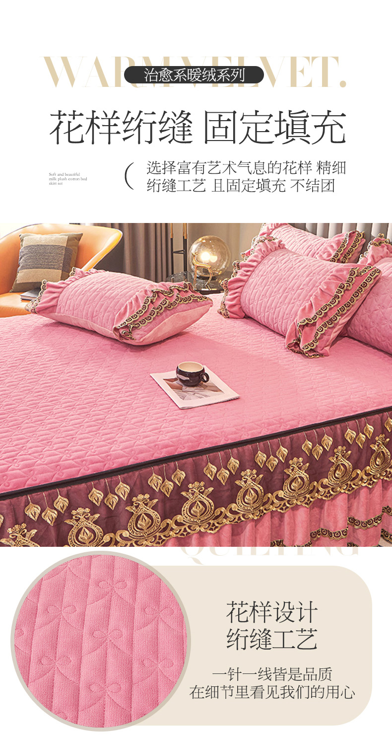 商品名称:虹星家纺 2023新款牛奶绒夹棉蕾丝可拆卸床裙系列单床裙 梦幻巴黎 胭脂
