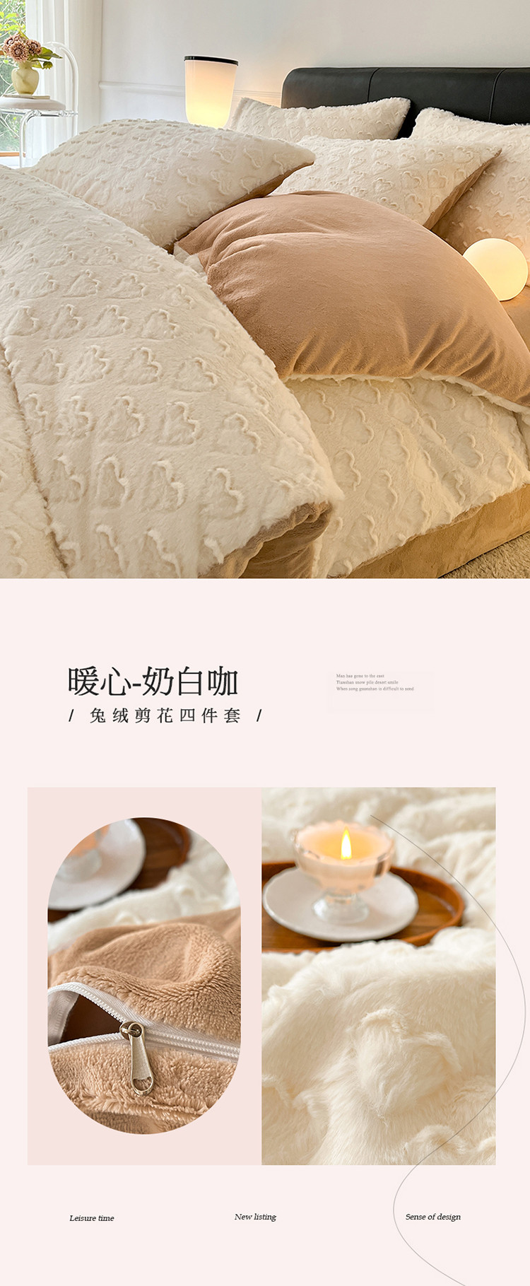 当前位置: 91家纺网 > 商品网购 > 床品套件 > 四件套 > 兔毛绒四件套 > 慕色 2023新款兔绒爱心剪花四件套--暖心系列 暖心-奶白咖