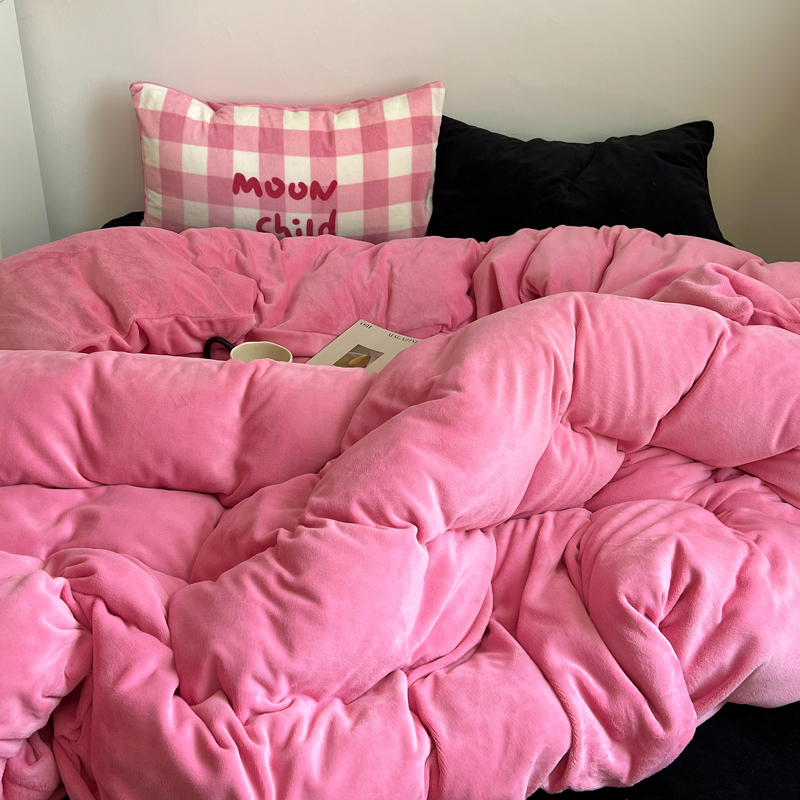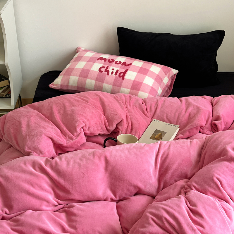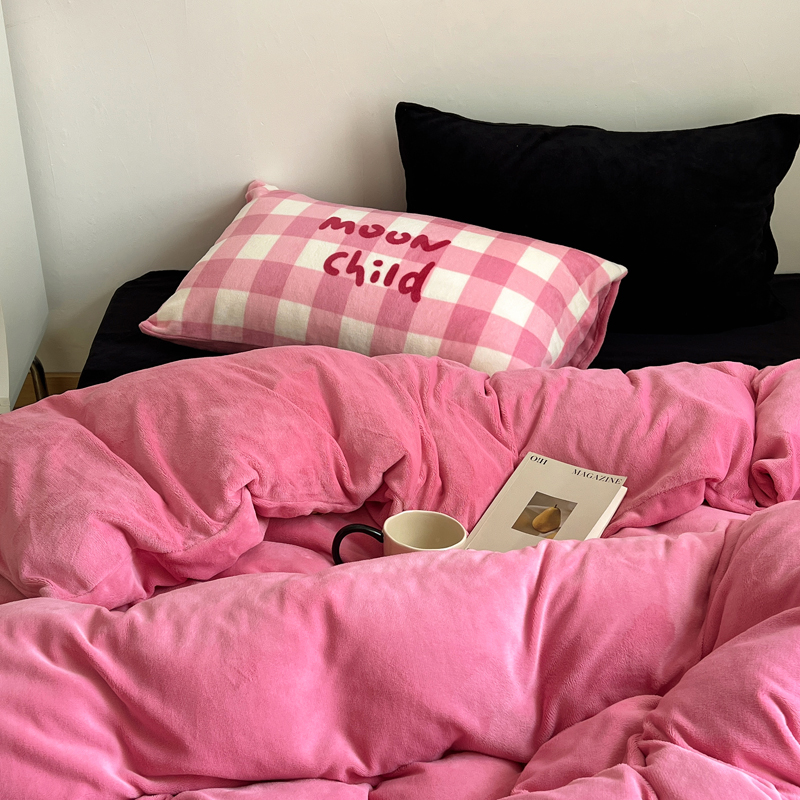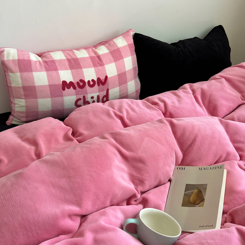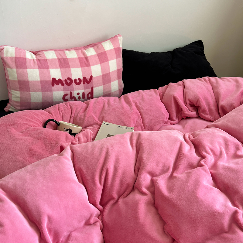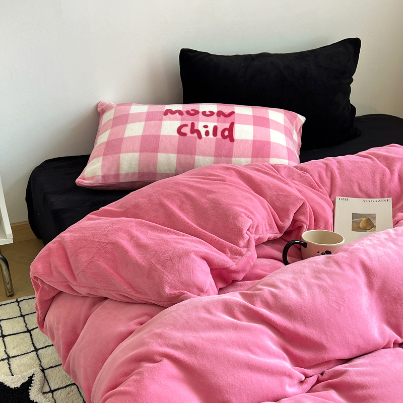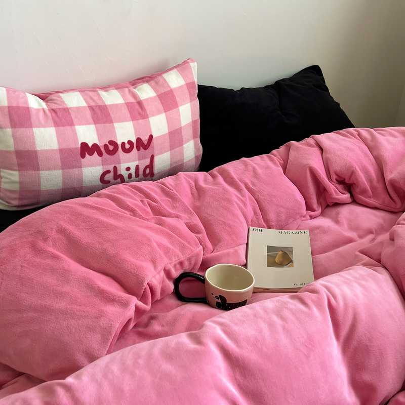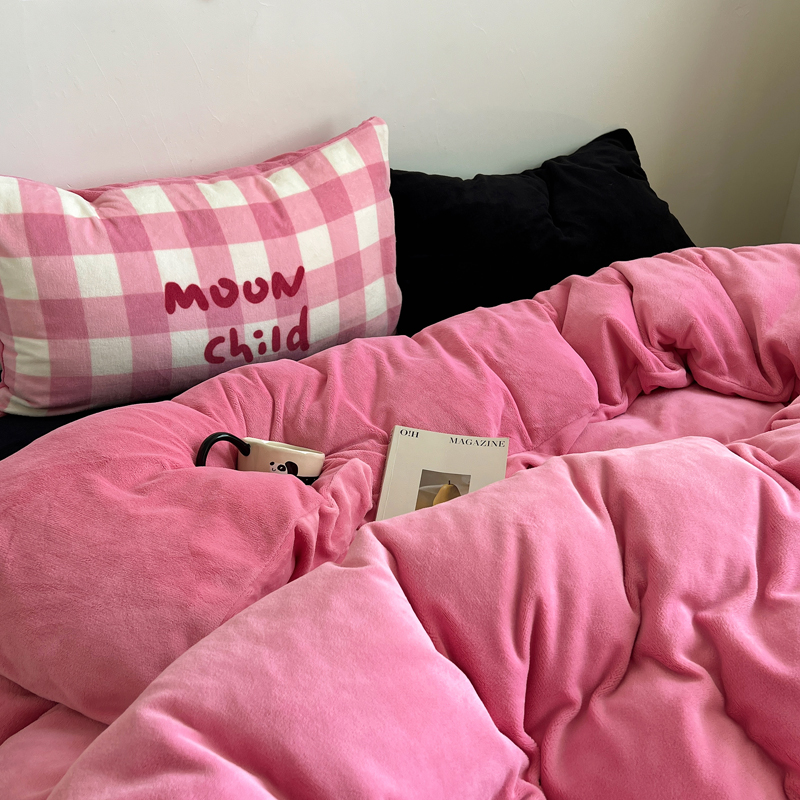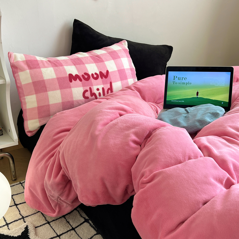 桃喜 2024新款牛奶绒纯色混搭系列四件套 黑粉格子