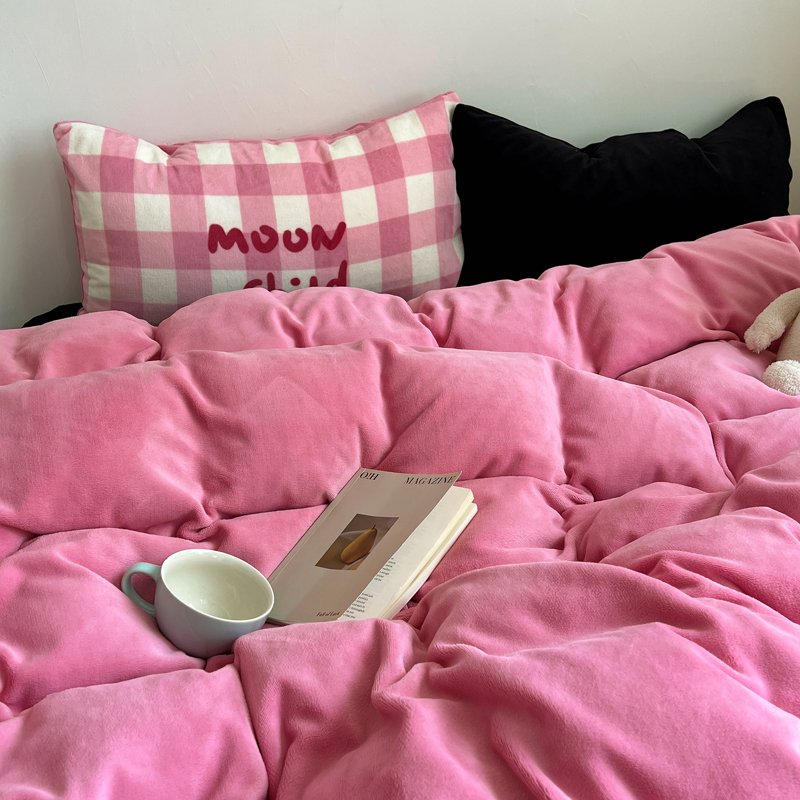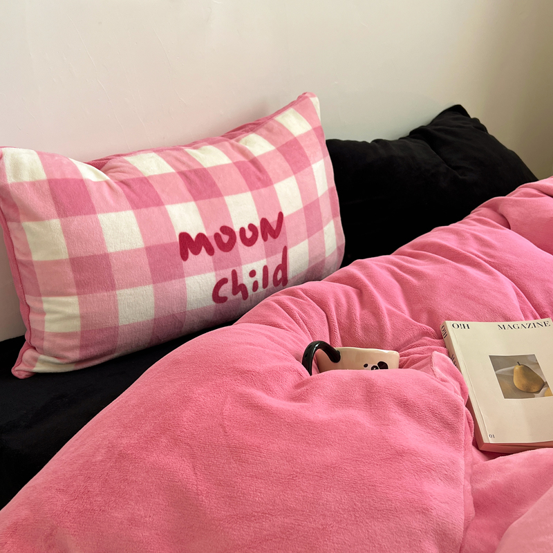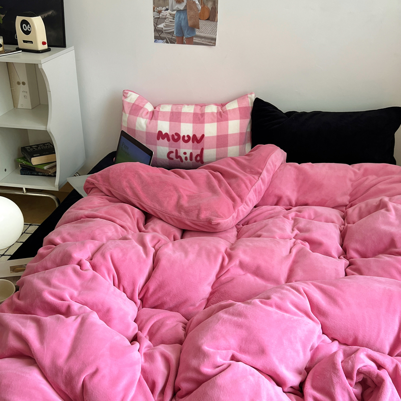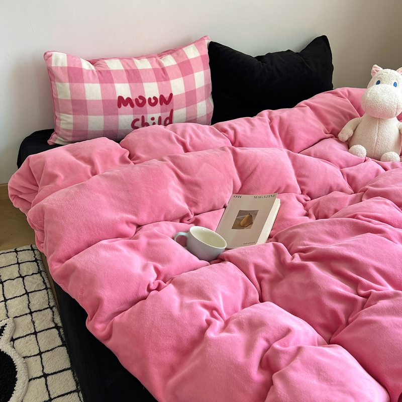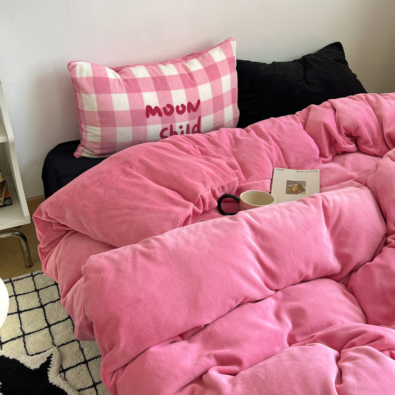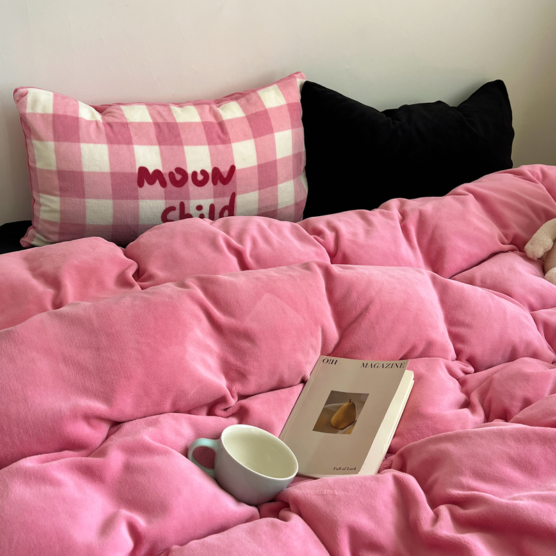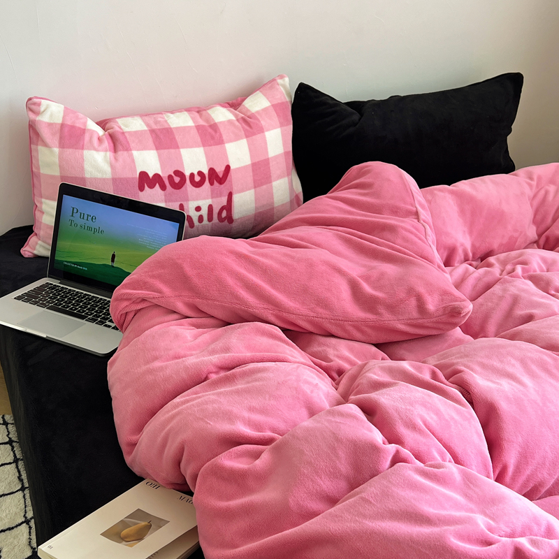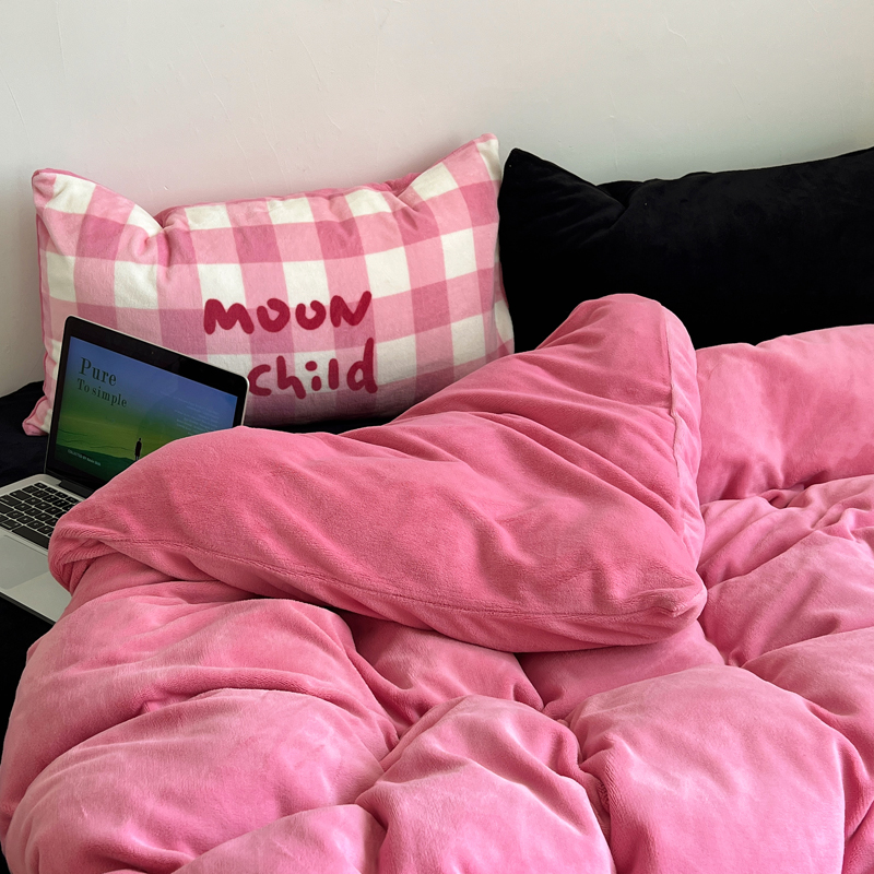 桃喜 2024新款牛奶绒纯色混搭系列四件套 黑粉格子