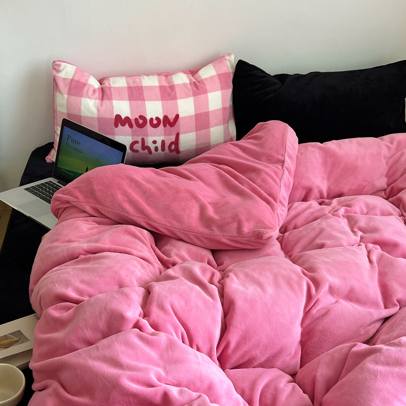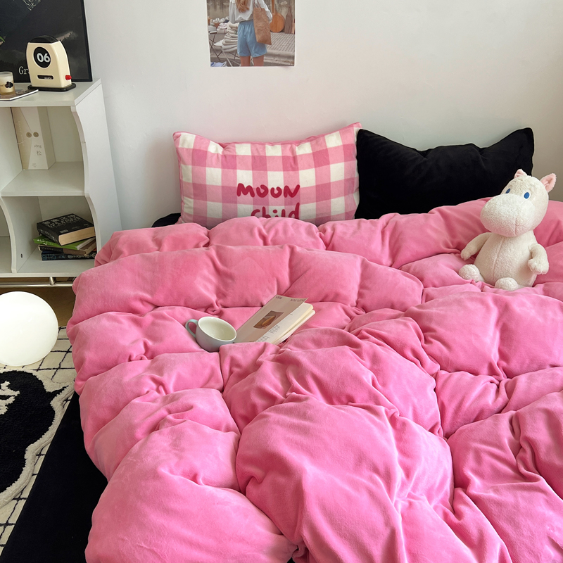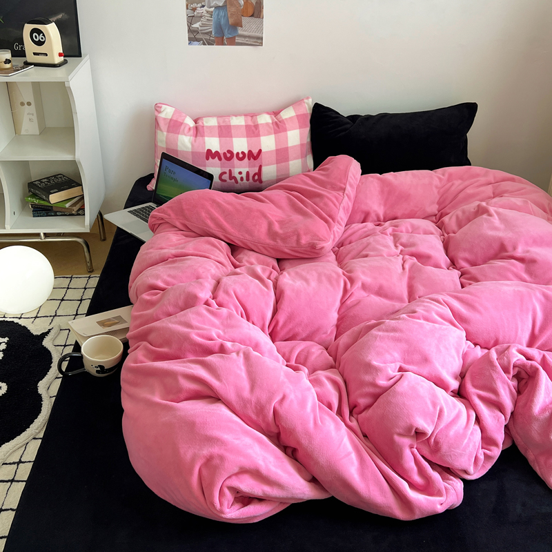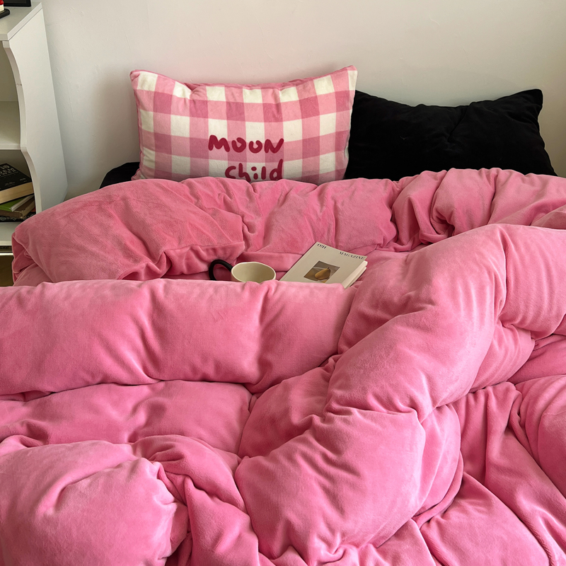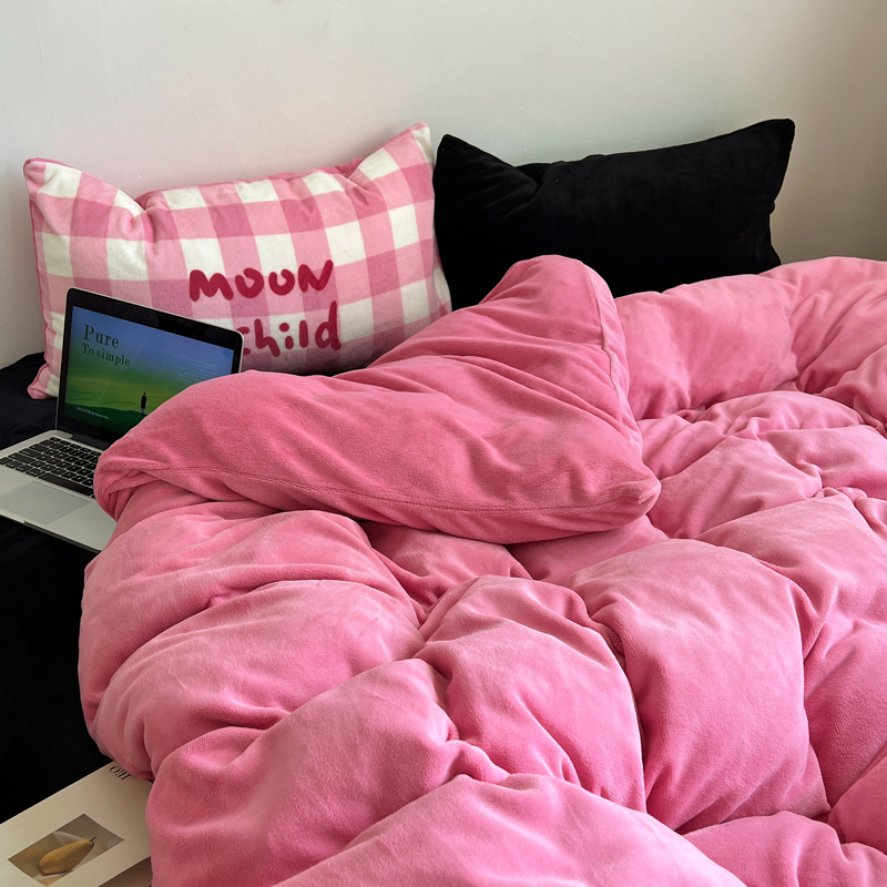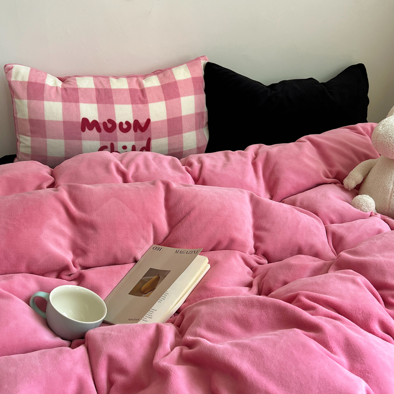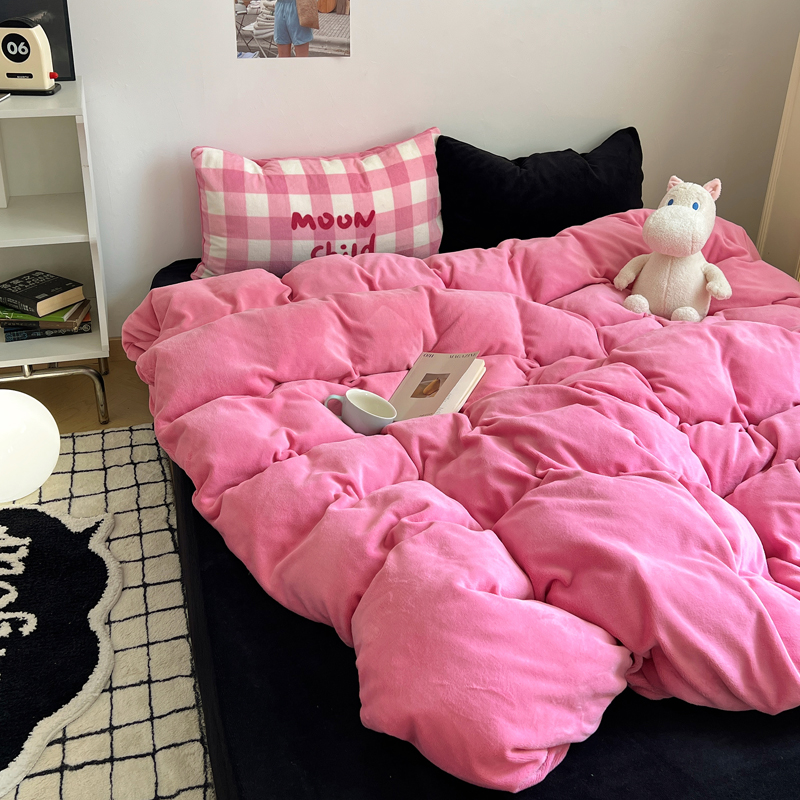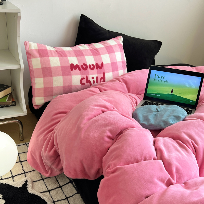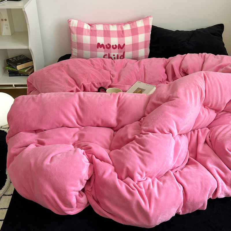 桃喜 2024新款牛奶绒纯色混搭系列四件套 黑粉格子