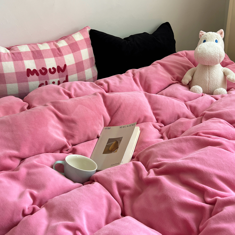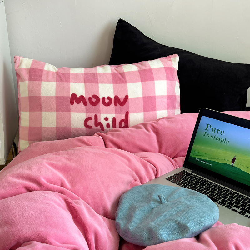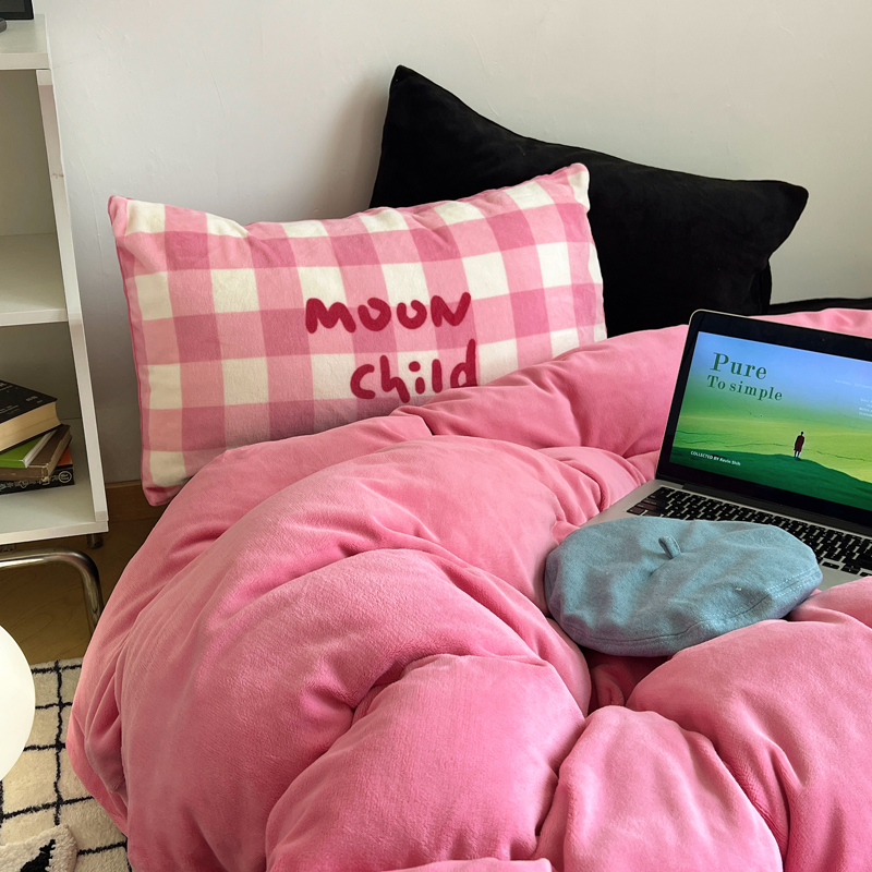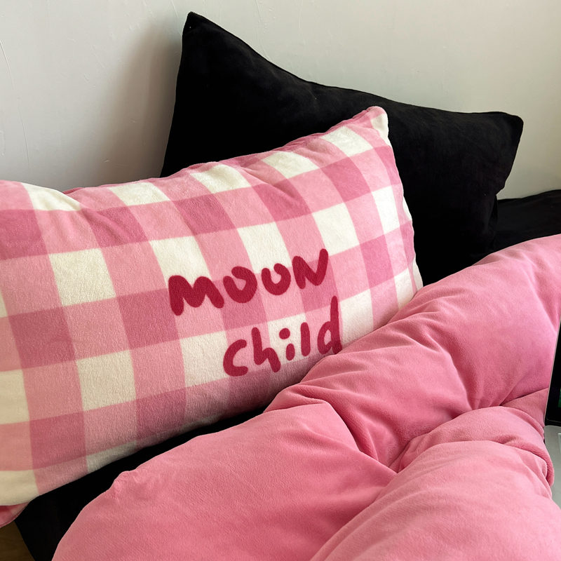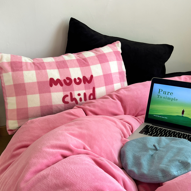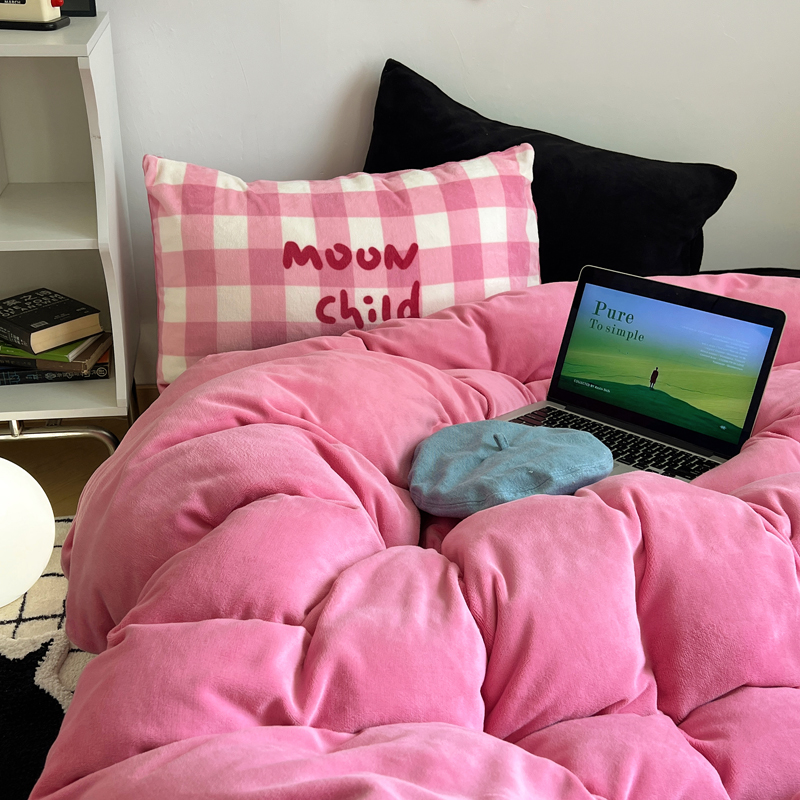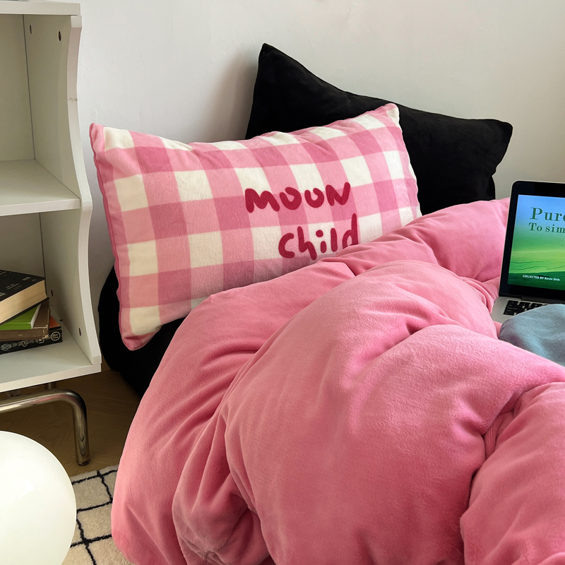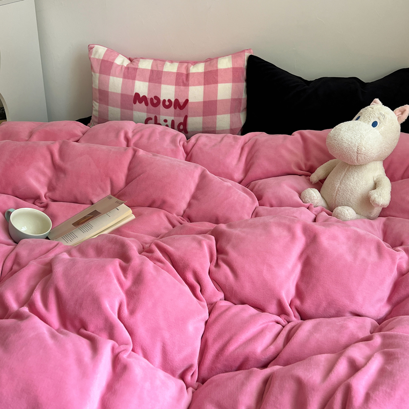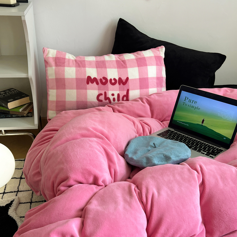 桃喜 2024新款牛奶绒纯色混搭系列四件套 黑粉格子