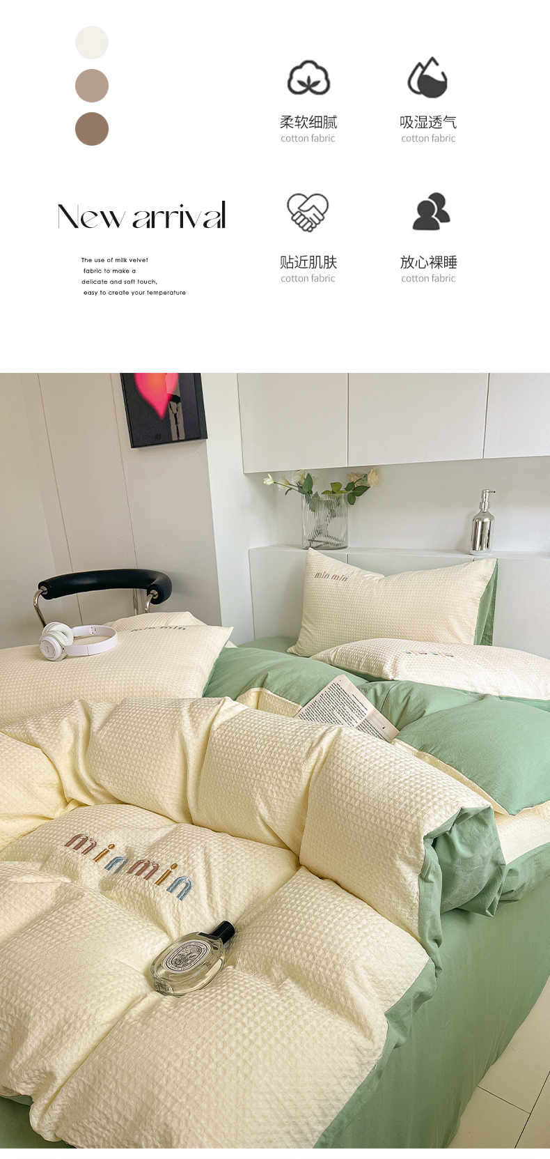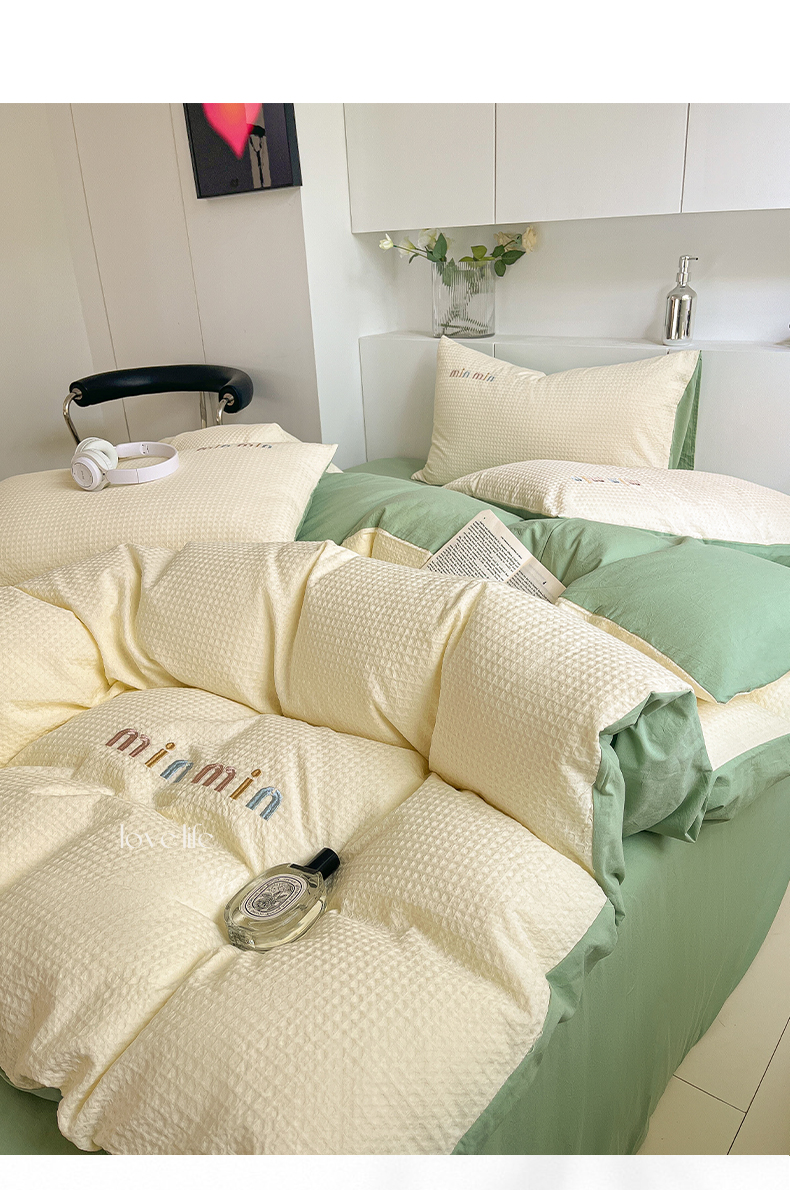 雅居纺家纺 2024新款全棉华夫格绣花四件套 Min-米黄+水绿