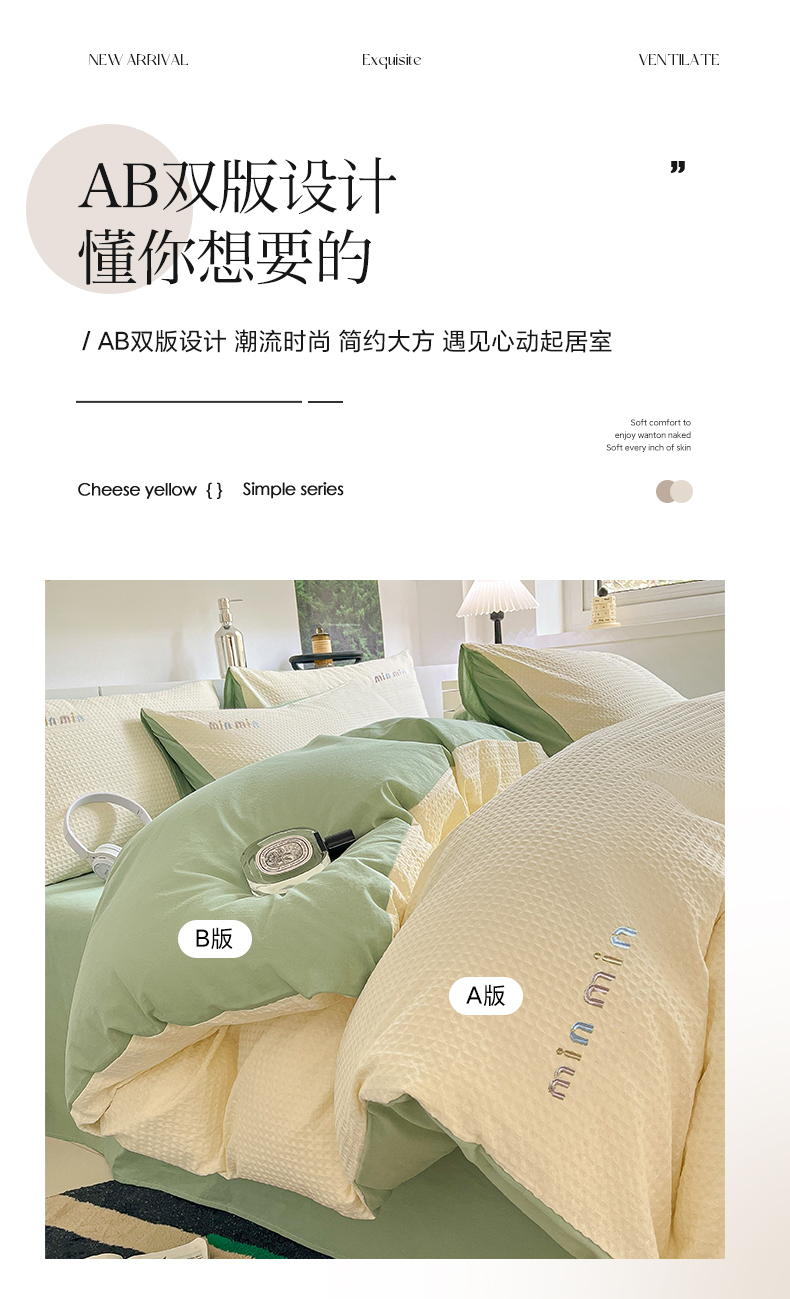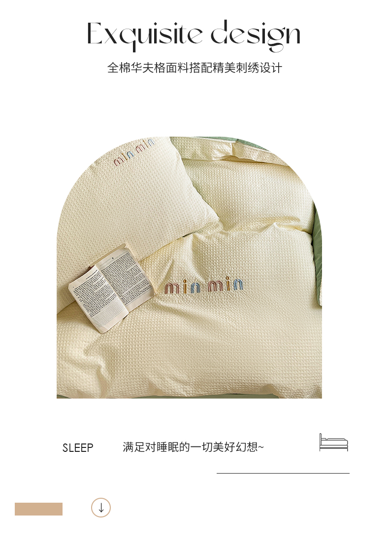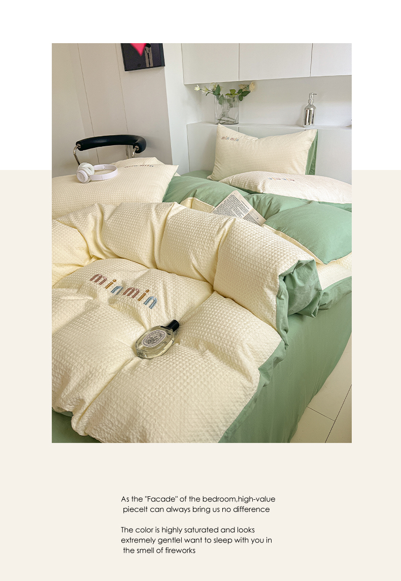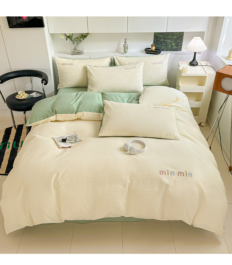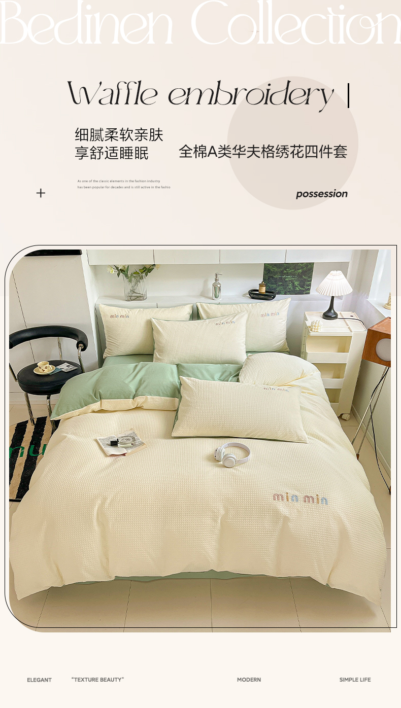商品名称:雅居纺家纺 2024新款全棉华夫格绣花四件套 Min-米黄+水绿