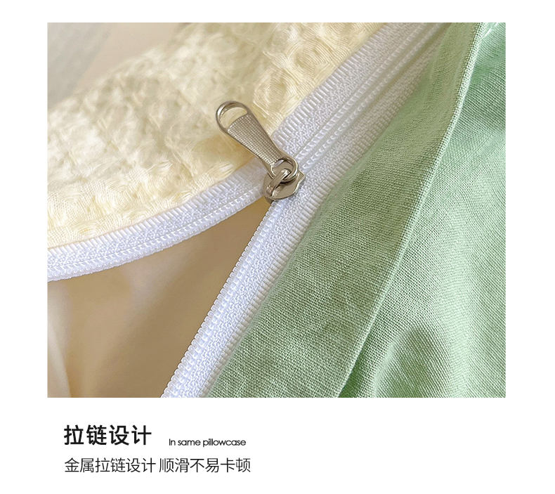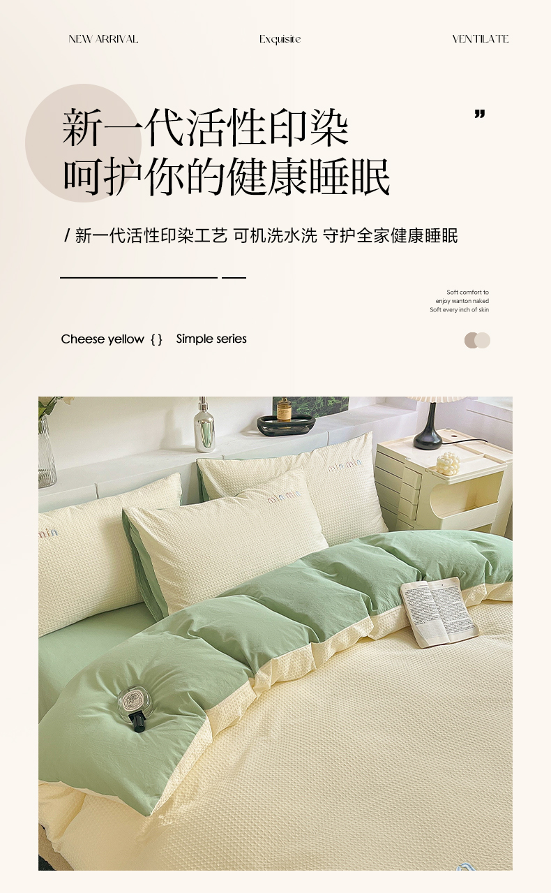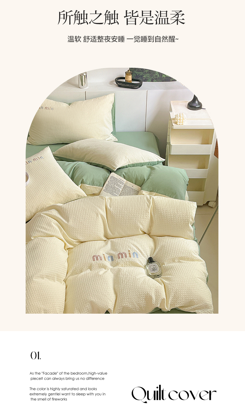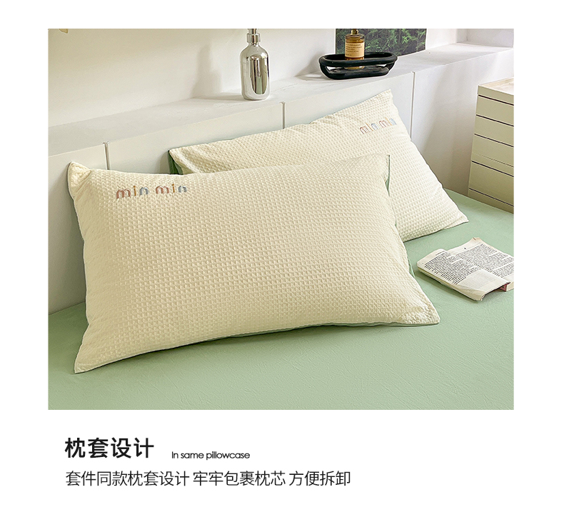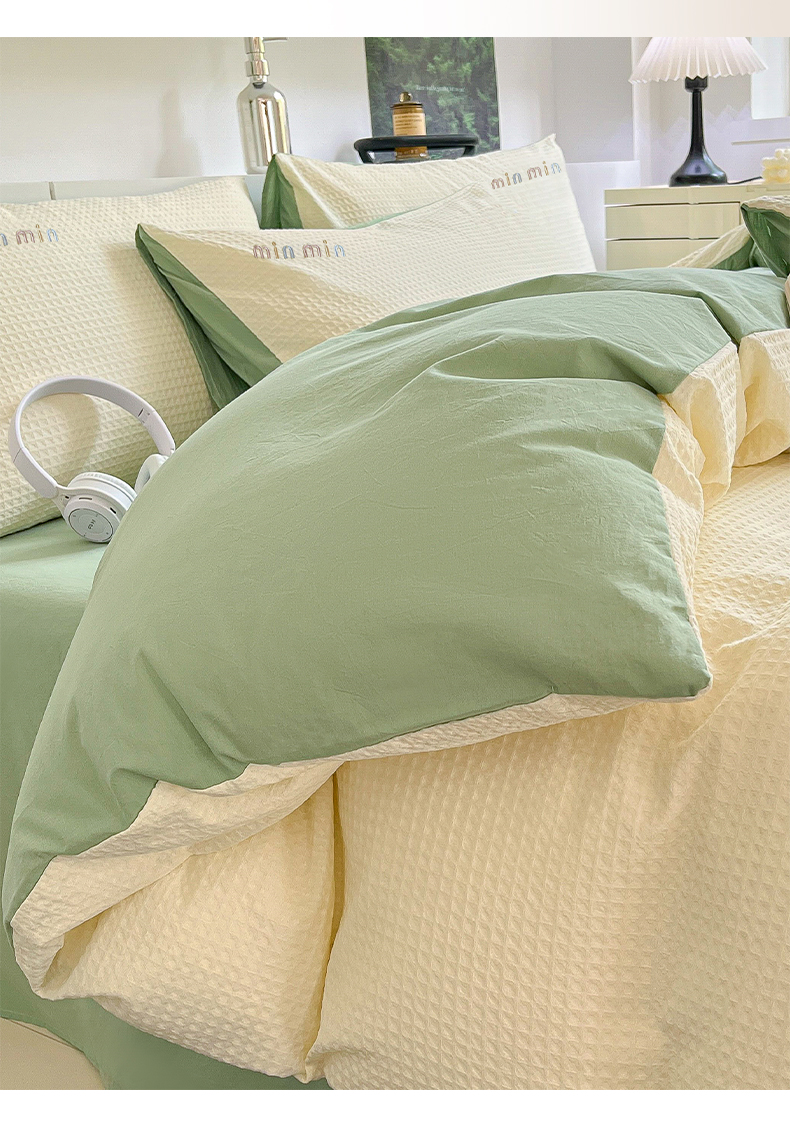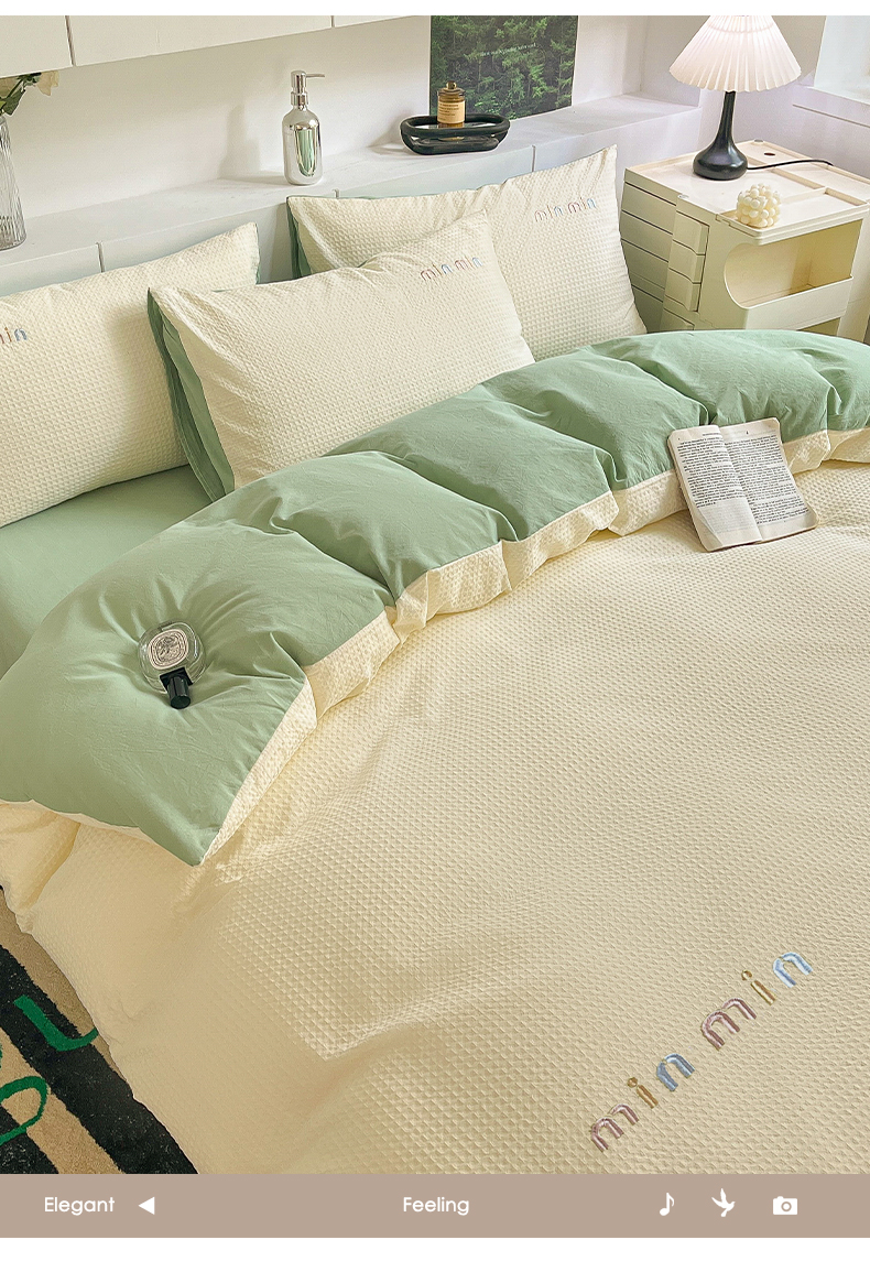 商品名称:雅居纺家纺 2024新款全棉华夫格绣花四件套 Min-米黄+水绿