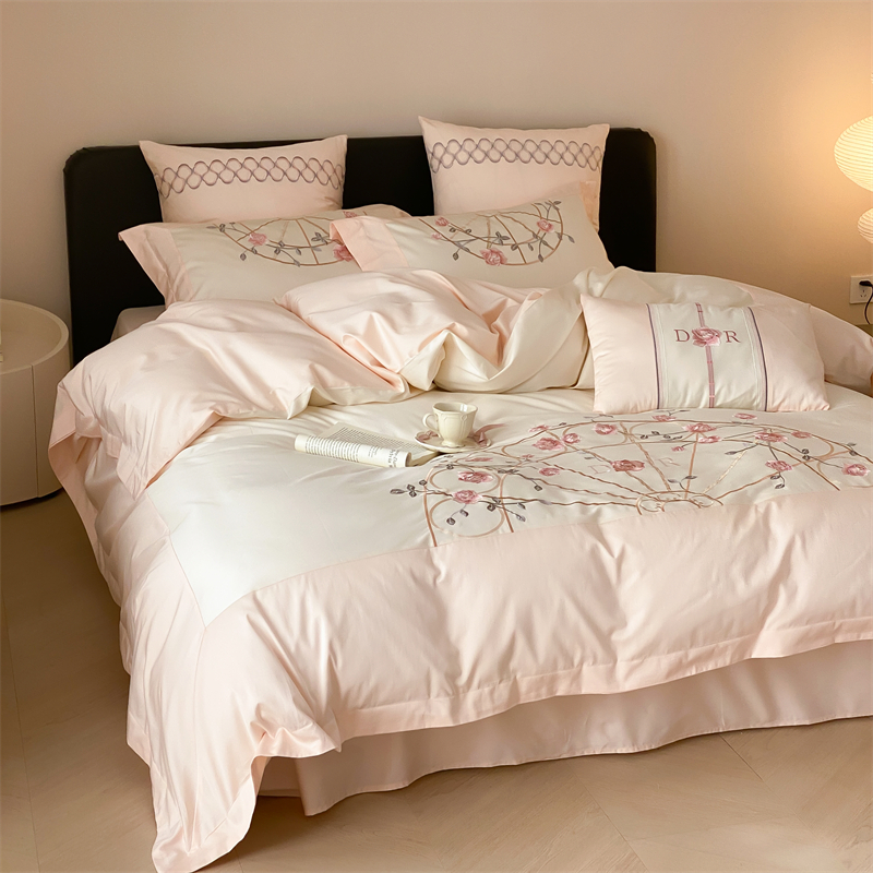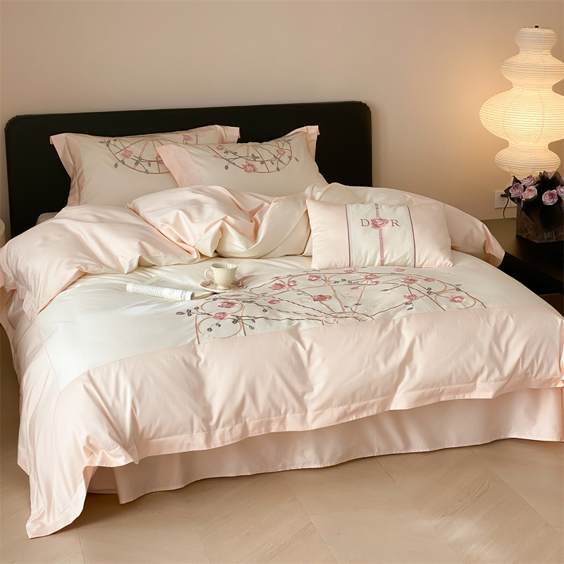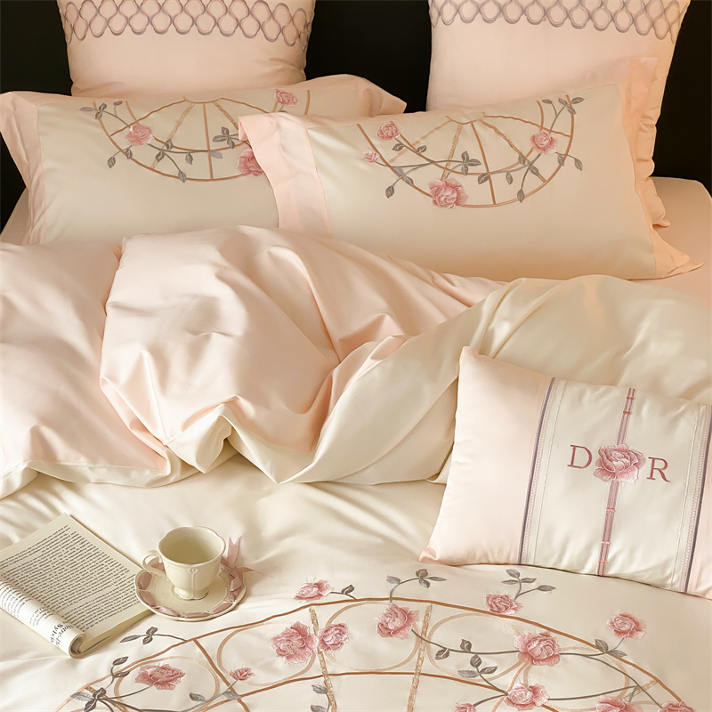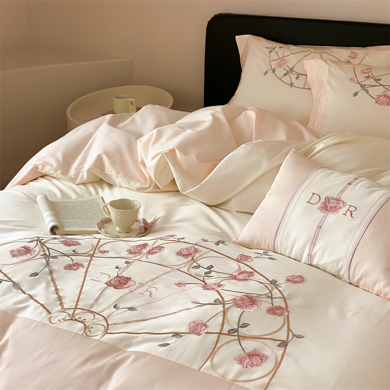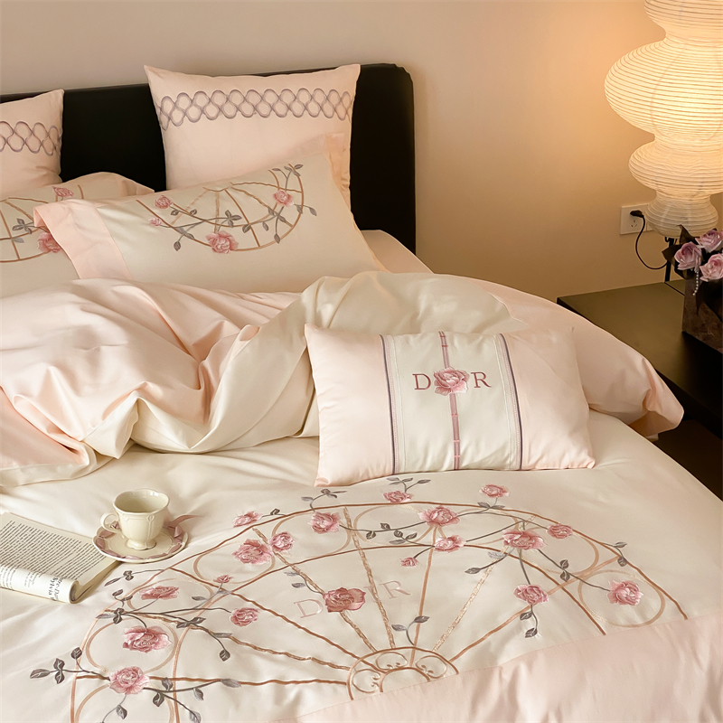 商品名称:曼布缇 2025春夏新品100S澳棉长绒棉绣花四件套-香榭庄园 香榭庄园-粉