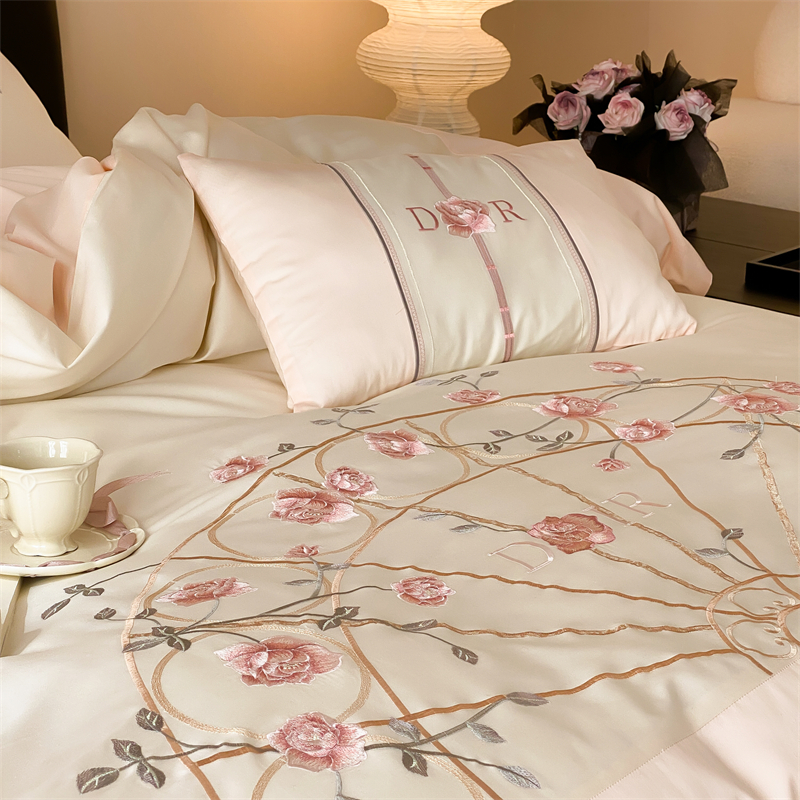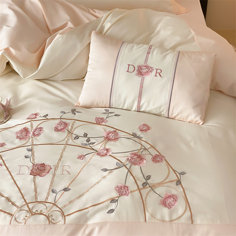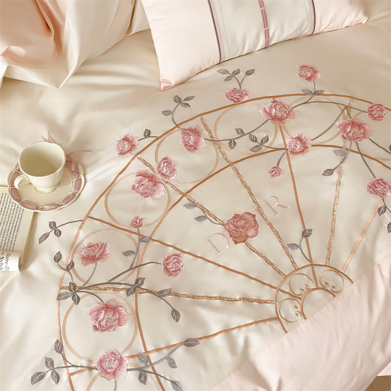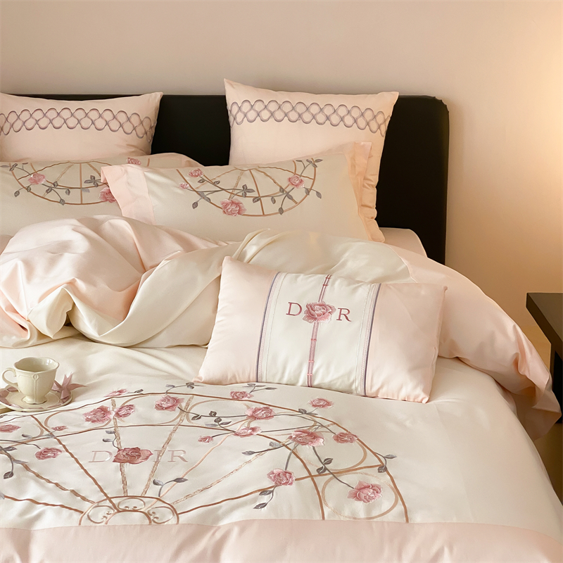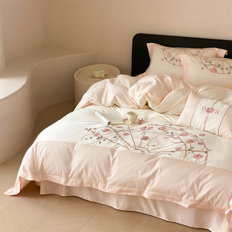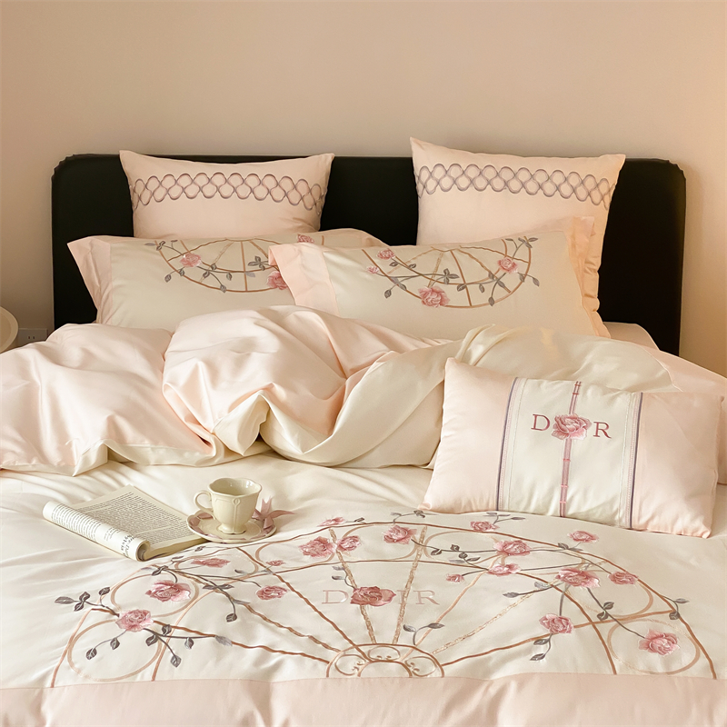 商品名称:曼布缇 2025春夏新品100S澳棉长绒棉绣花四件套-香榭庄园 香榭庄园-粉