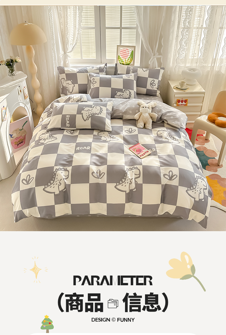商品名称:沐辰 2024新款13372全棉印花四件套(第二批) 格子恐龙