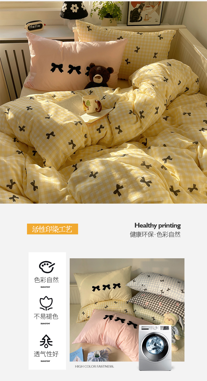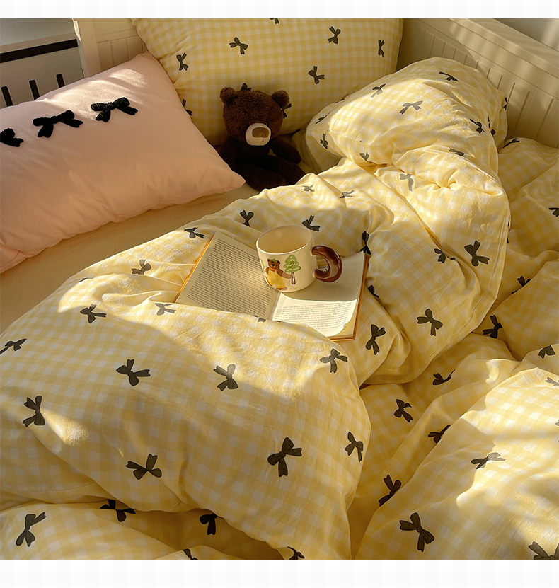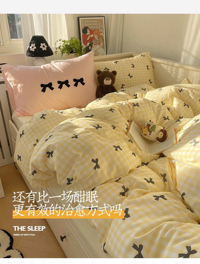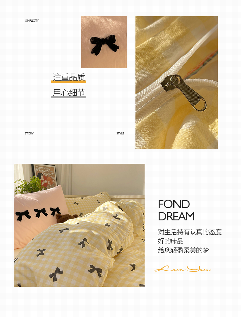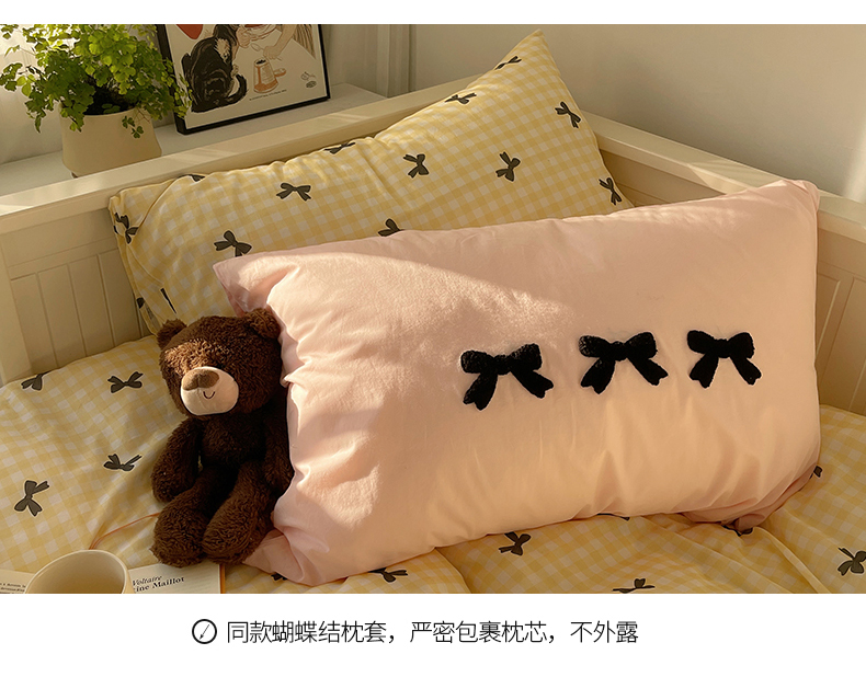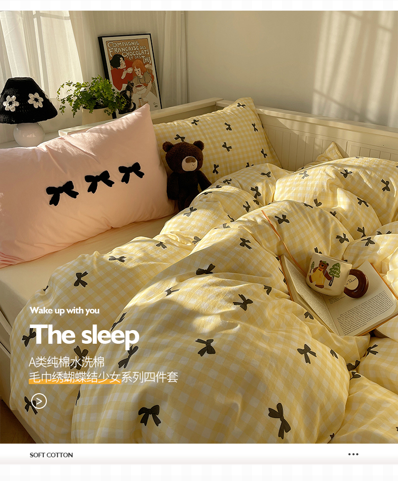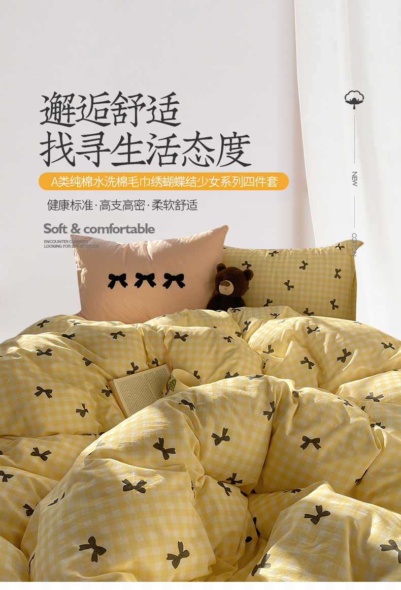 当前位置: 91家纺网 > 商品网购 > 床品套件 > 四件套 > 全棉普通四件套 > 桃子家居 2024新款A类纯棉水洗棉毛巾绣蝴蝶结少女系列四件套 水洗棉-蝴蝶结黄黑+粉黄