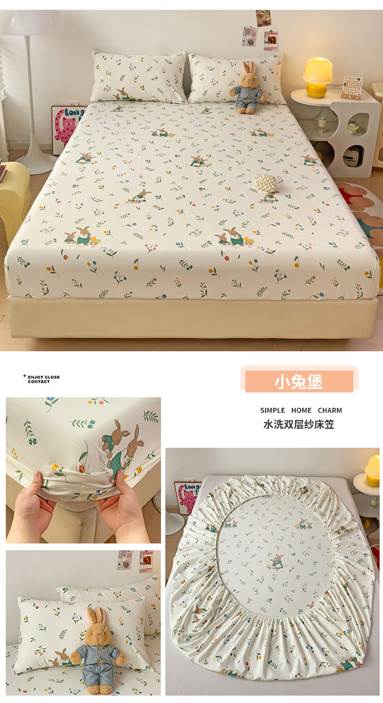纽缦家纺 2024水洗双层纱单床笠 小兔堡