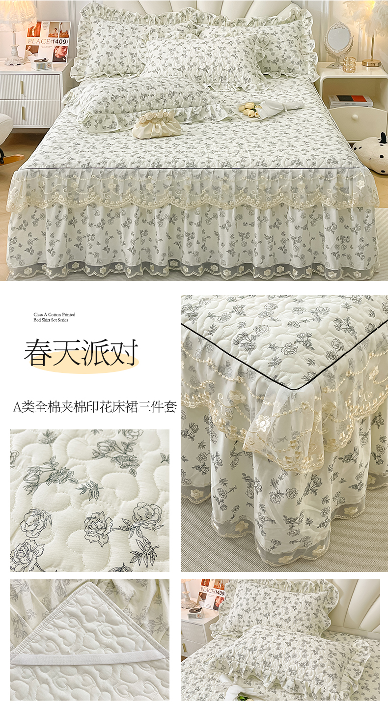 宜凡家纺 2024新款全棉夹棉印花床裙系列三件套 春天派对