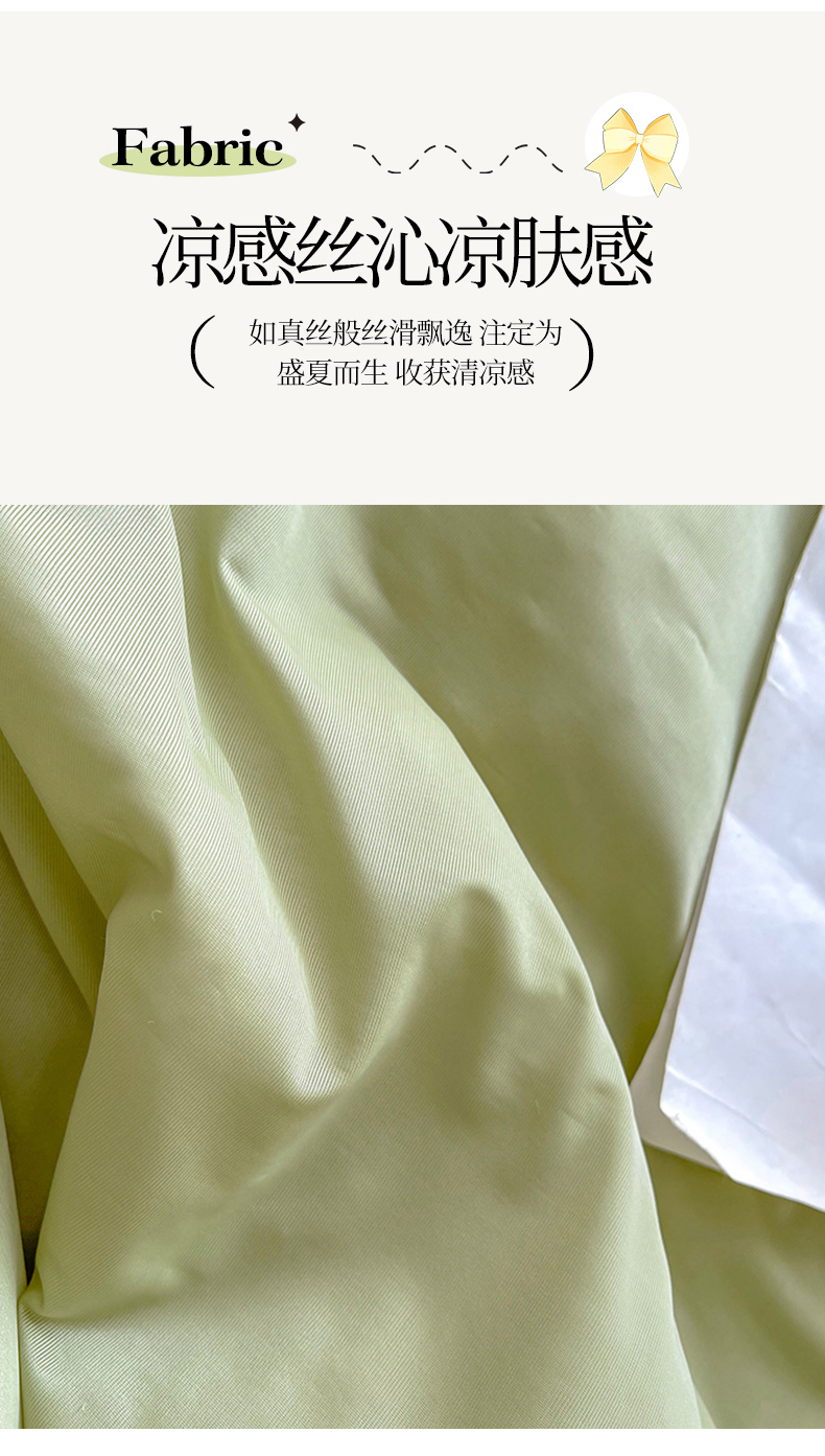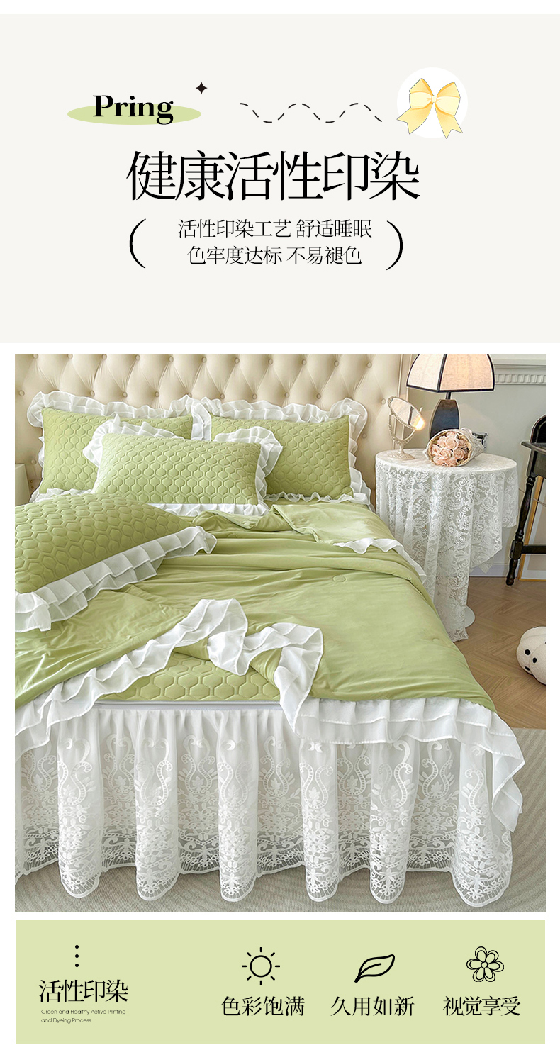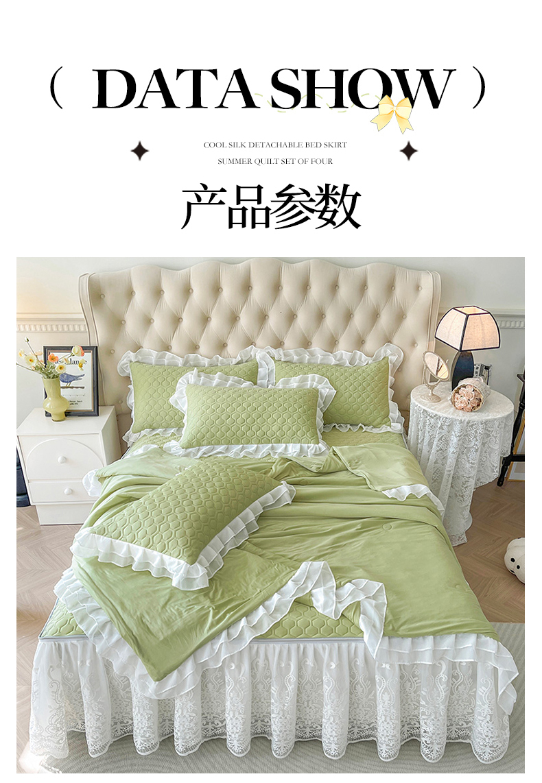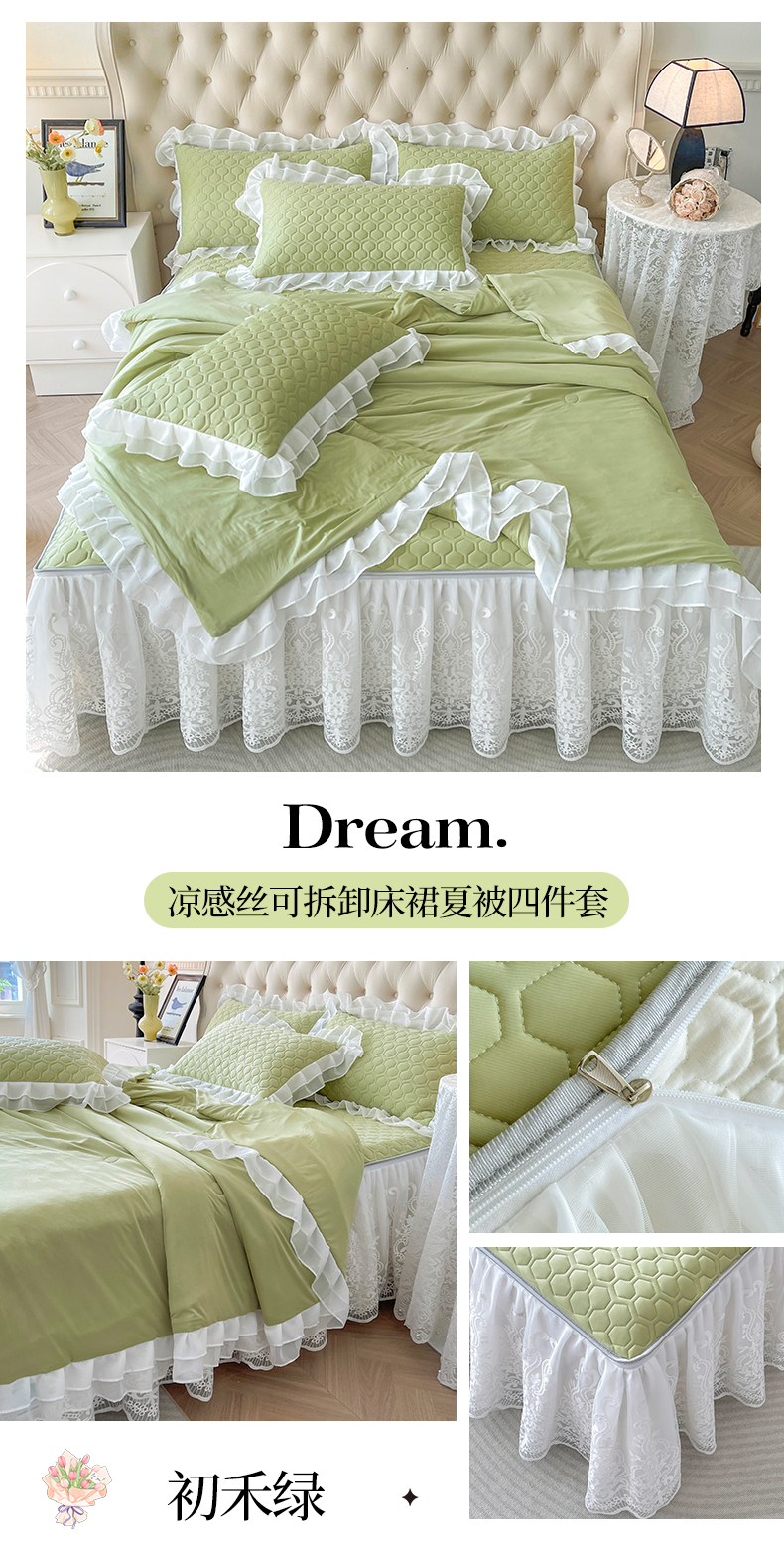 商品名称:虹星家纺 2024新款凉感丝印花可拆床裙套件-夏被凉席四件套 初禾绿