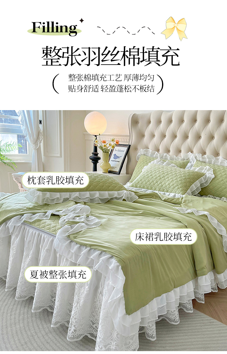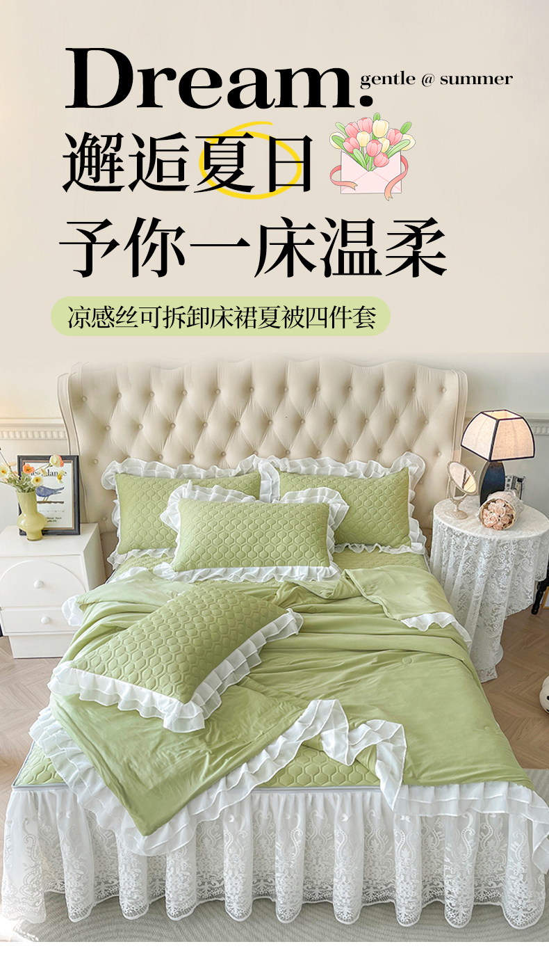 虹星家纺 2024新款凉感丝印花可拆床裙套件-夏被凉席四件套 初禾绿