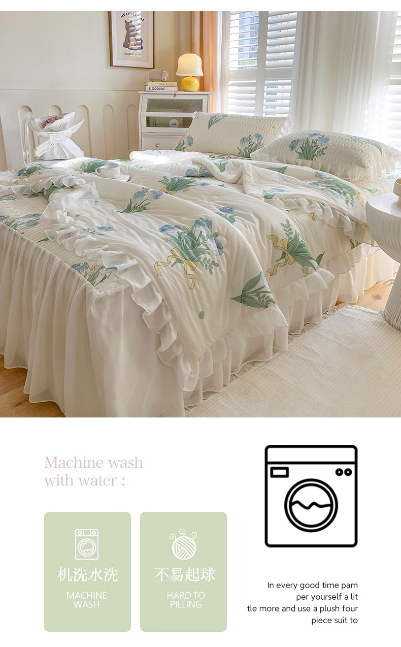 (总)慕澄家纺 2022新款华夫格雪纺花边四件套,湖水绿,魅惑紫,奶白色,奶黄色,浅豆沙,情调灰,天空蓝,樱花粉