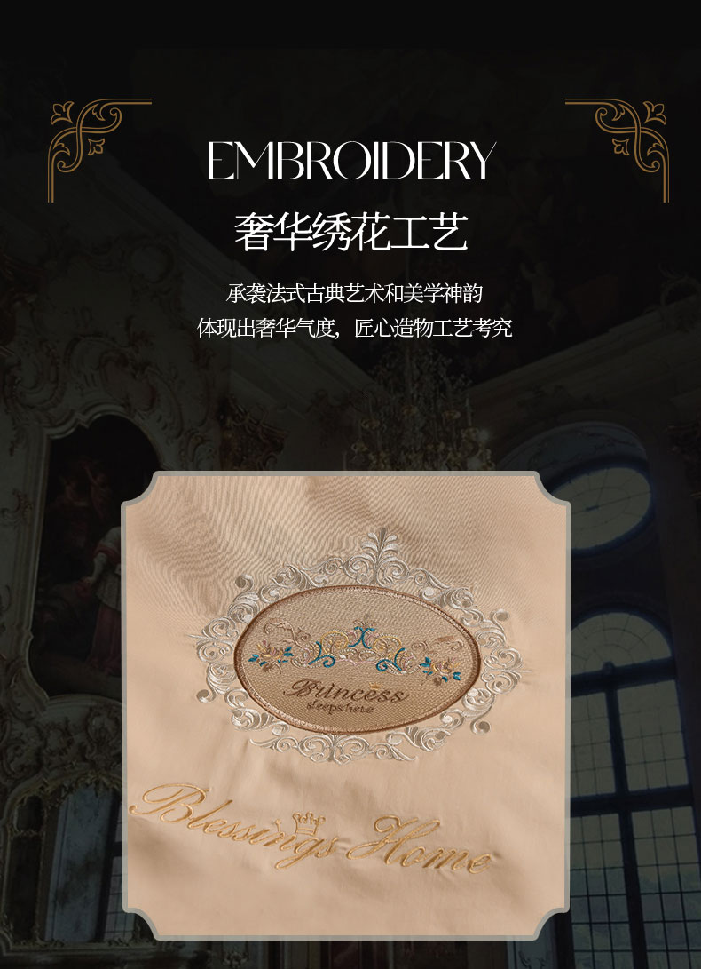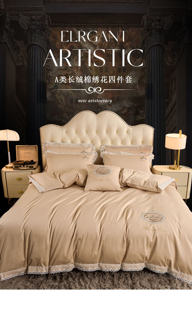 商品名称:瑞驰家纺 2024新款长绒棉爱丽丝公主四件套系列 精美法式轻奢风四件套系列 爱丽丝公主-香槟金