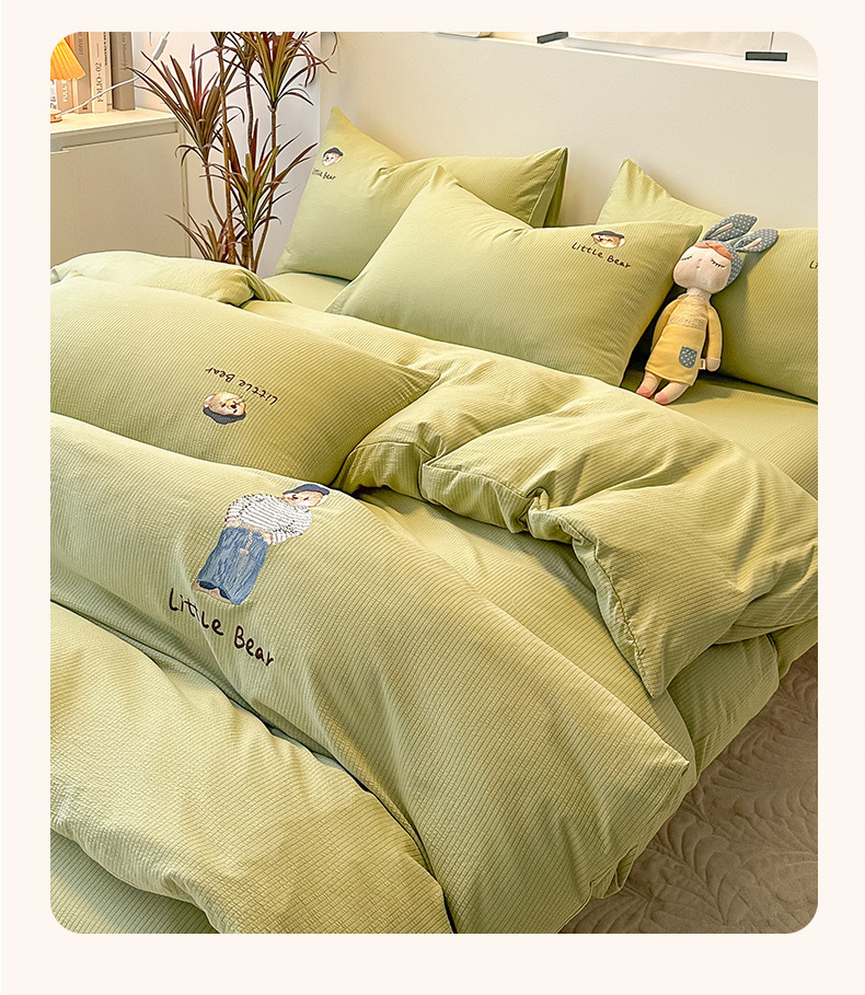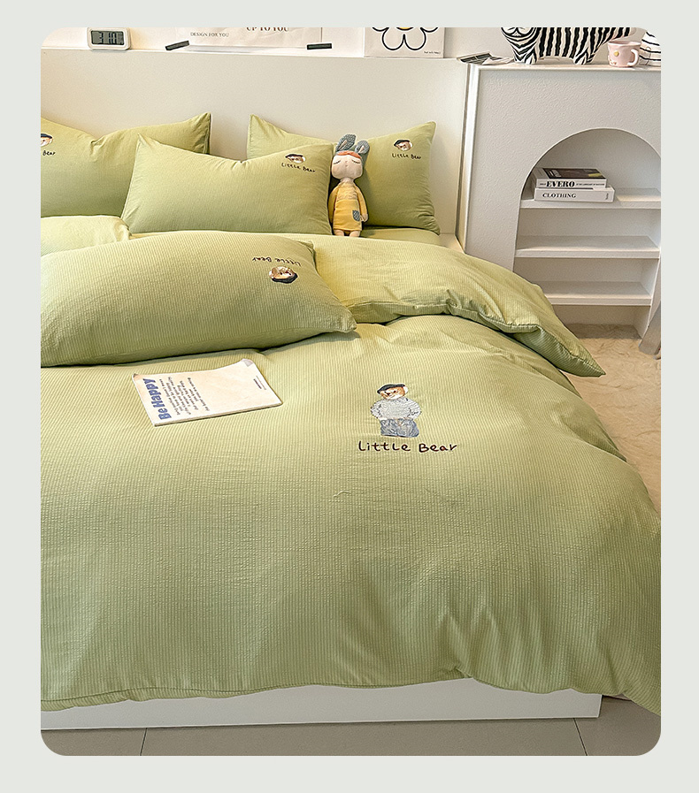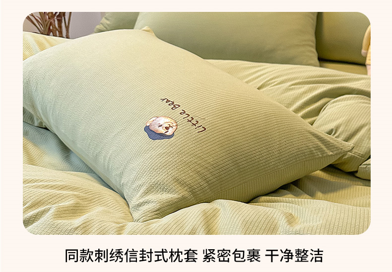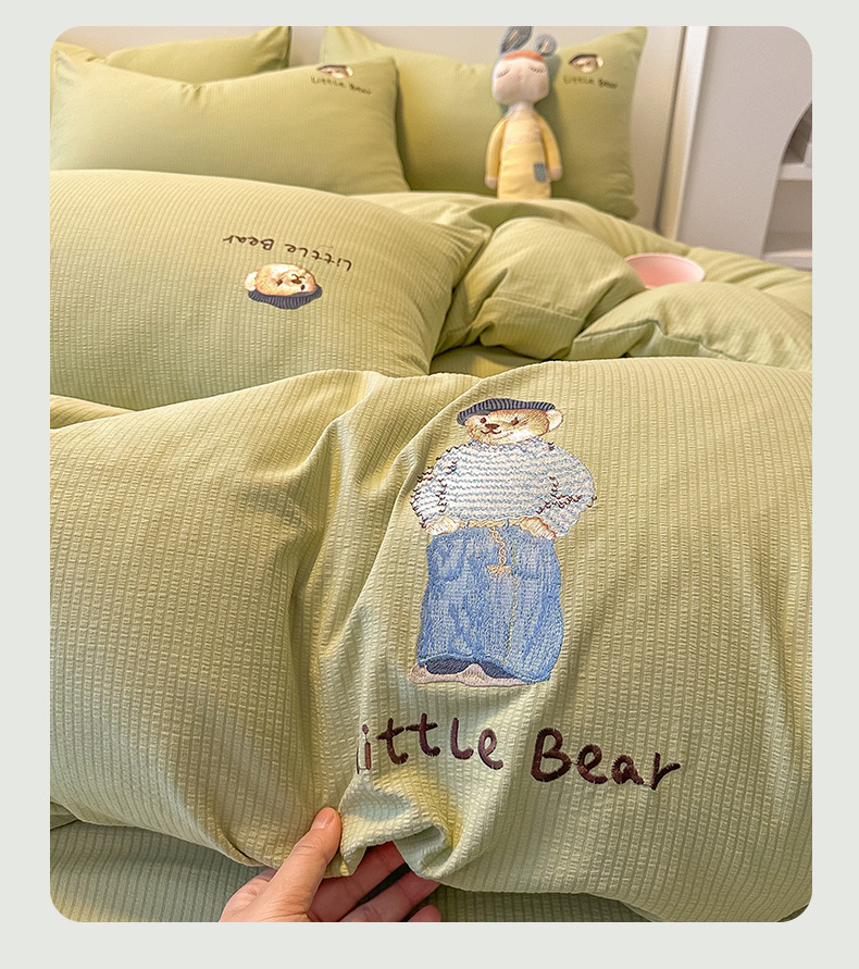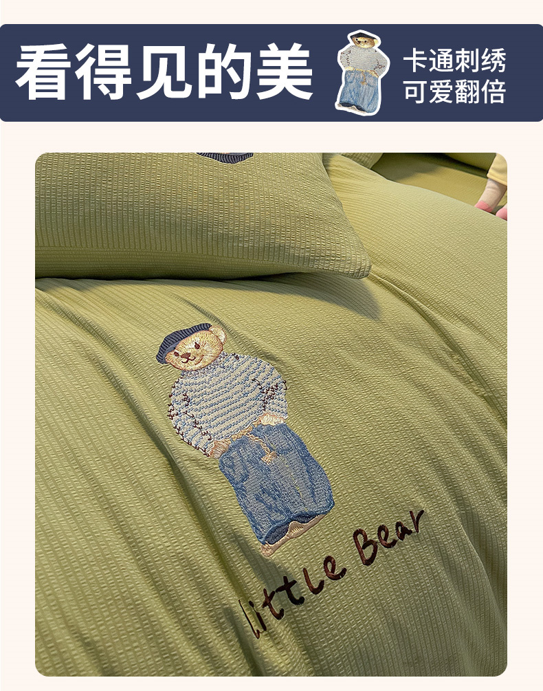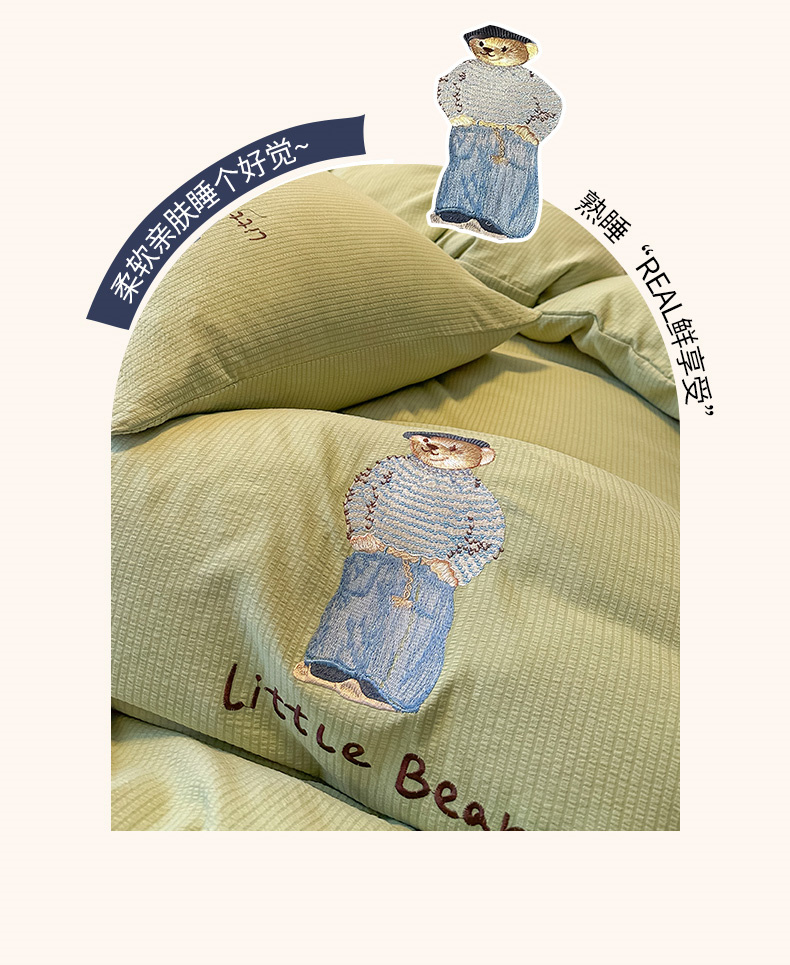 当前位置: 91家纺网 > 商品网购 > 床品套件 > 四件套 > 水洗棉四件套 > 眠帛家居 2024新款水洗棉提花刺绣四件套-熊先生 熊先生-奶油绿