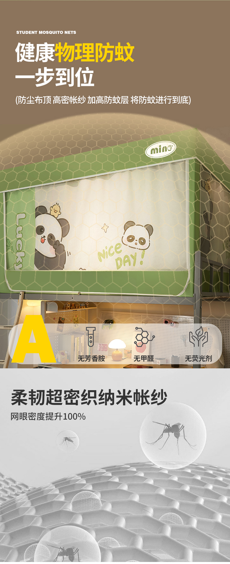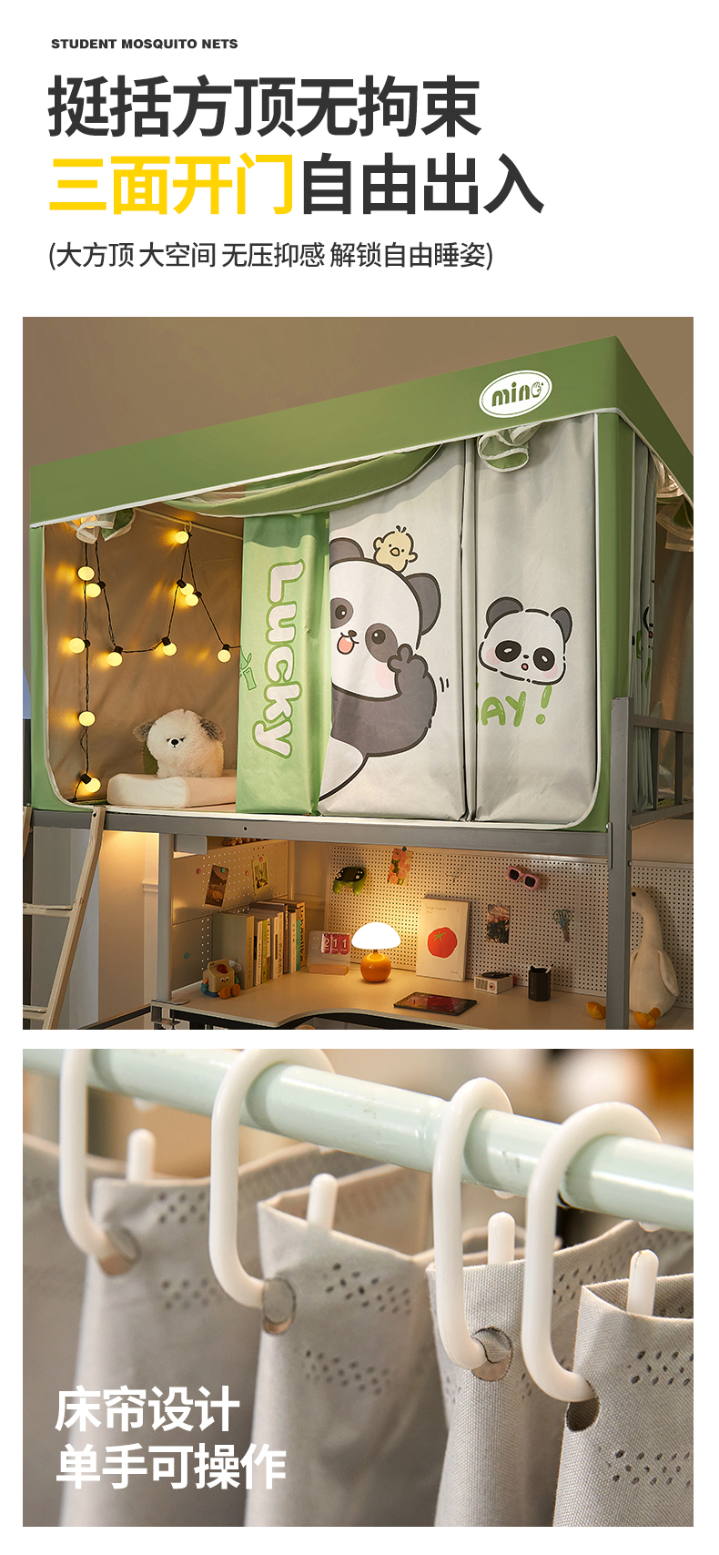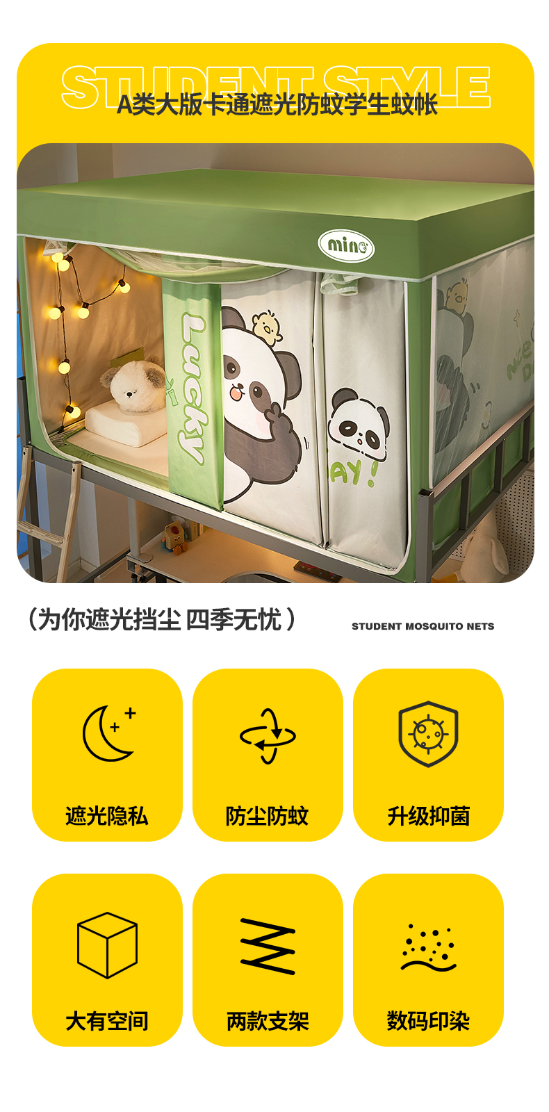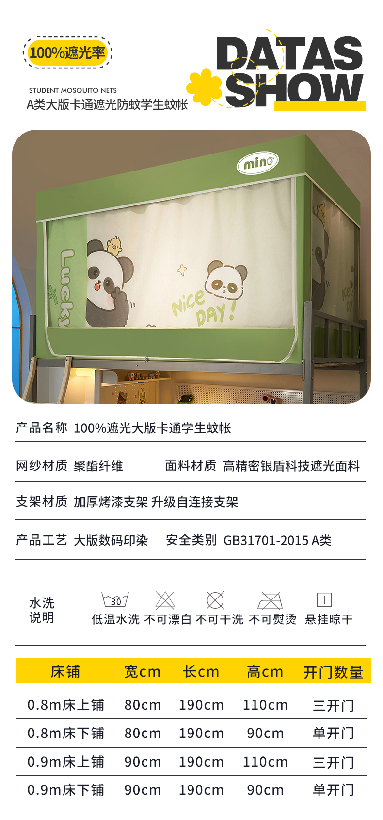 商品名称:2025新款A类大版卡通超强遮光防蚊学生坐床蚊帐 摆拍熊猫