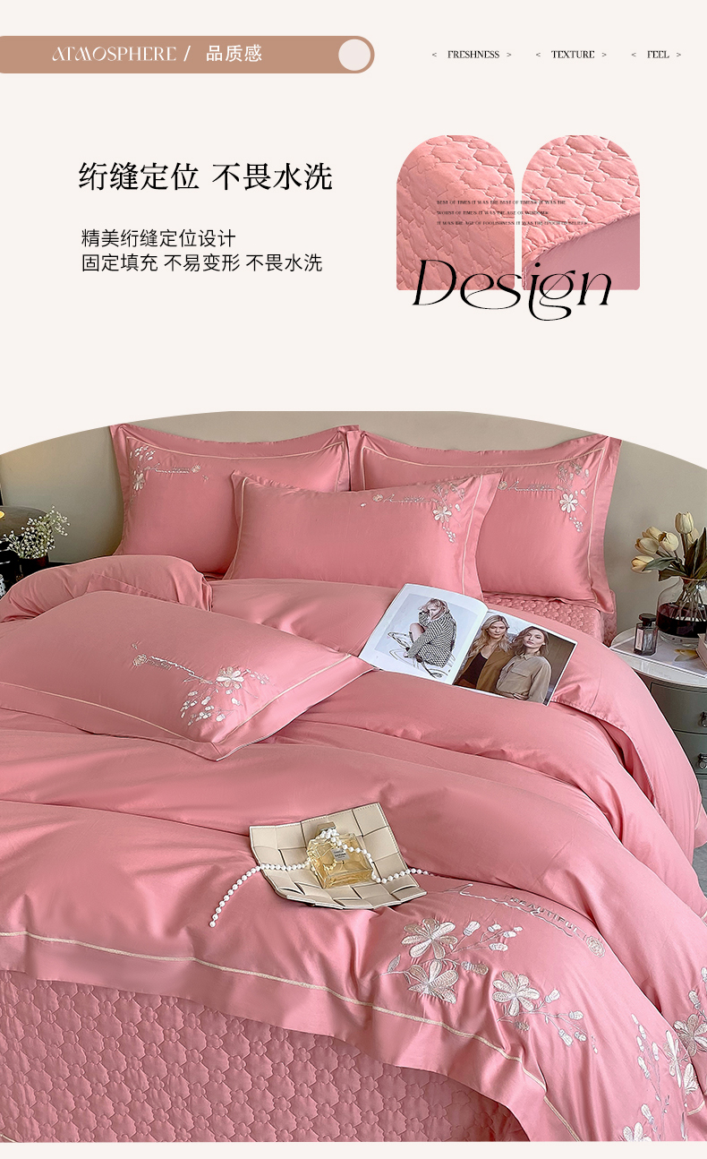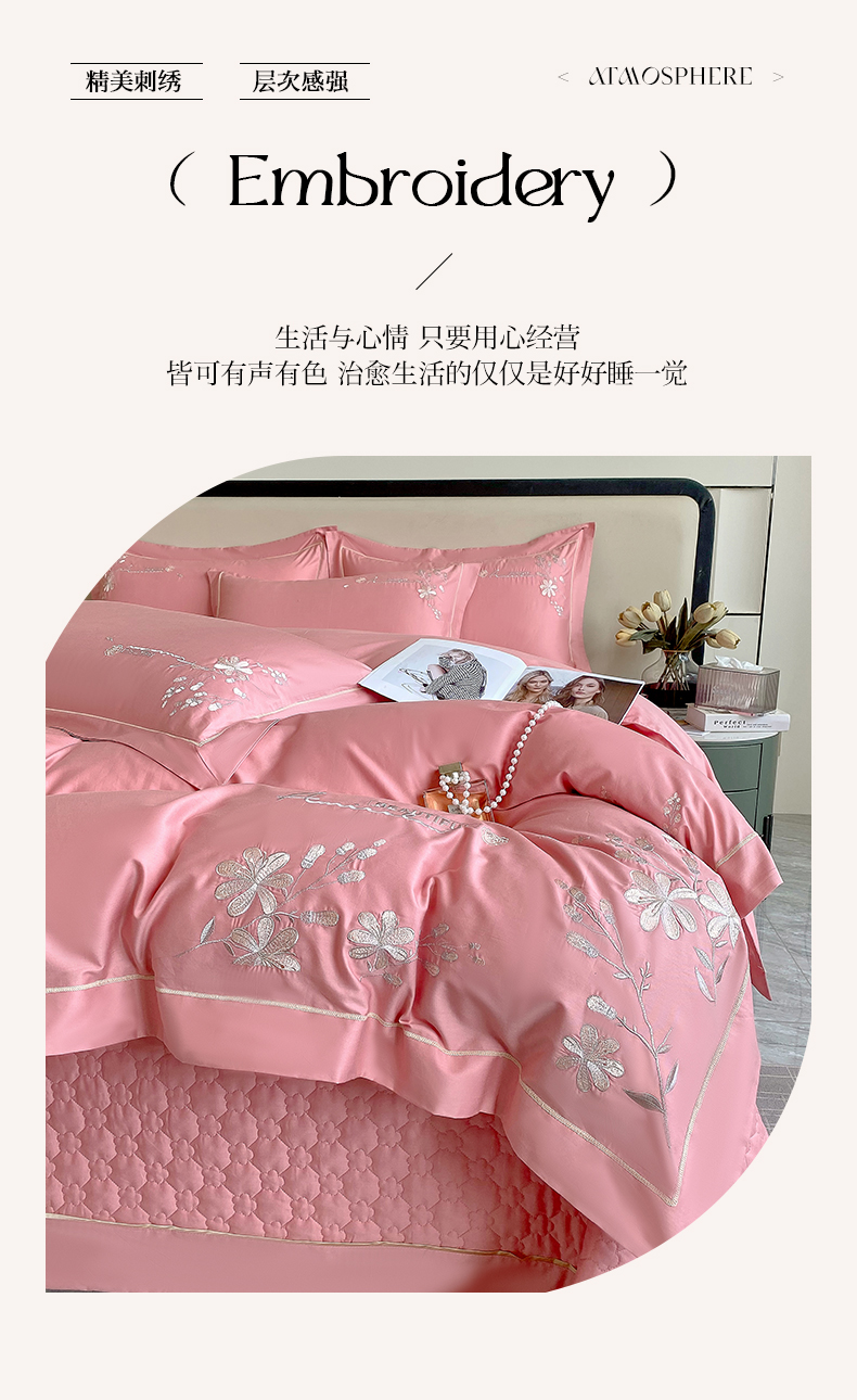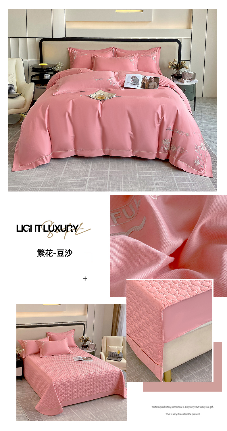 商品名称:小时代家纺 2024新款13376全活性喷气简约轻奢刺绣夹棉床盖四件套-繁花 繁花-豆沙