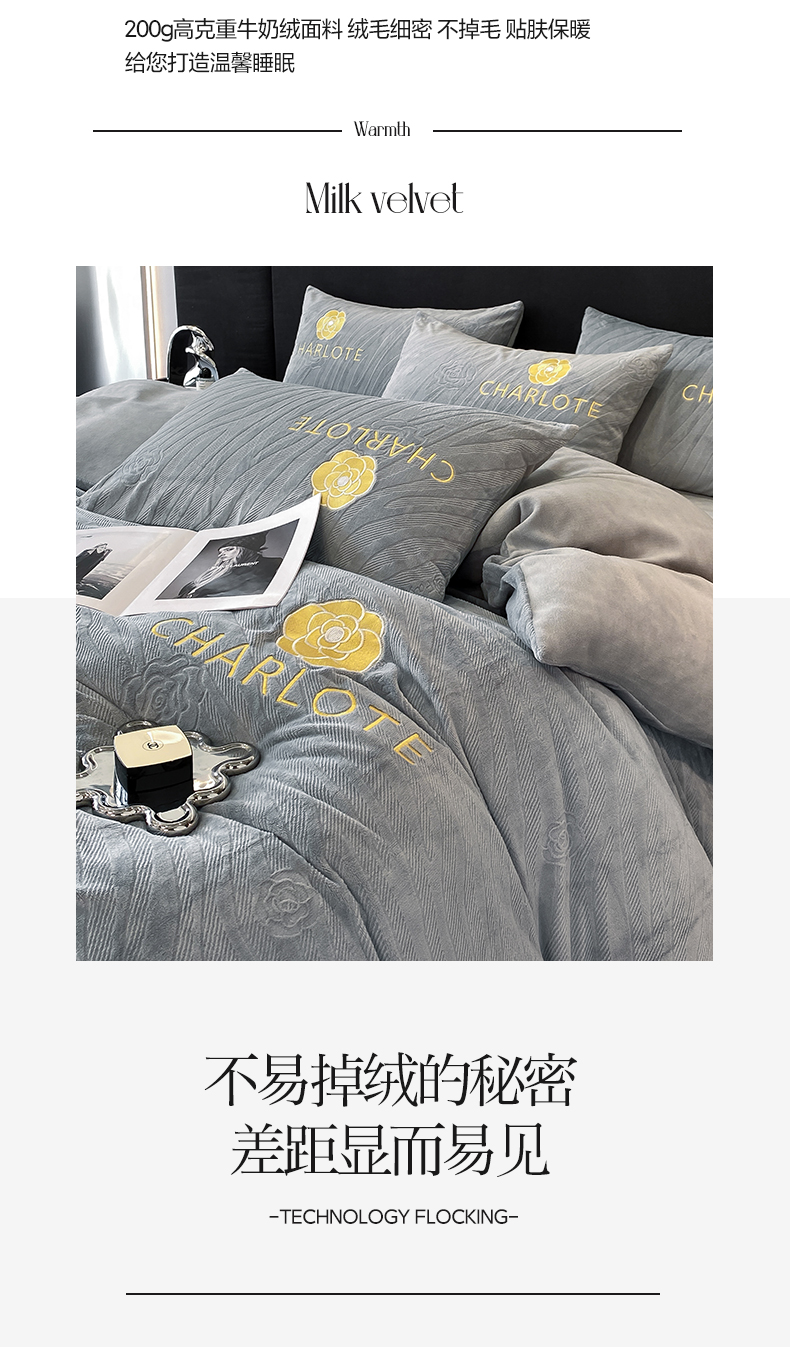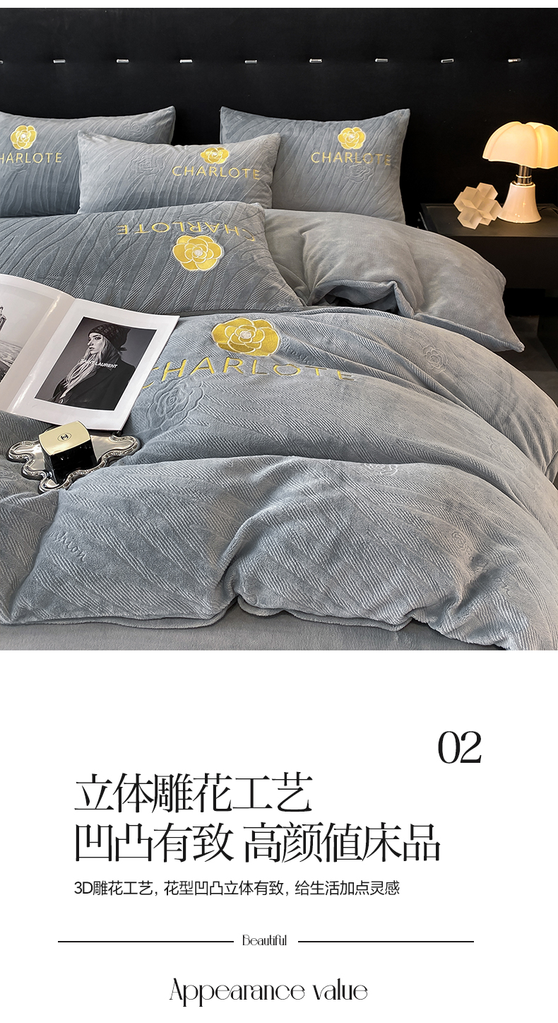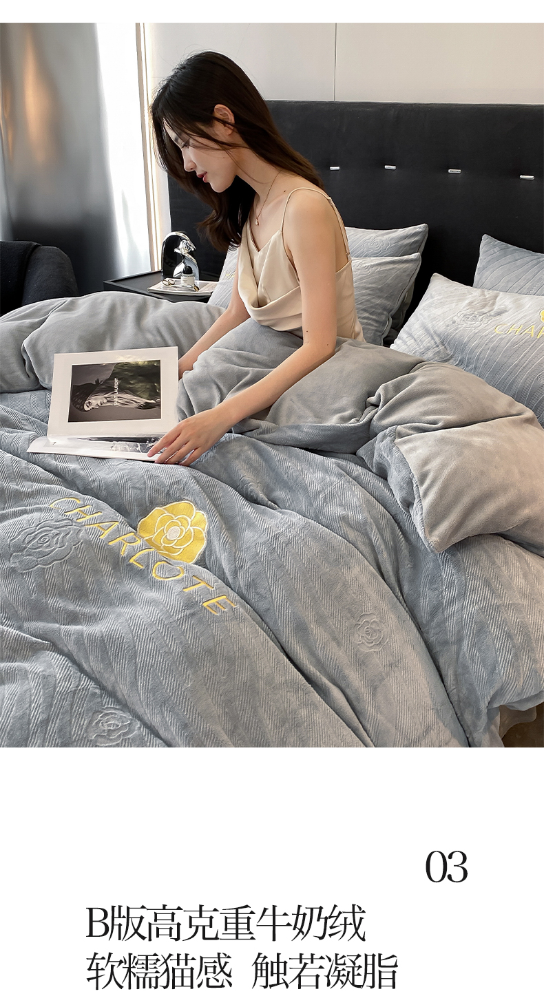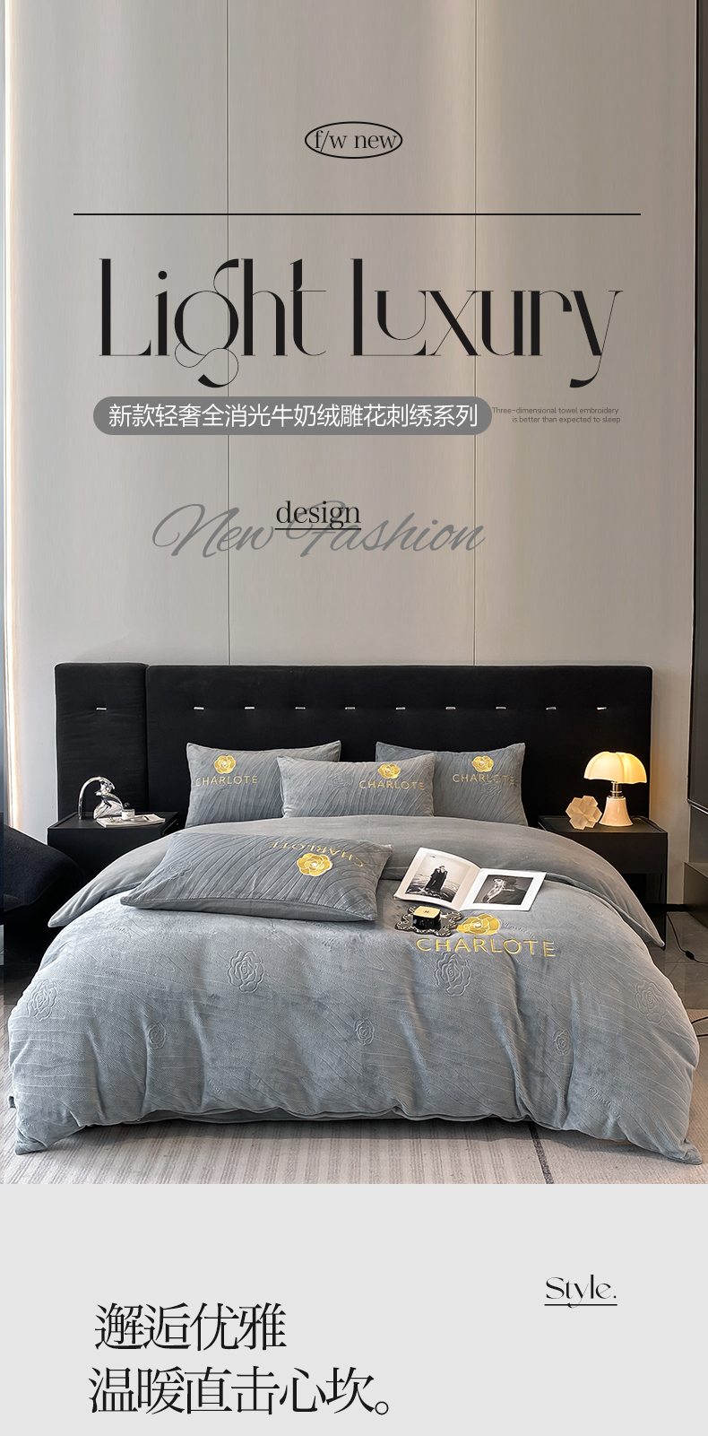当前位置: 91家纺网 > 商品网购 > 床品套件 > 四件套 > 牛奶绒四件套 > 2024新款牛奶绒雕花轻奢刺绣三件套四件套 瑞丽浅灰