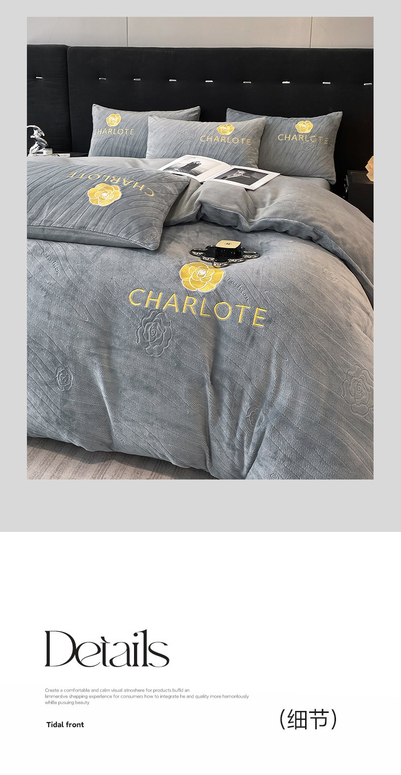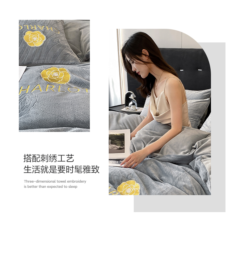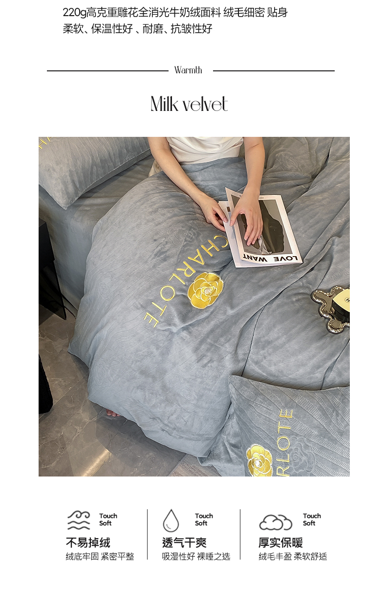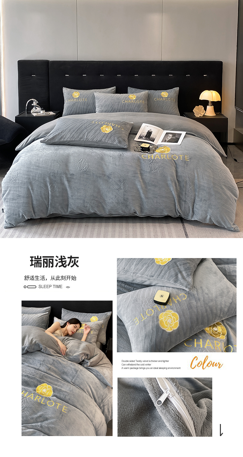 当前位置: 91家纺网 > 商品网购 > 床品套件 > 四件套 > 牛奶绒四件套 > 2024新款牛奶绒雕花轻奢刺绣三件套四件套 瑞丽浅灰