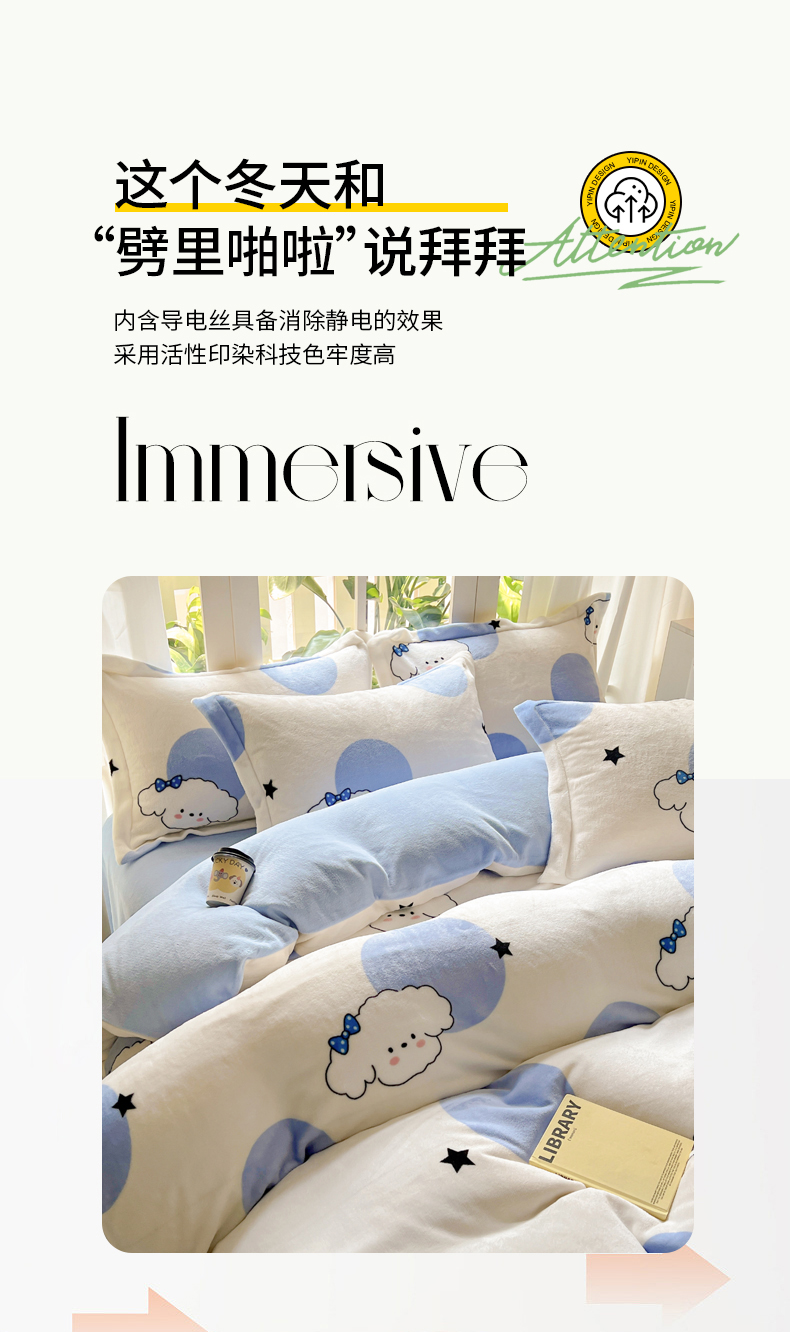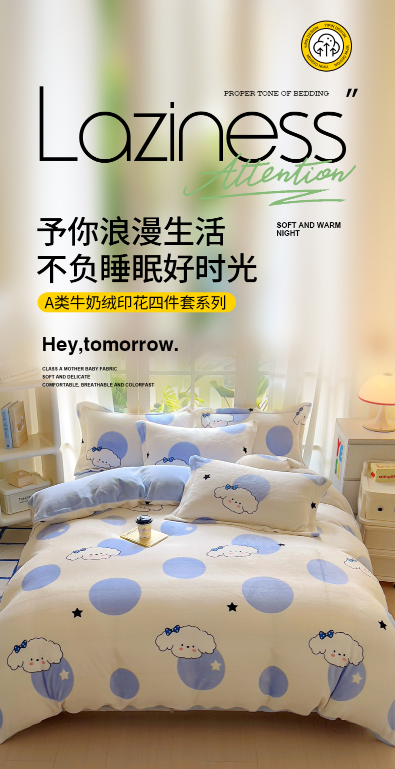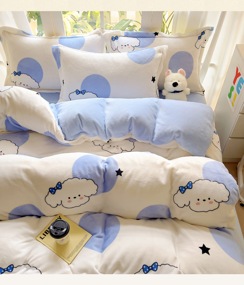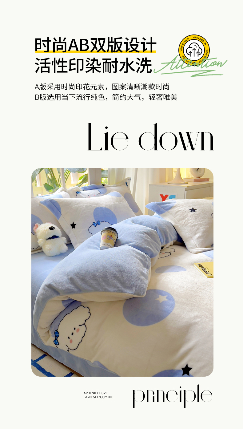 当前位置: 91家纺网 > 商品网购 > 床品套件 > 四件套 > 牛奶绒四件套 > 丝羽坊 2024新款加厚小清新牛奶绒印花四件套单被套床笠四件套-场景二 萌宠