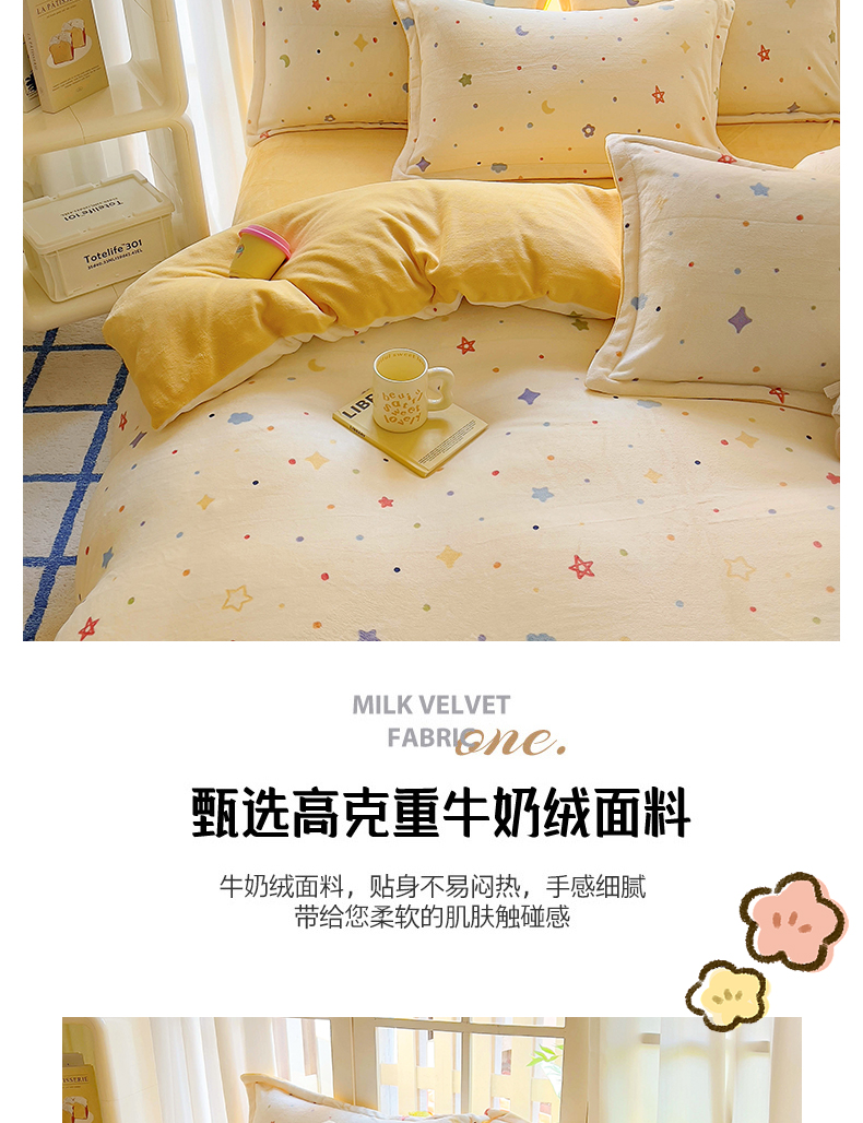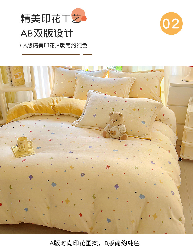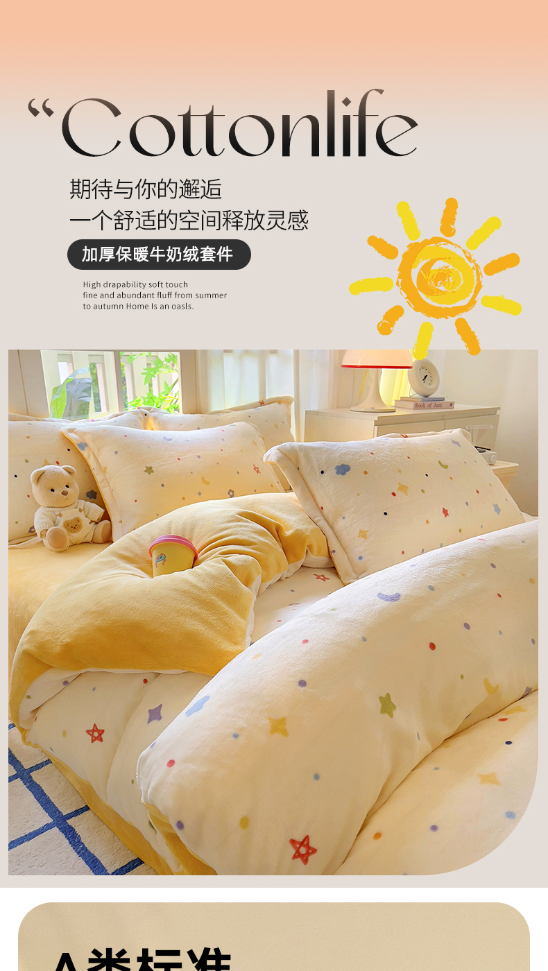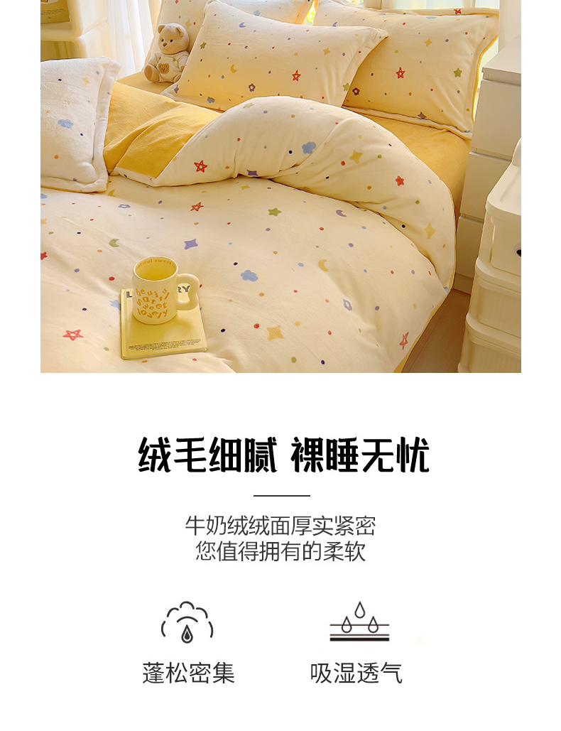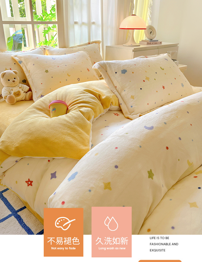 当前位置: 91家纺网 > 商品网购 > 床品套件 > 四件套 > 牛奶绒四件套 > 百寐 2024新款加厚A类牛奶绒印花卡通床单床笠四件套三件套 点点星空