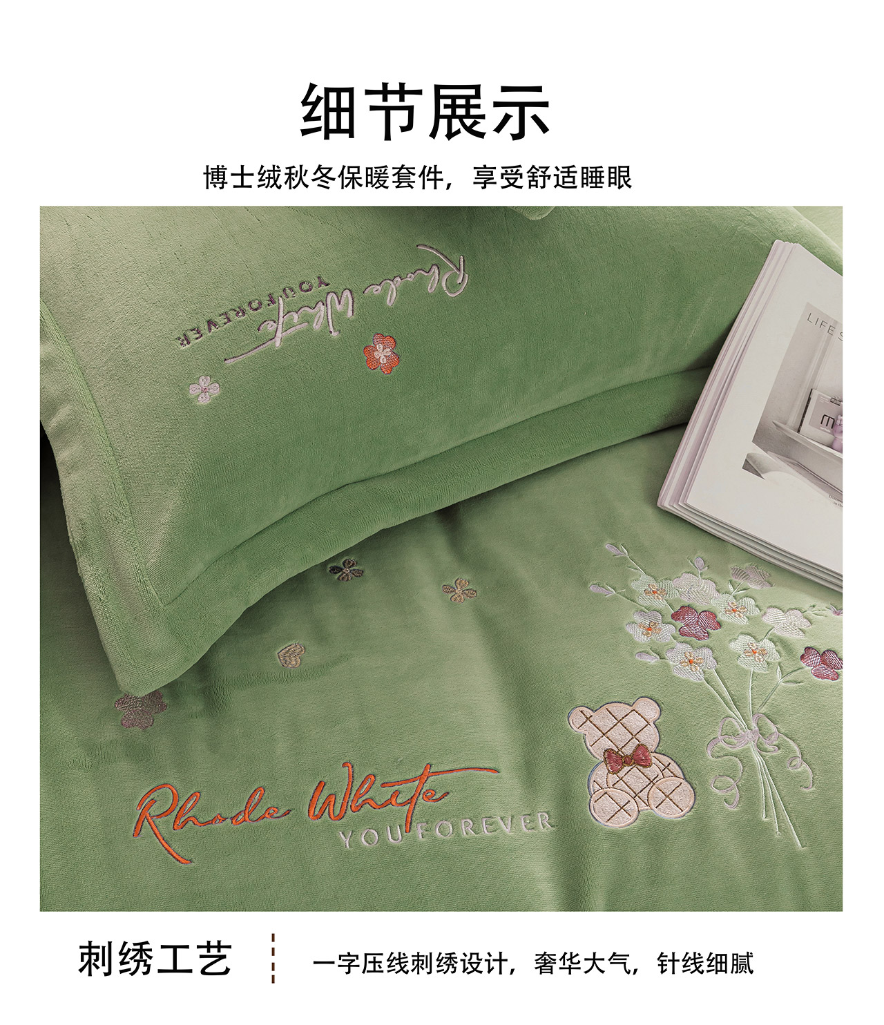 (总)绒博士 2025新款270克牛奶绒双拼角刺绣宽边款四件套--维也纳系列,维也纳-粉豆沙,维也纳-果绿,维也纳-浅咖,维也纳-浅蓝
