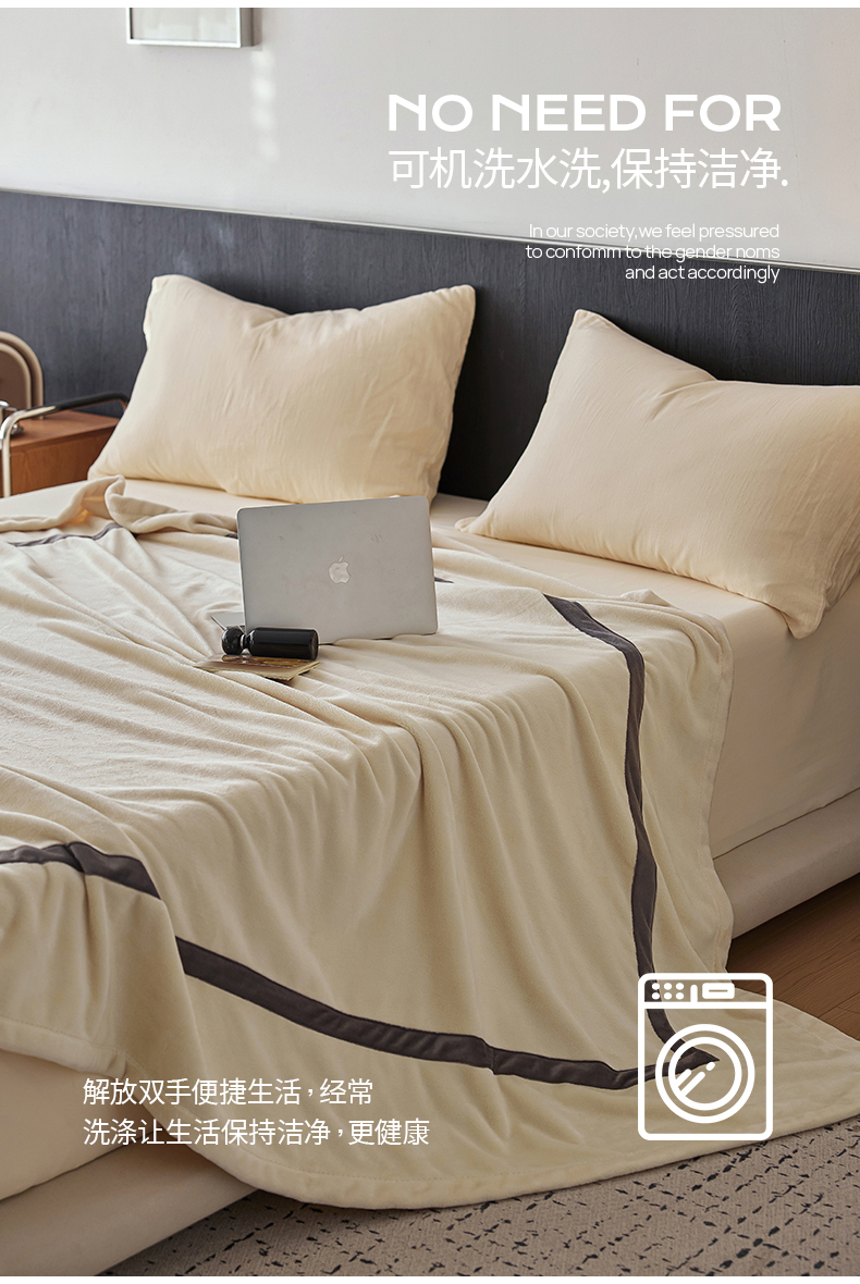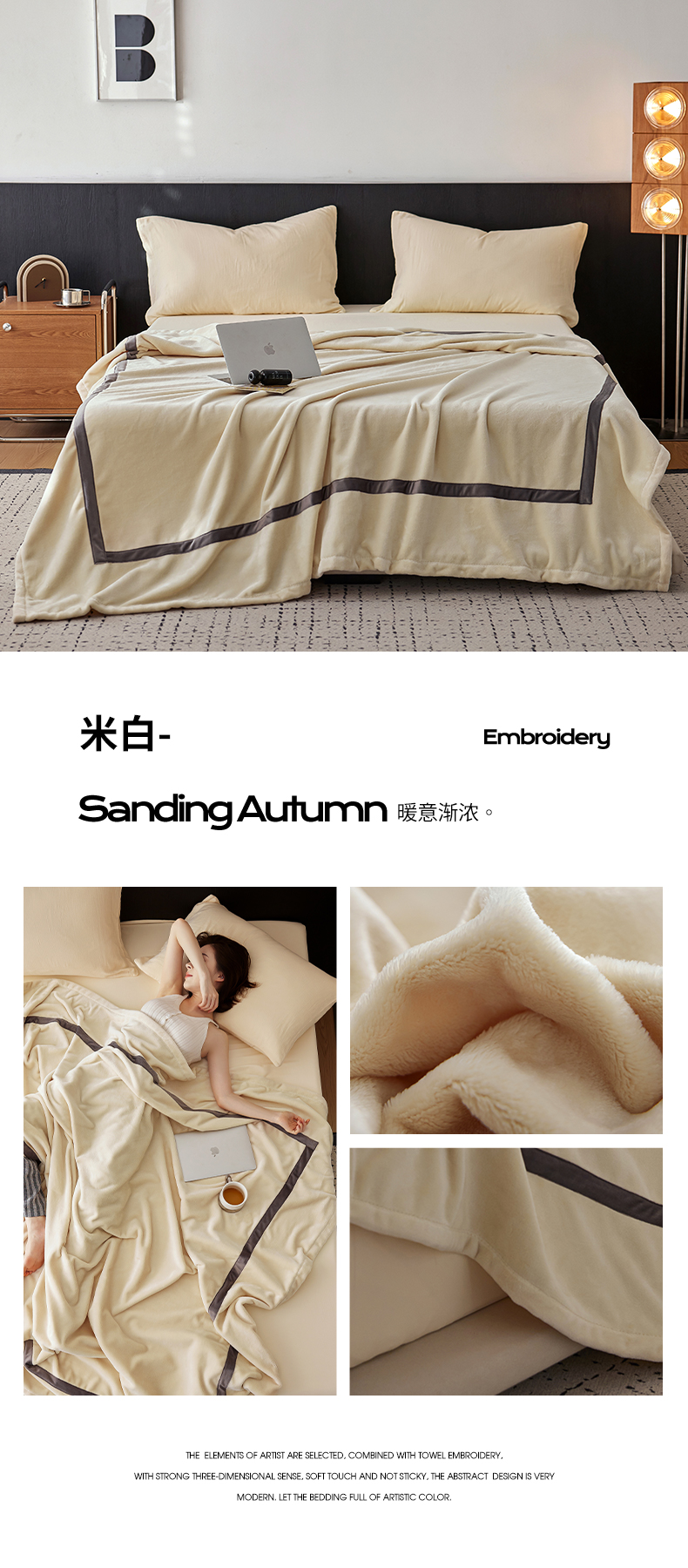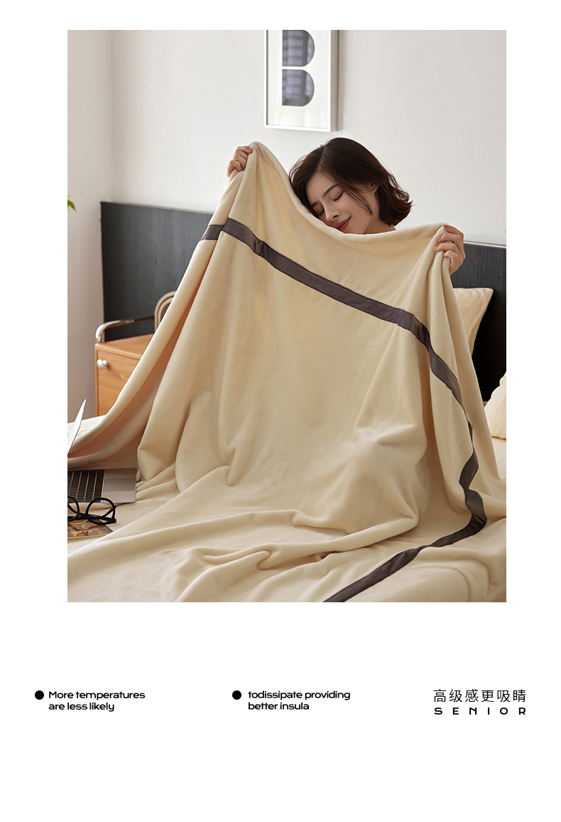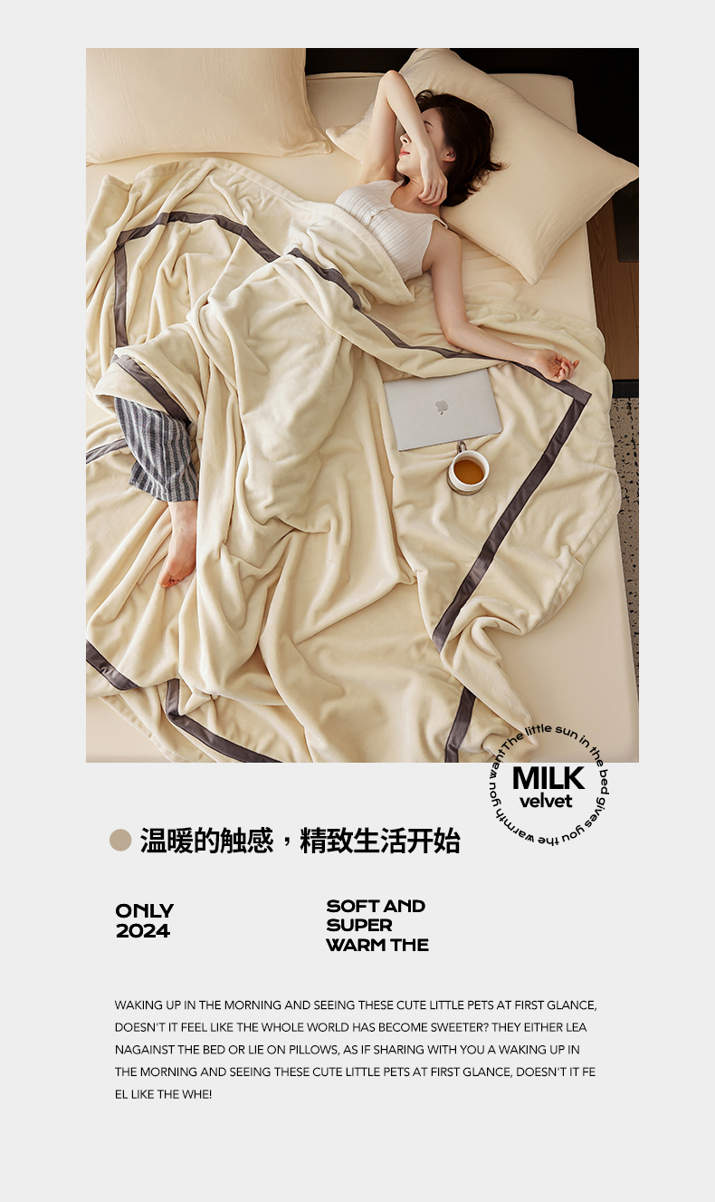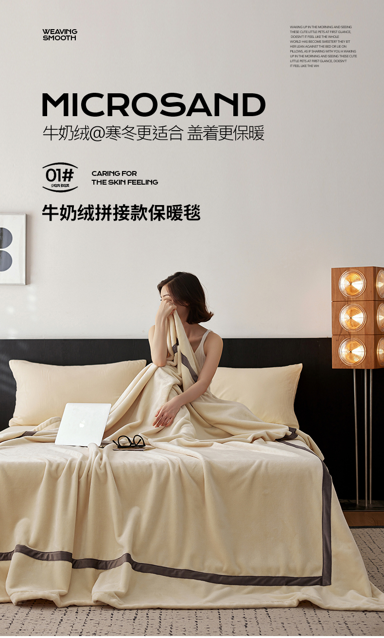 铭动家纺 2024新款牛奶绒拼接款纯色保暖毯 米白