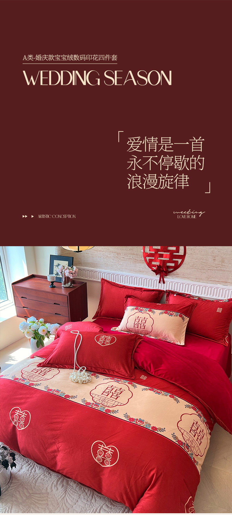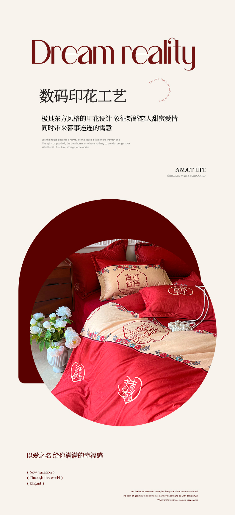慕希家纺 2024新款A类婚庆款宝宝绒数码印花四件套 花嫁喜事