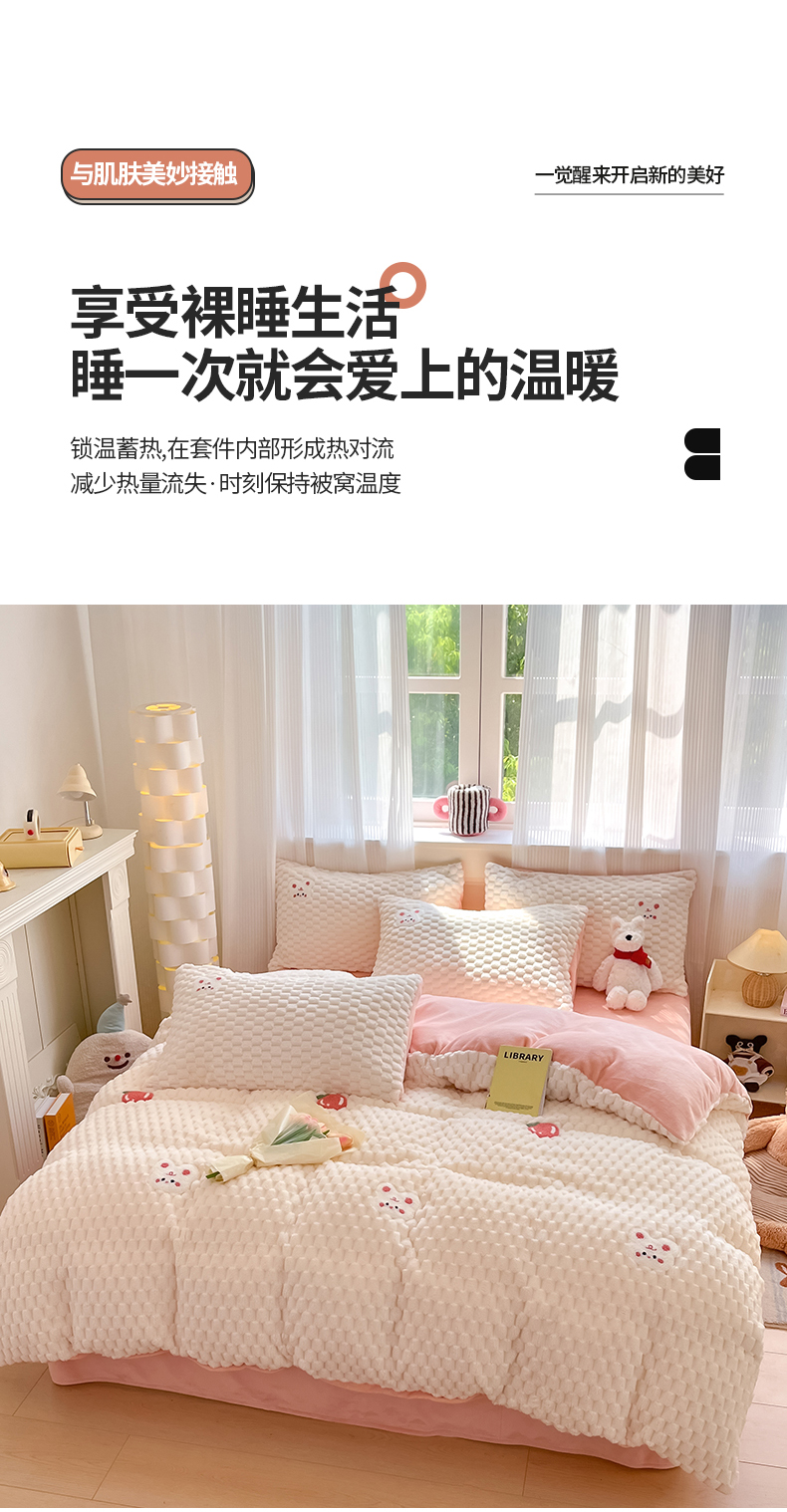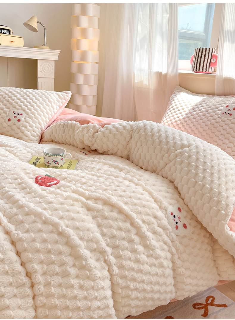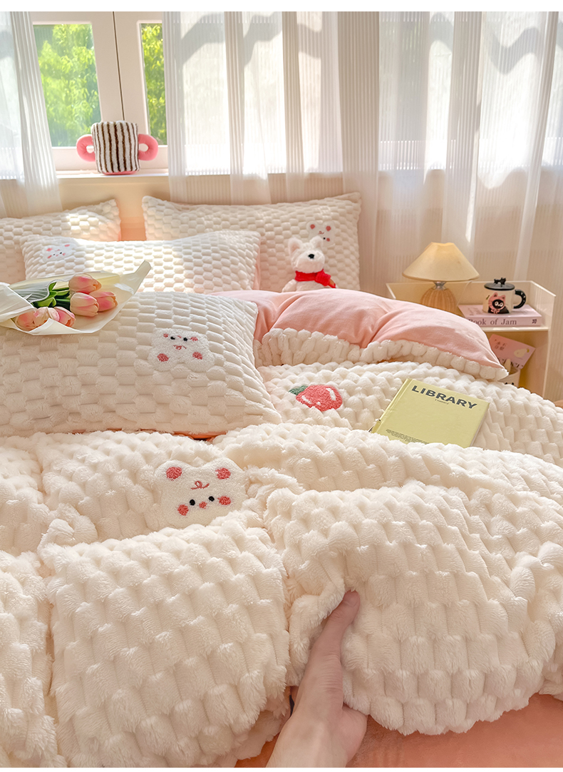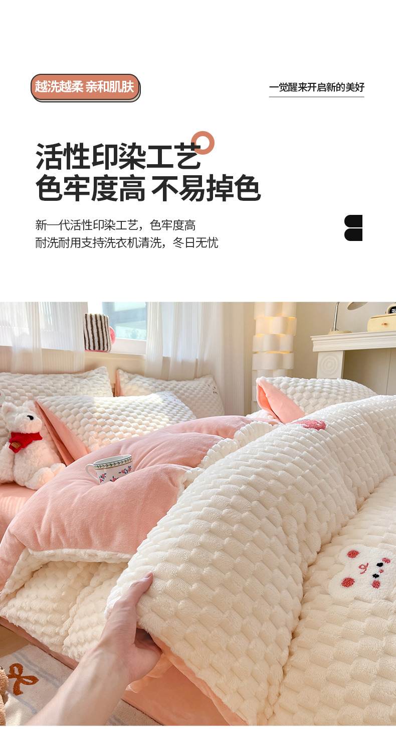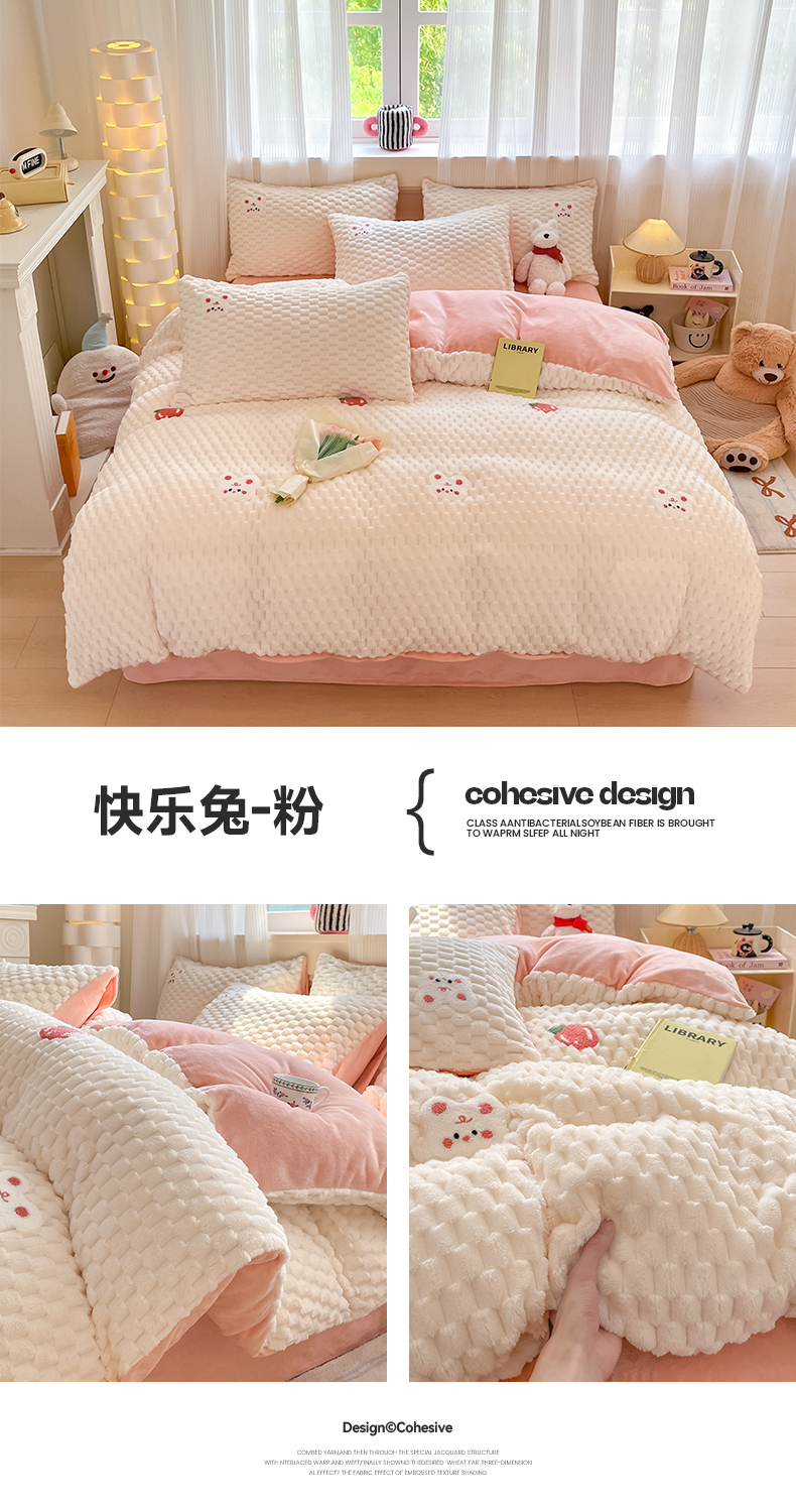 商品名称:澳梵家居 2024新款小清新豆豆绒牛奶绒毛巾绣四件套 快乐兔-粉