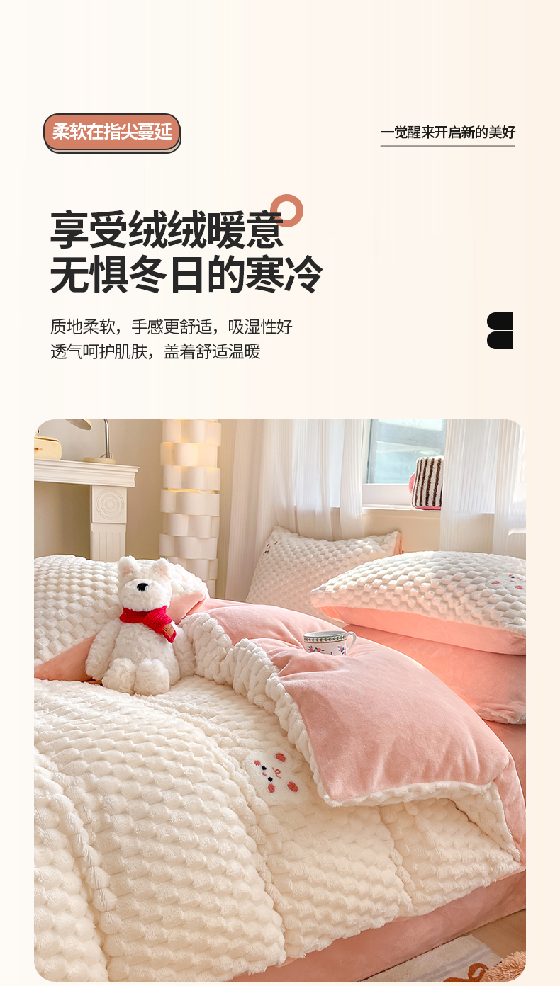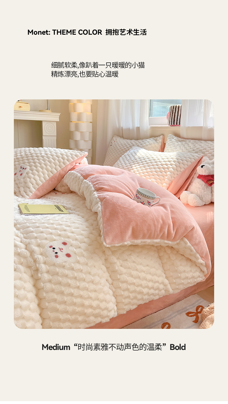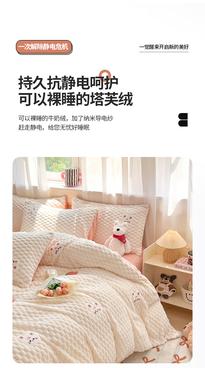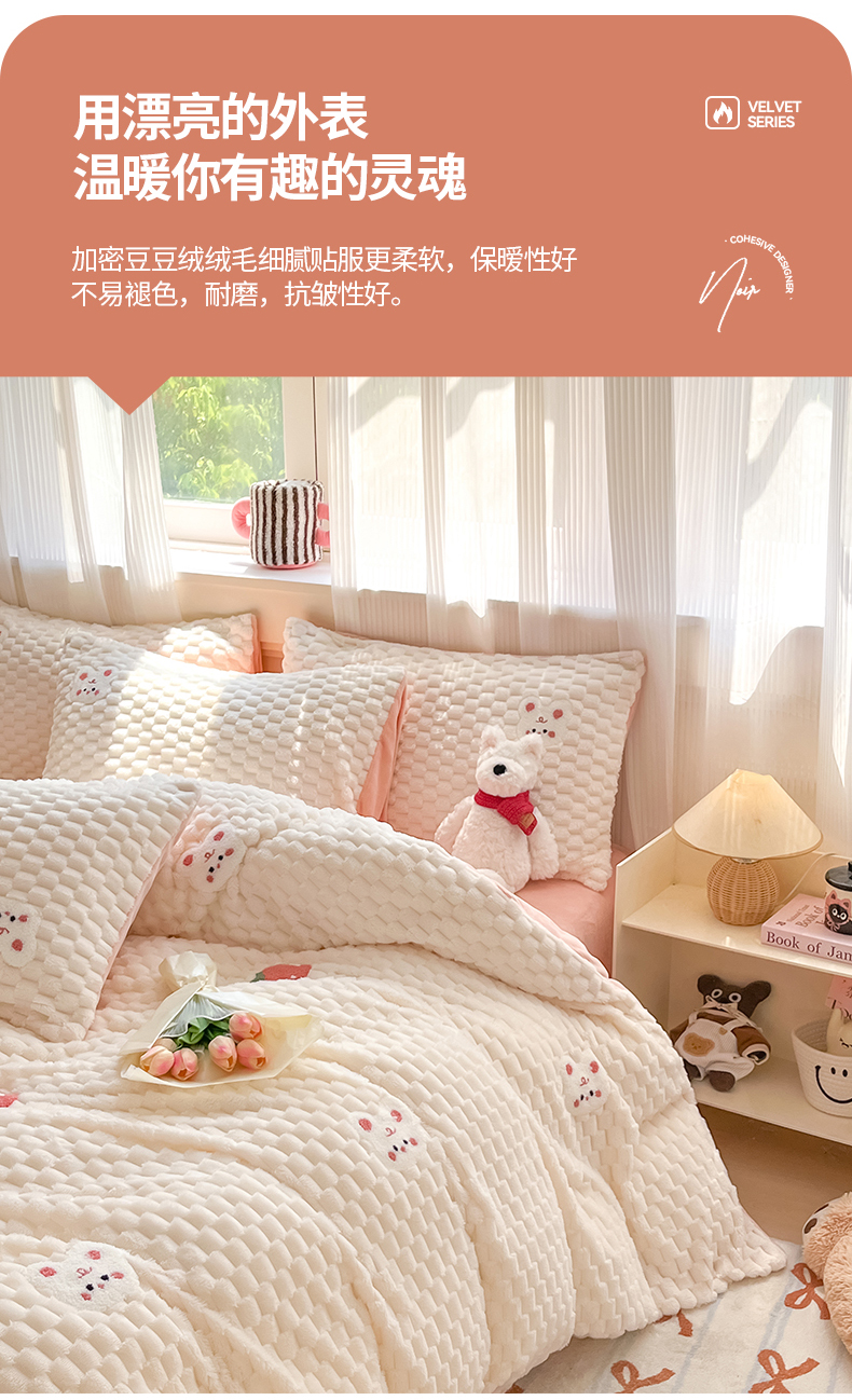 商品名称:澳梵家居 2024新款小清新豆豆绒牛奶绒毛巾绣四件套 快乐兔-粉
