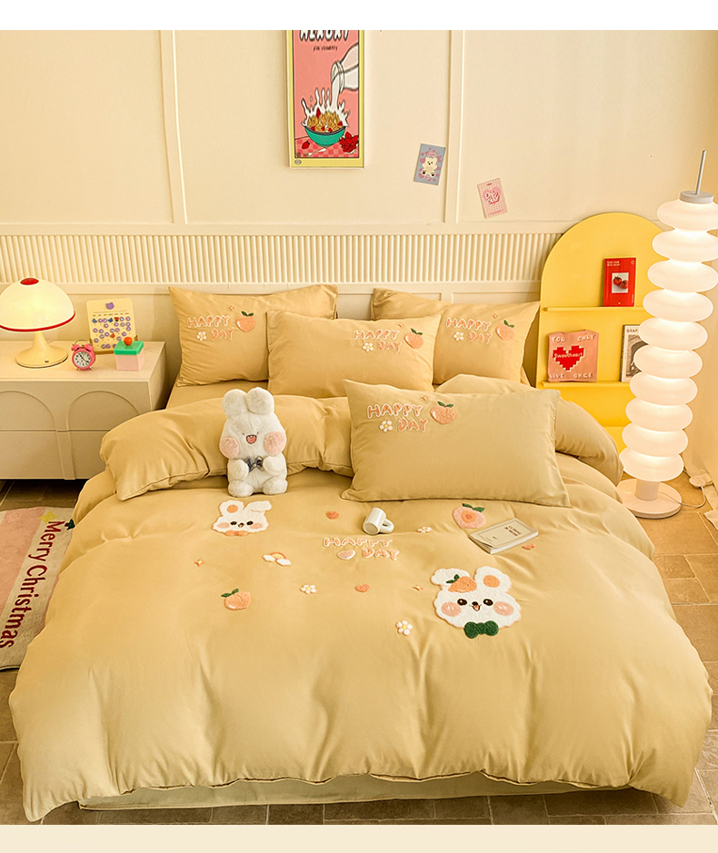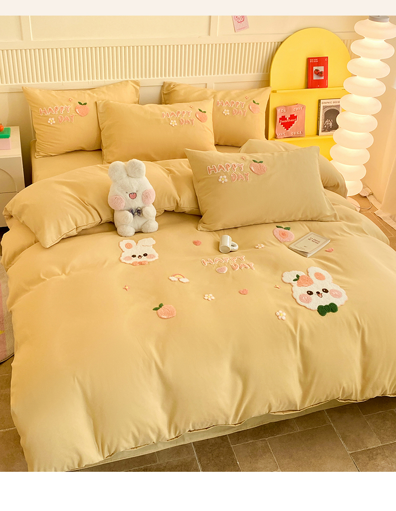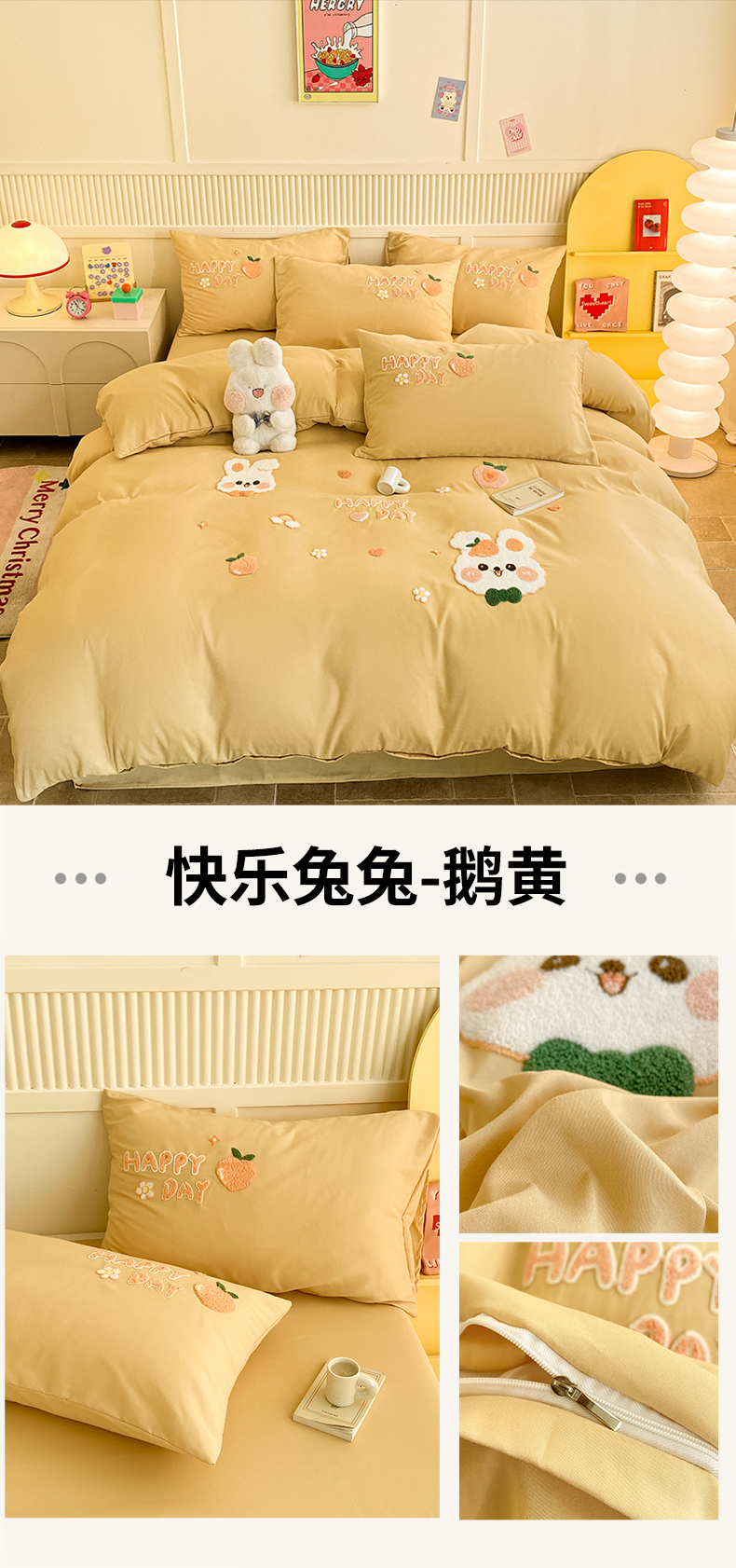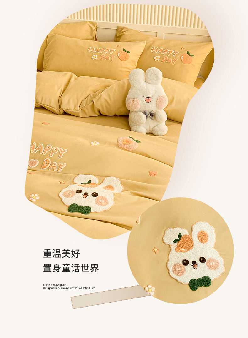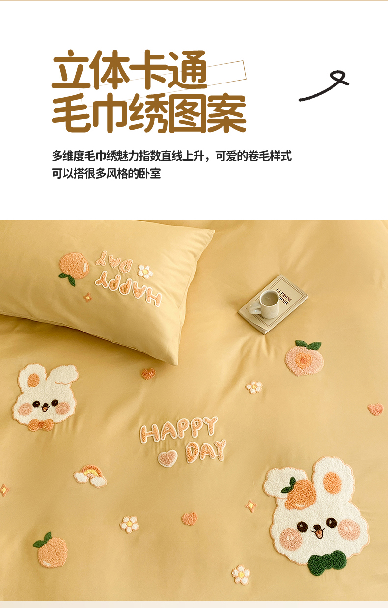 当前位置: 91家纺网 > 商品网购 > 床品套件 > 四件套 > 水洗棉四件套 > 一左一右 2024新款亲肤磨毛水洗棉立体毛巾绣花卡通四件套儿童学生三件套床笠(提供买家秀) 快乐兔兔-鹅黄