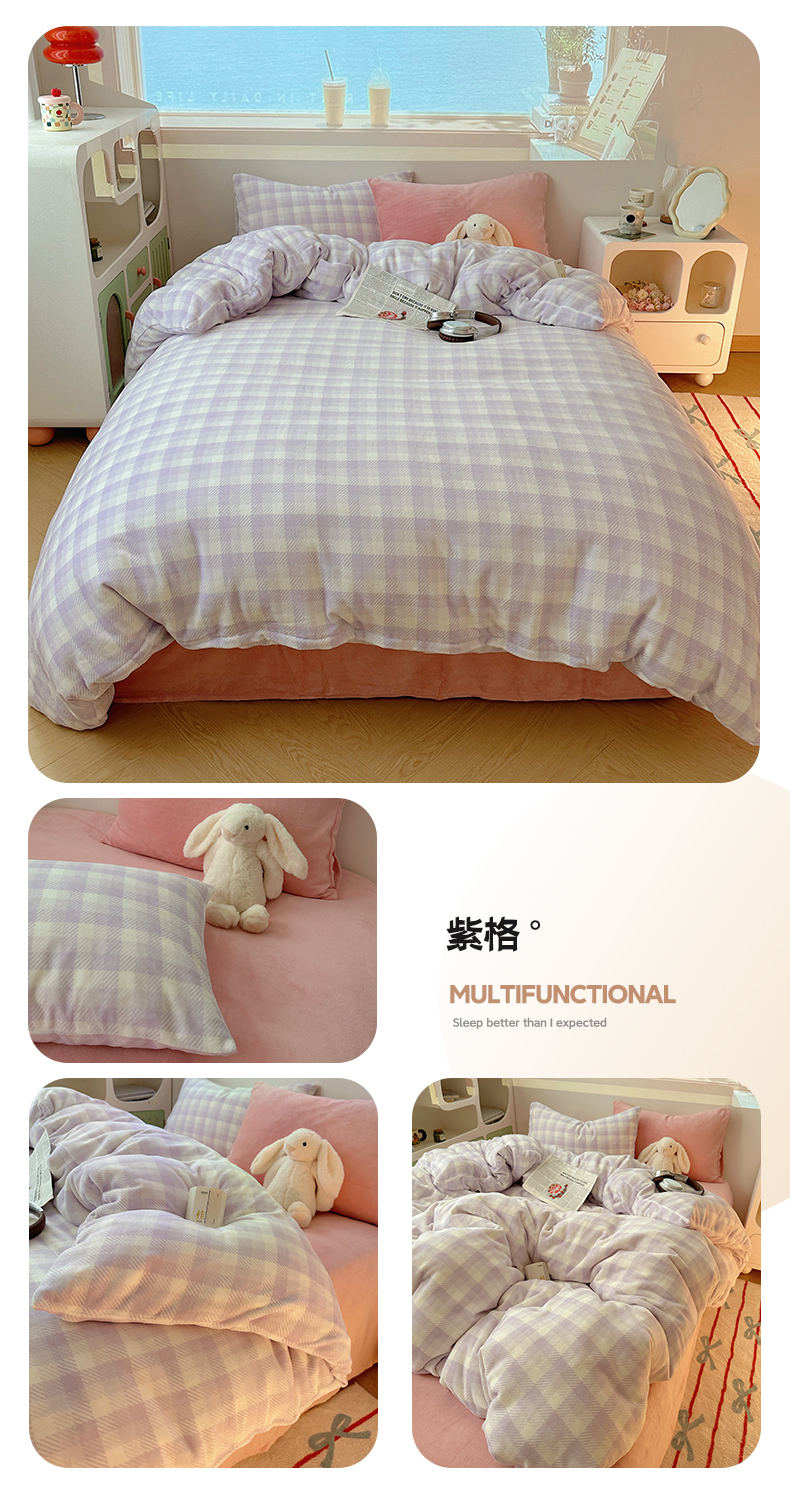 美乐迪家纺 2024新款牛奶绒格子四件套系列 紫格