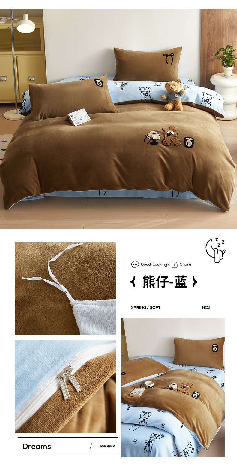 商品名称:怡家居 2024新款简约印花加绣花牛奶绒毛巾绣四件套 熊仔-蓝