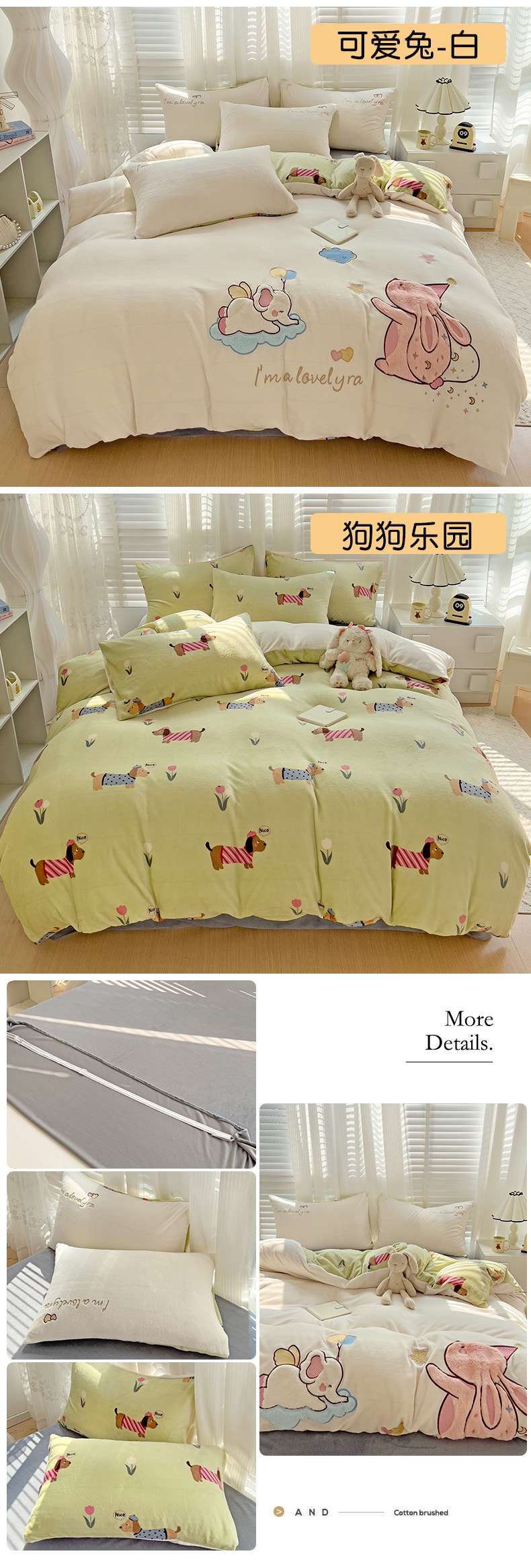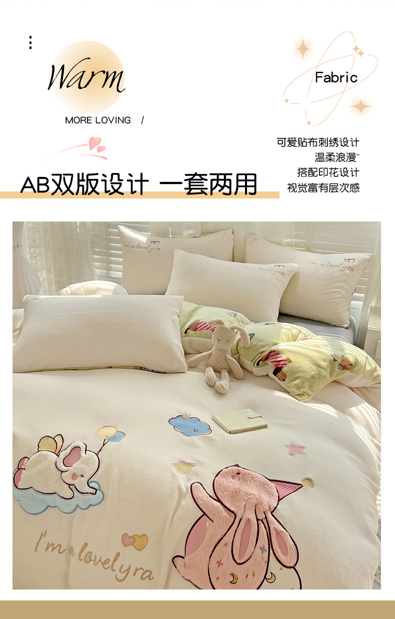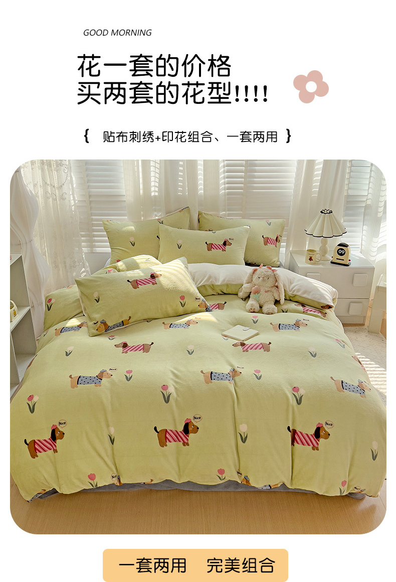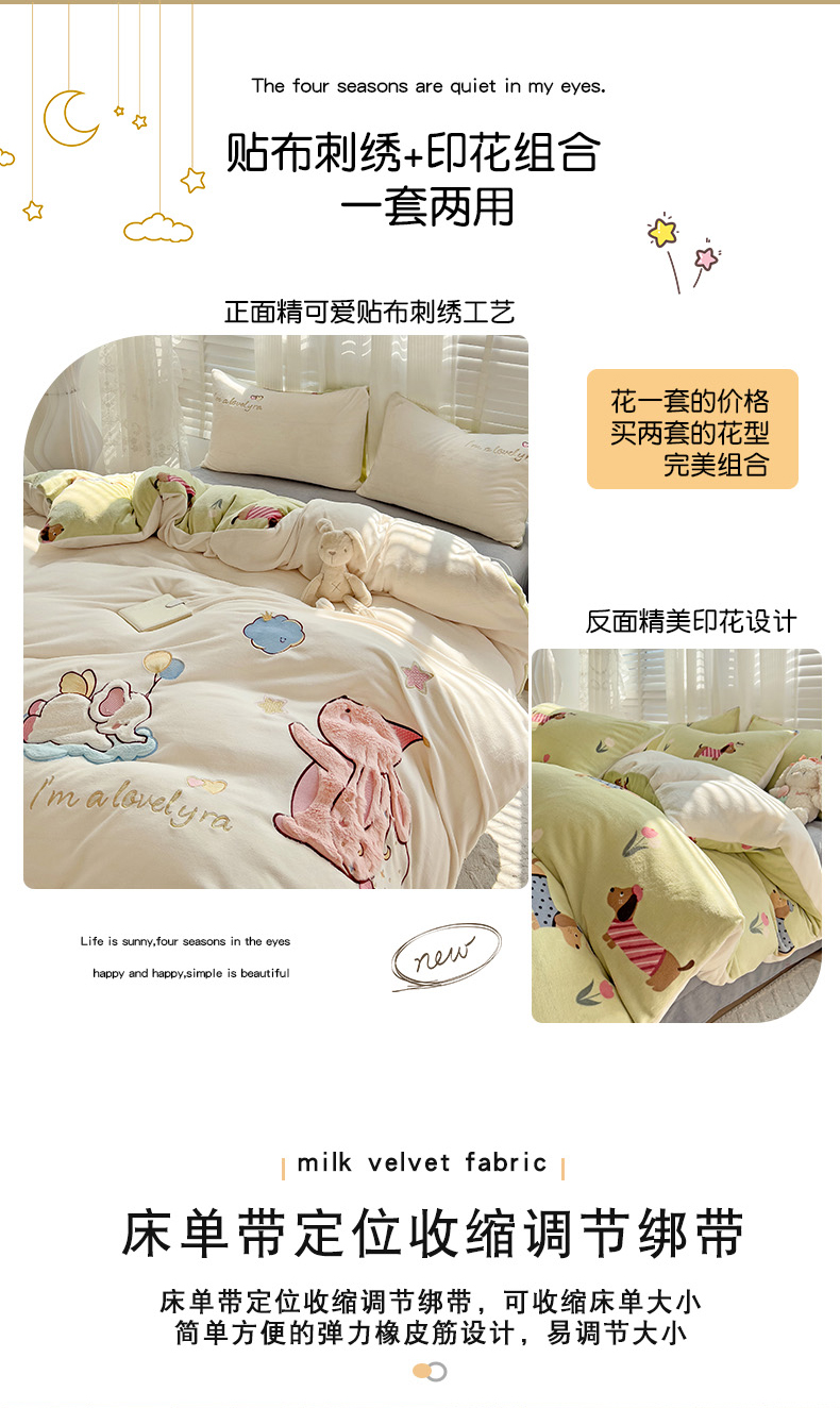 当前位置: 91家纺网 > 商品网购 > 床品套件 > 四件套 > 牛奶绒四件套 > 2024新款一套两款式加厚牛奶绒贴布刺绣加印花四件套 可爱兔-白贴布绣-狗狗乐园印花